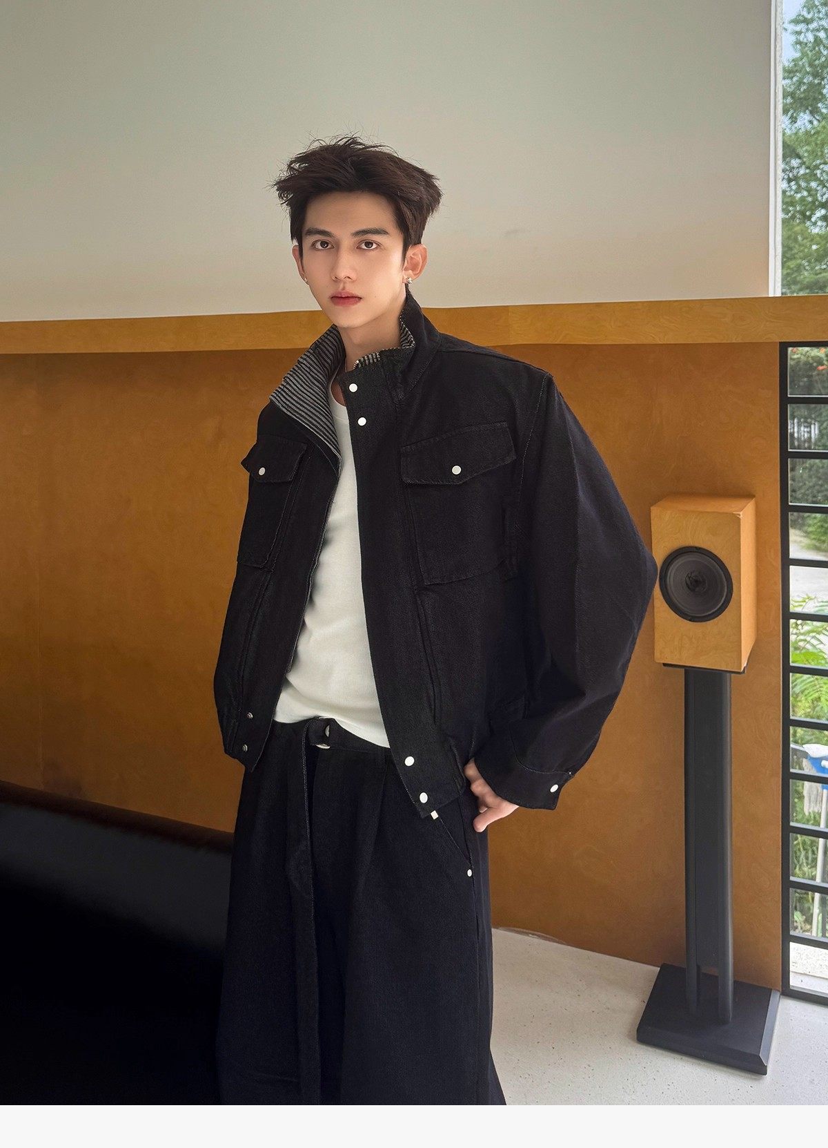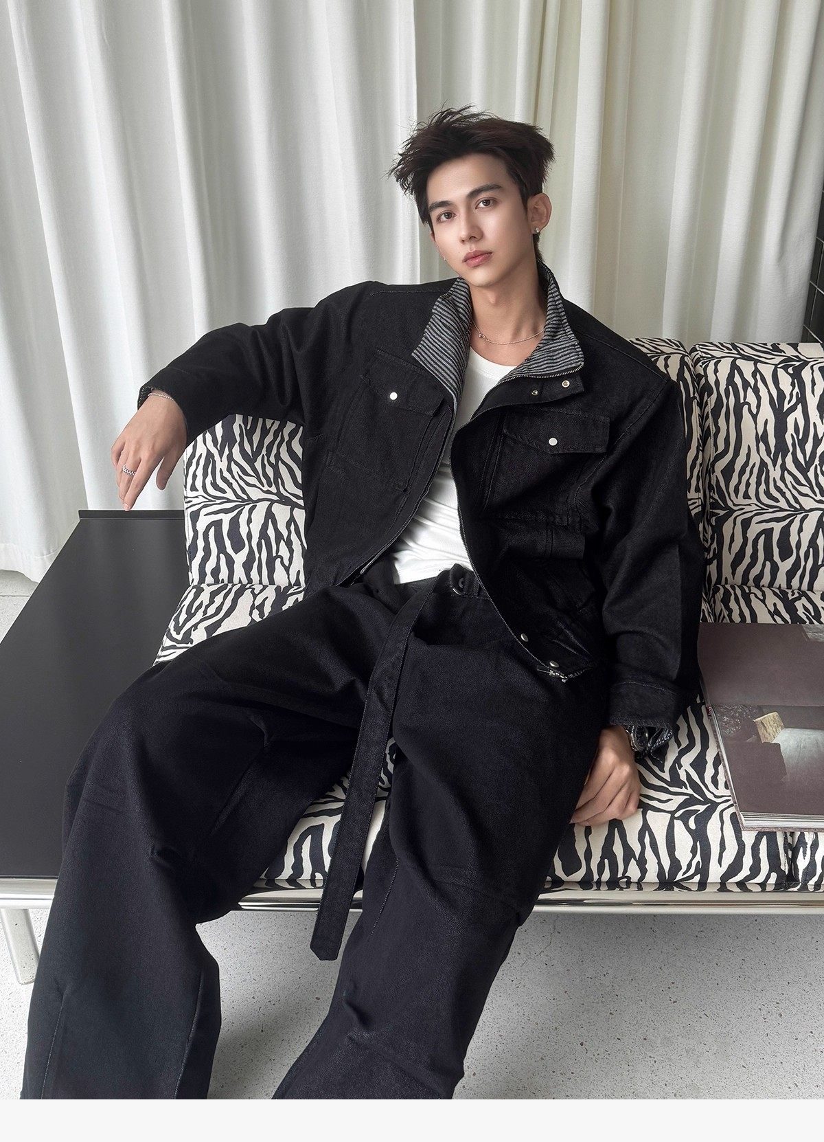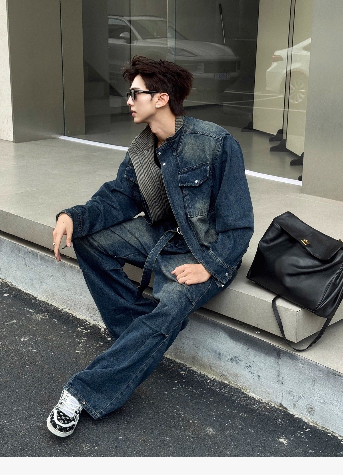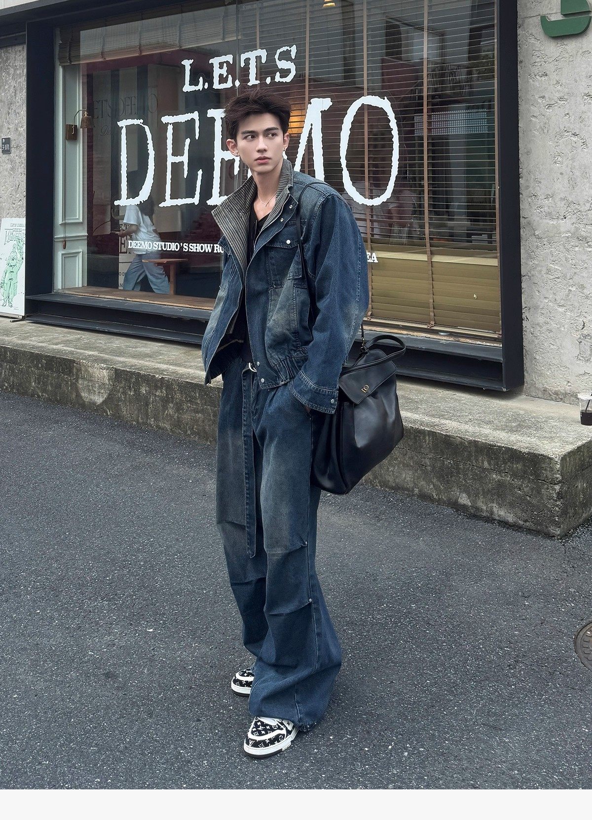 水洗做舊重工假兩件牛仔外套男潮流痞帥立領短款寬鬆工裝夾克上衣