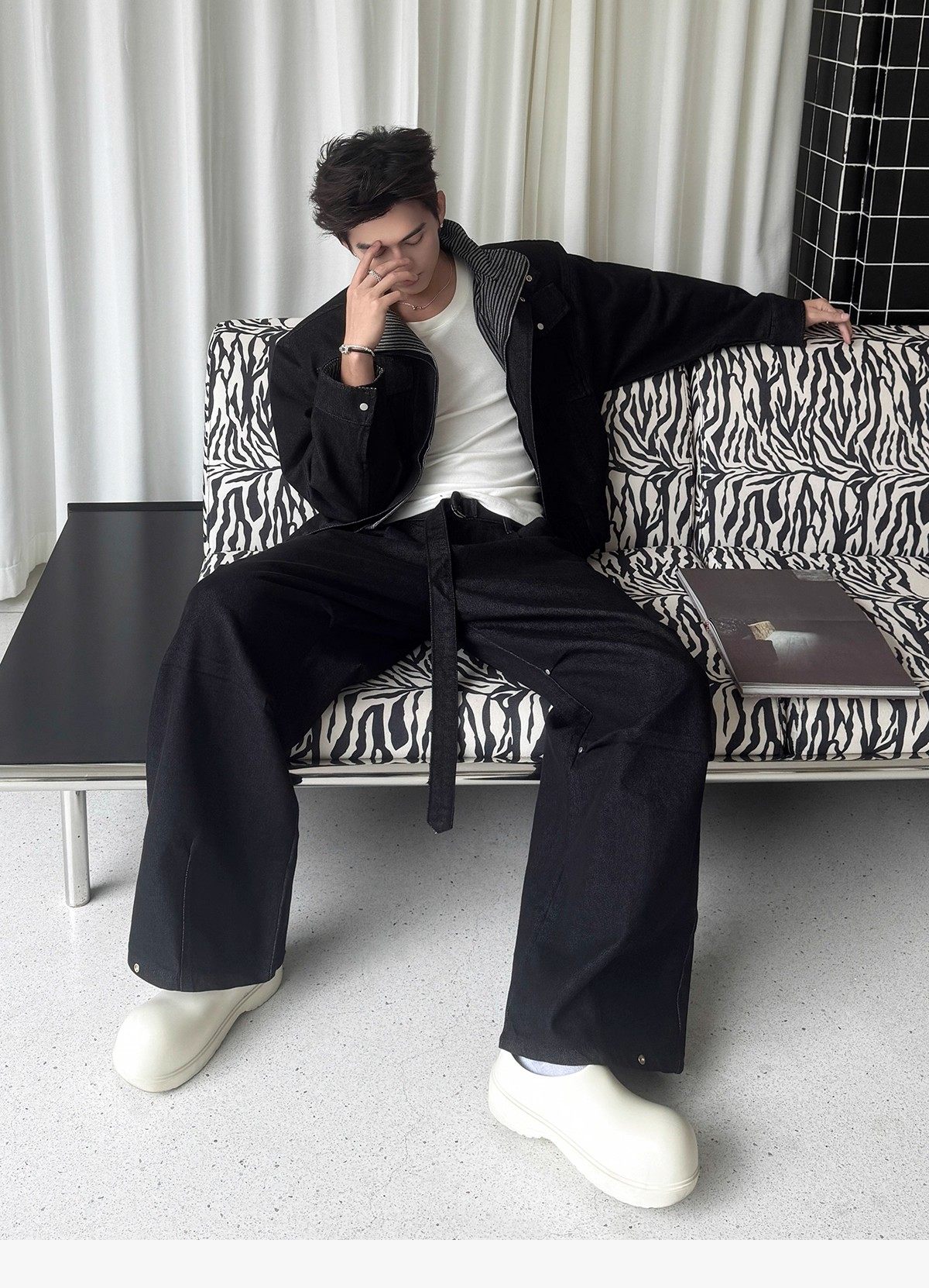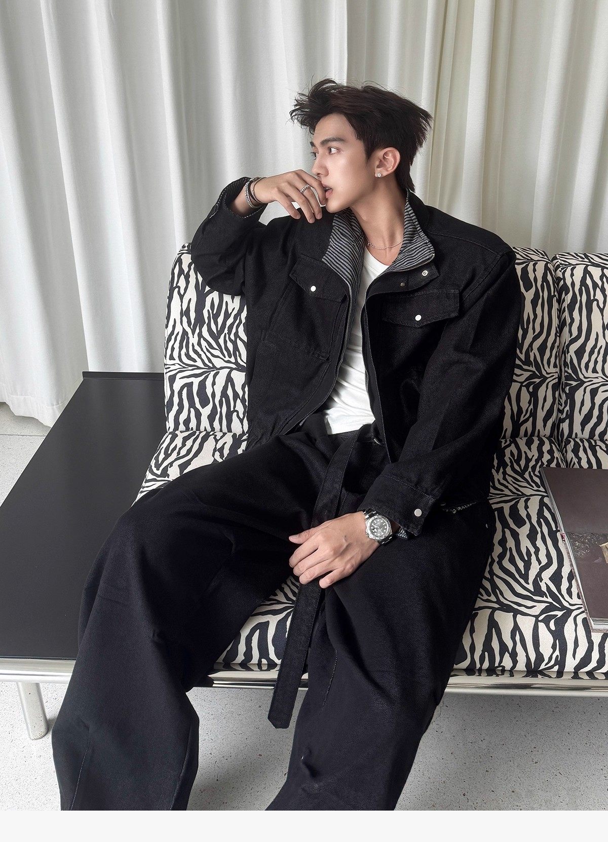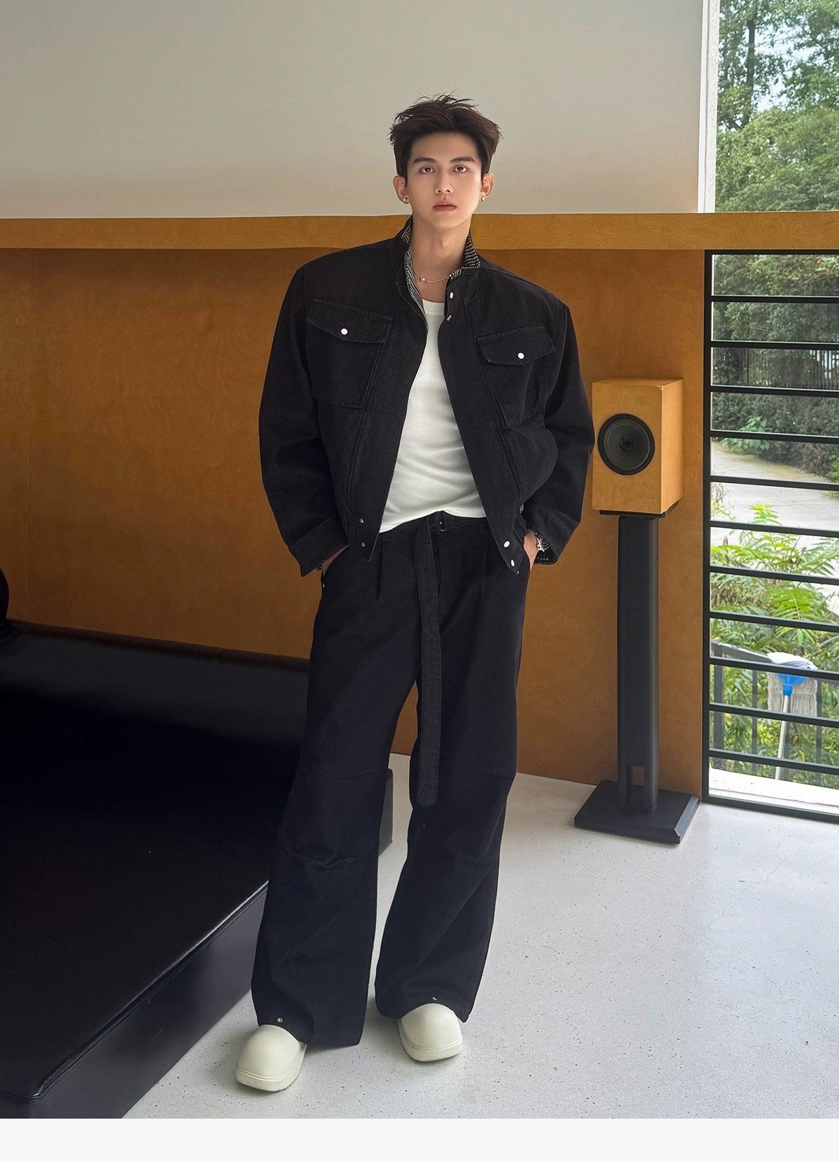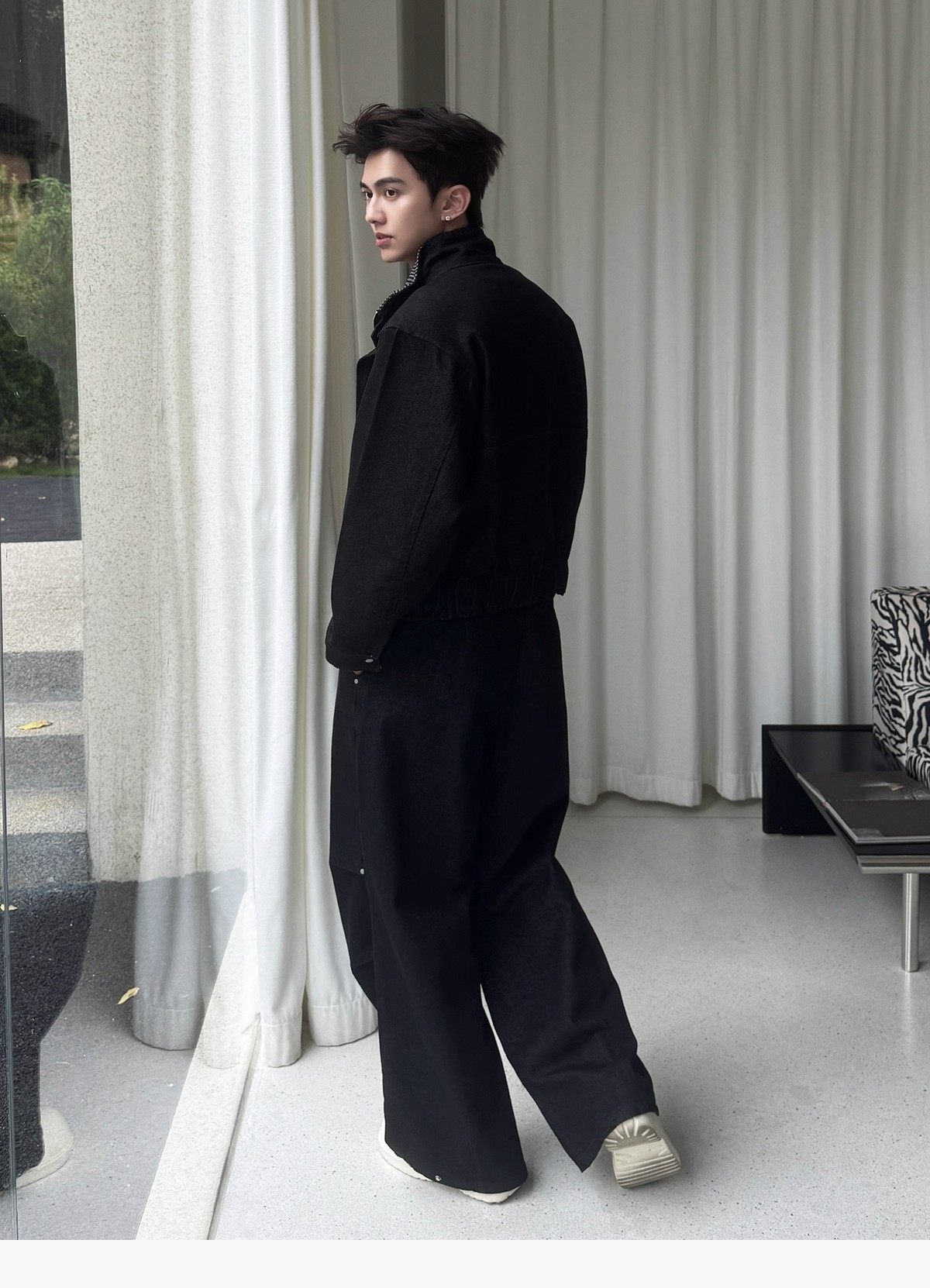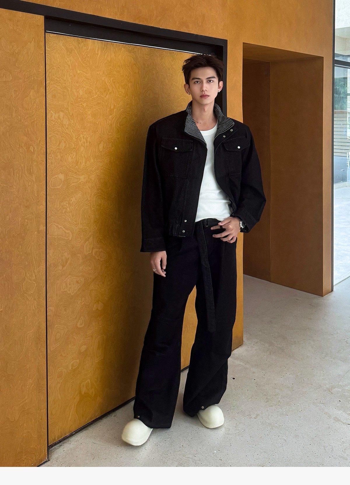 水洗做舊重工假兩件牛仔外套男潮流痞帥立領短款寬鬆工裝夾克上衣
