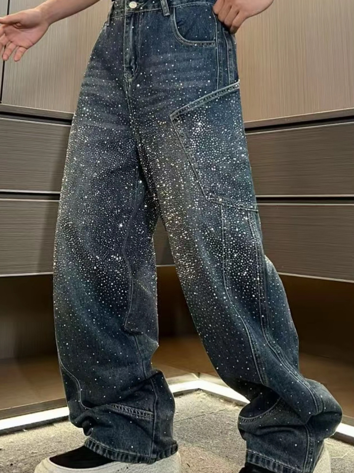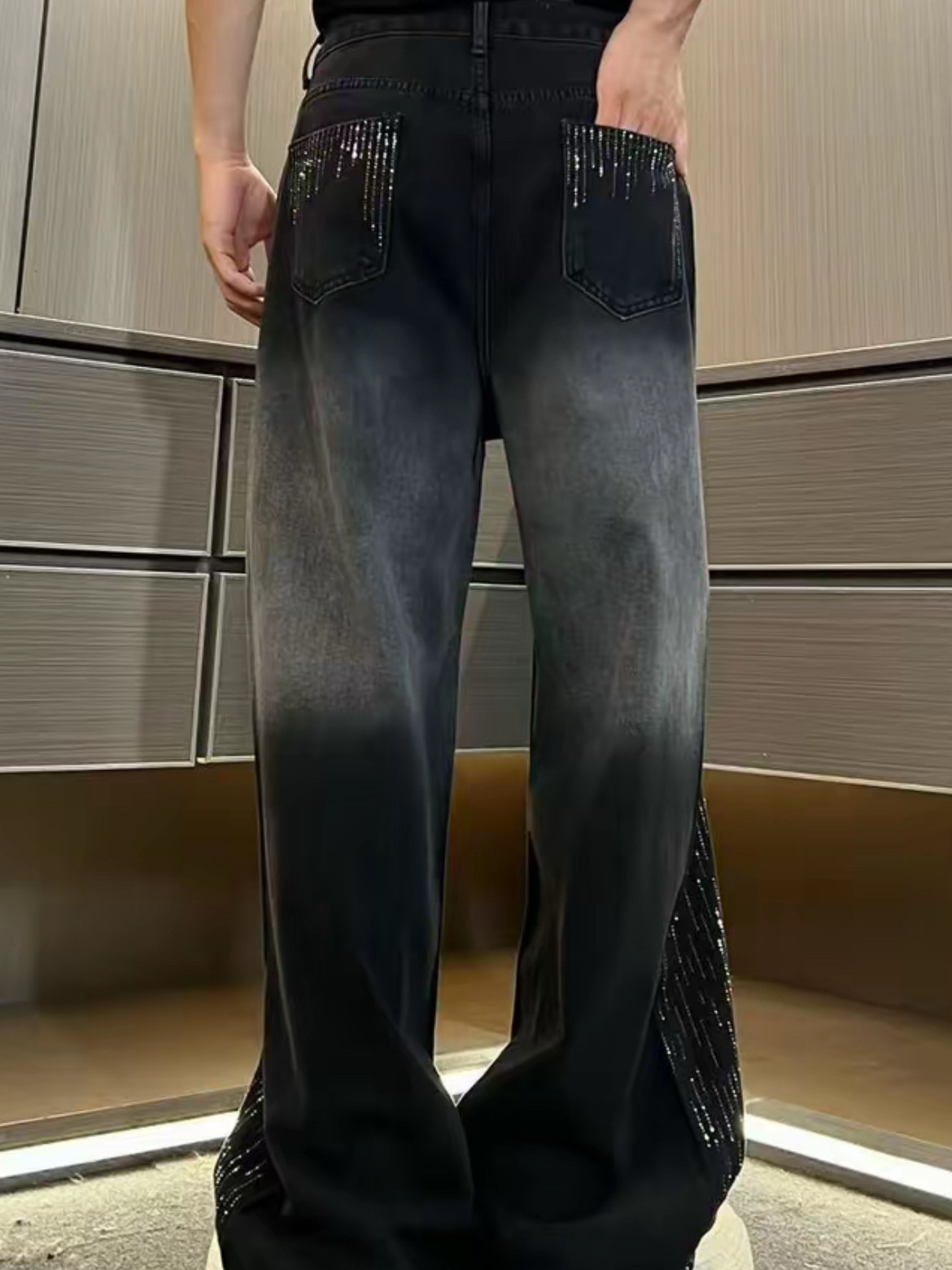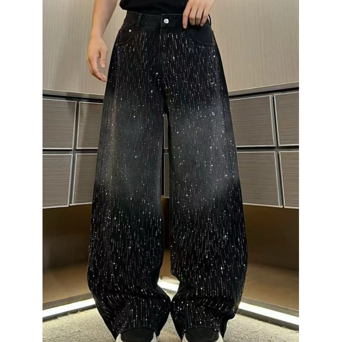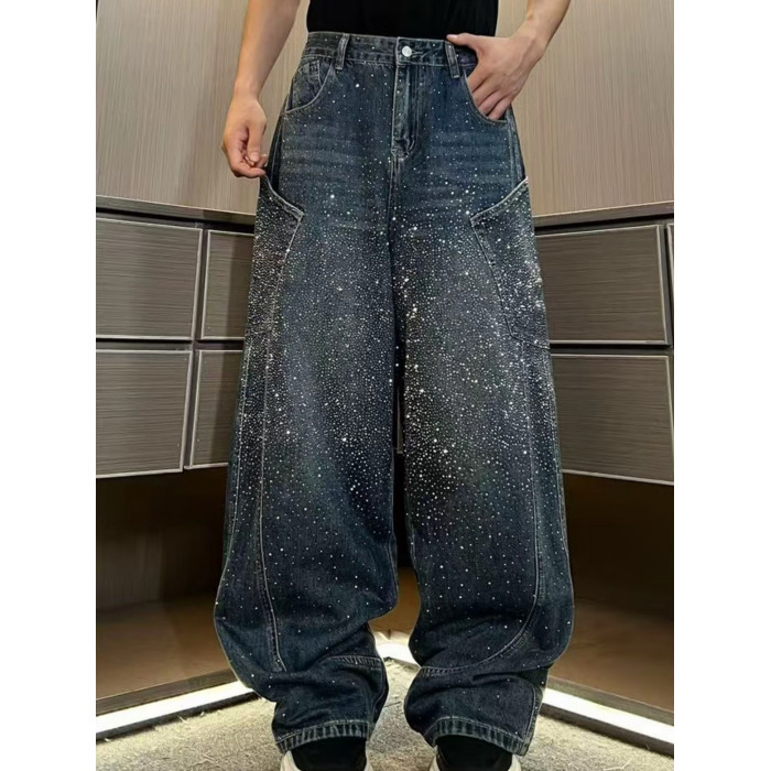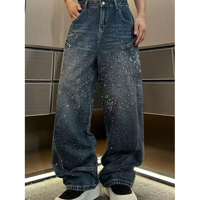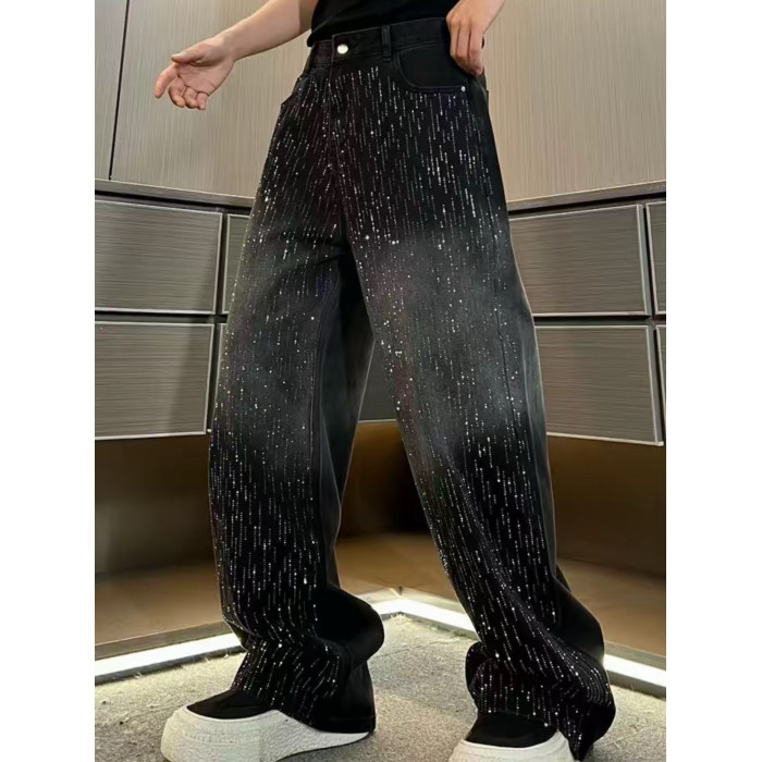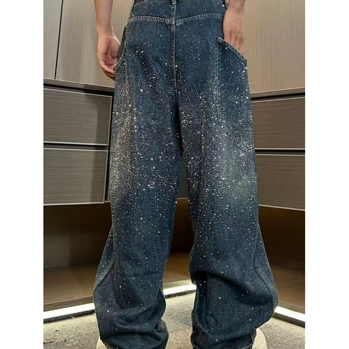 潮牌重工水洗漸變高貨滿鑽爆閃立體彎刀牛仔褲寬鬆休閒輕奢直筒褲