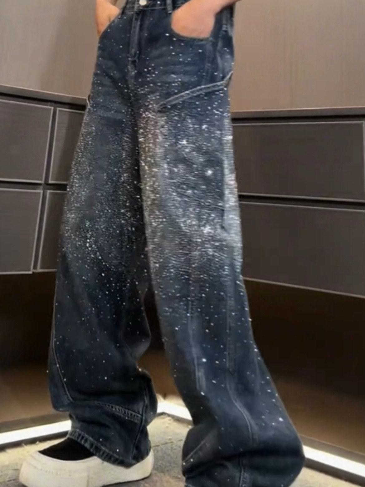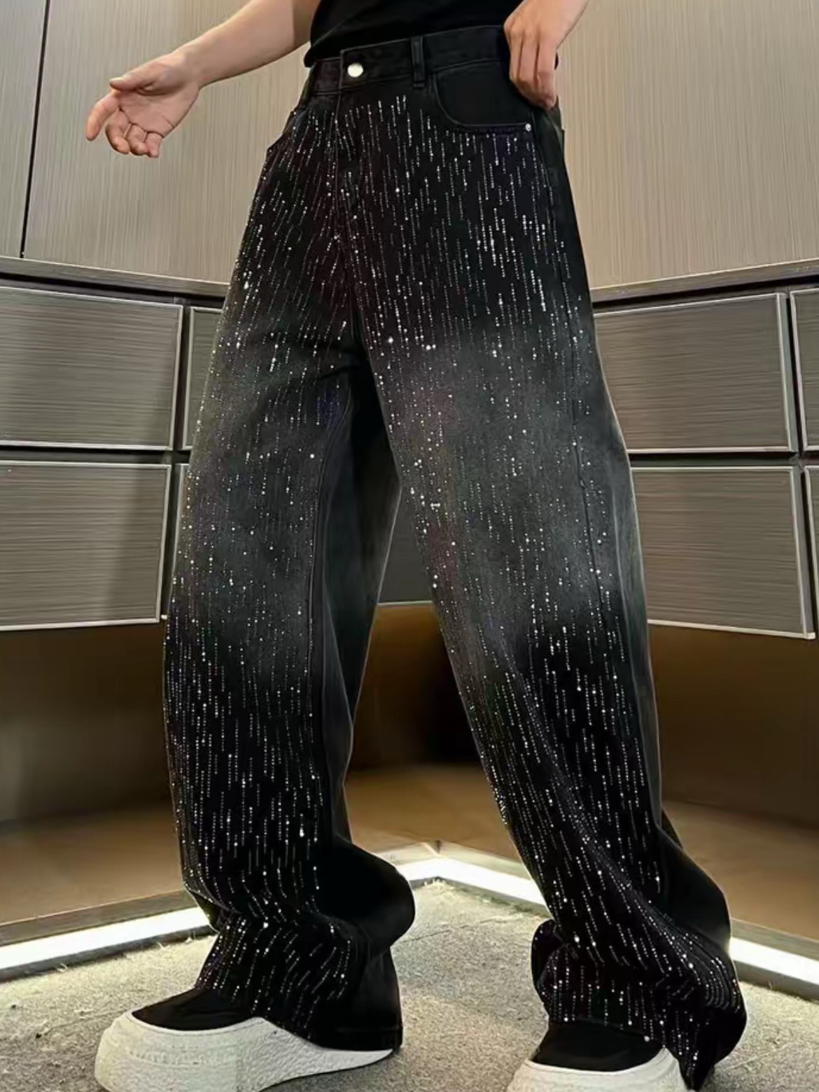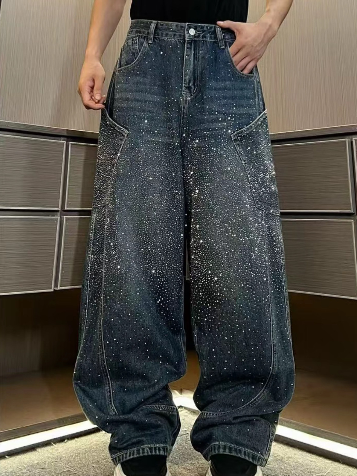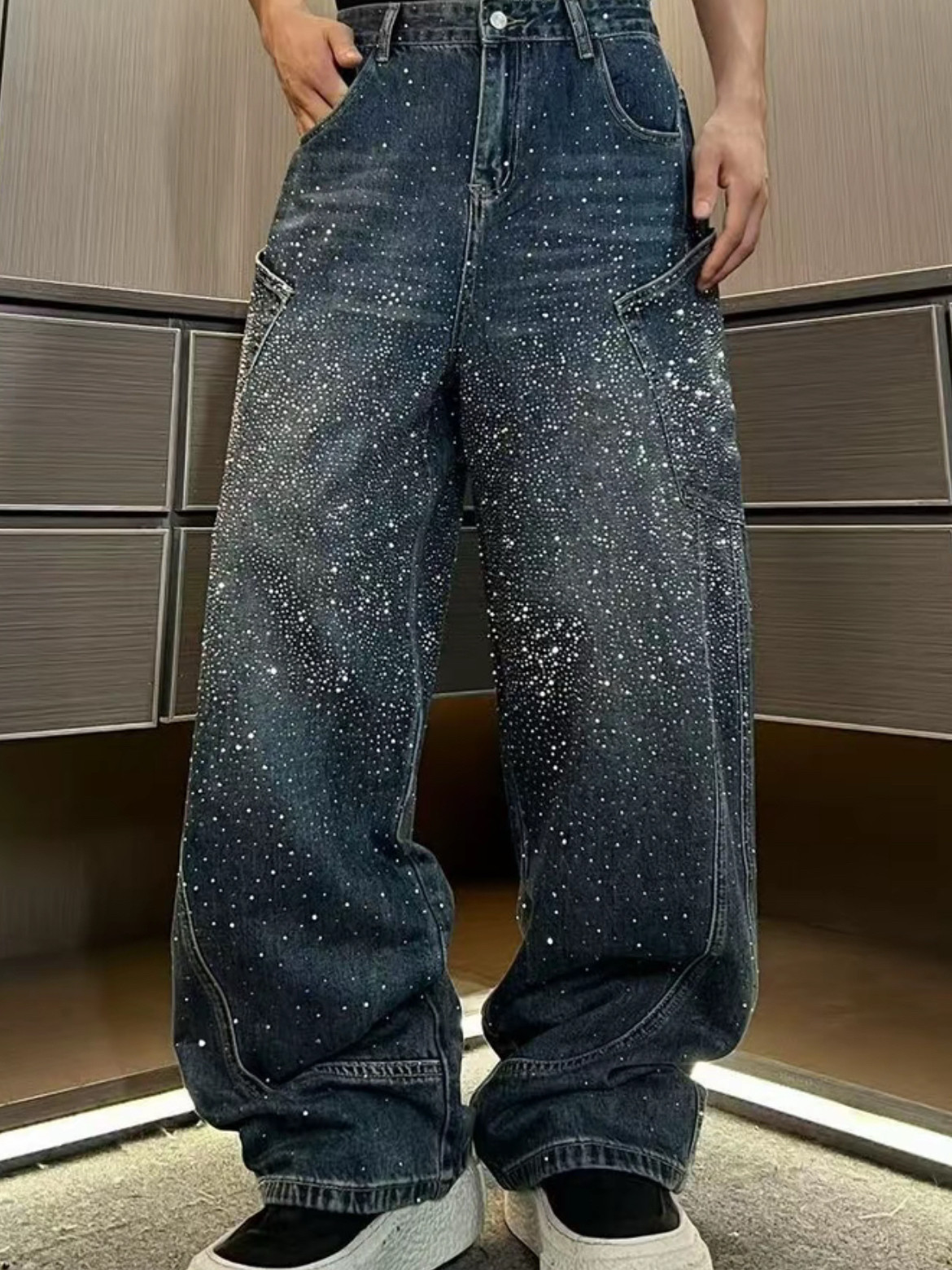 潮牌重工水洗漸變高貨滿鑽爆閃立體彎刀牛仔褲寬鬆休閒輕奢直筒褲
