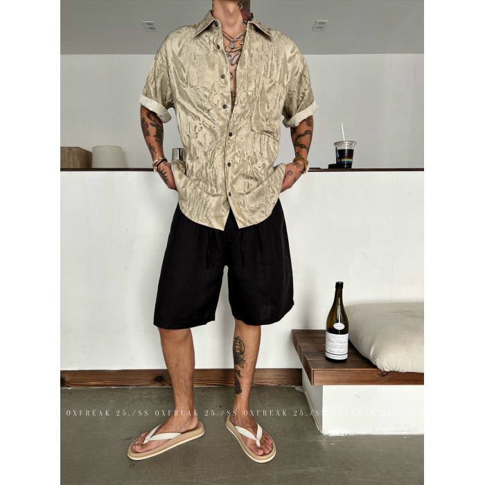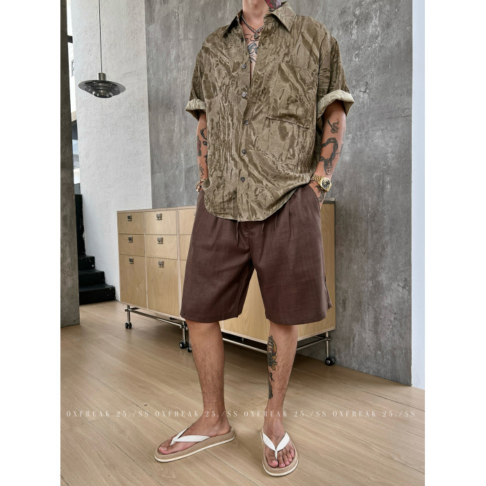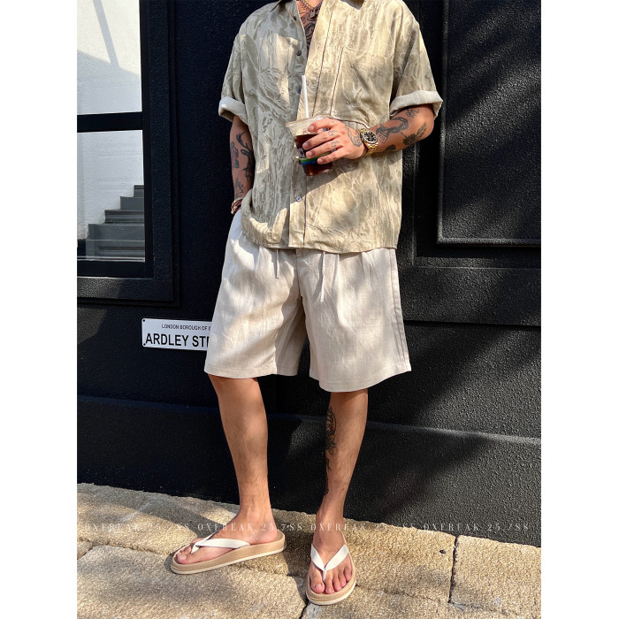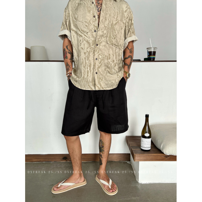 OXFREAK「老錢風 天絲亞麻」純色休閒短褲男薄款直筒寬鬆五分中褲