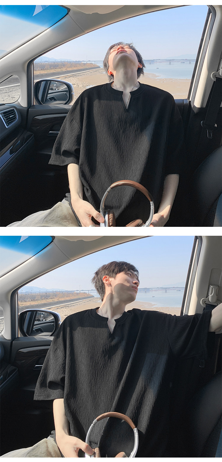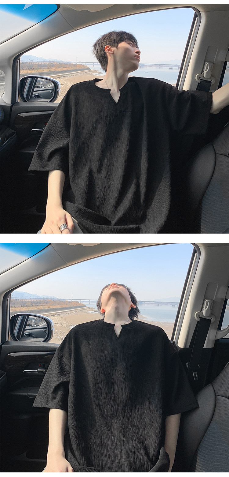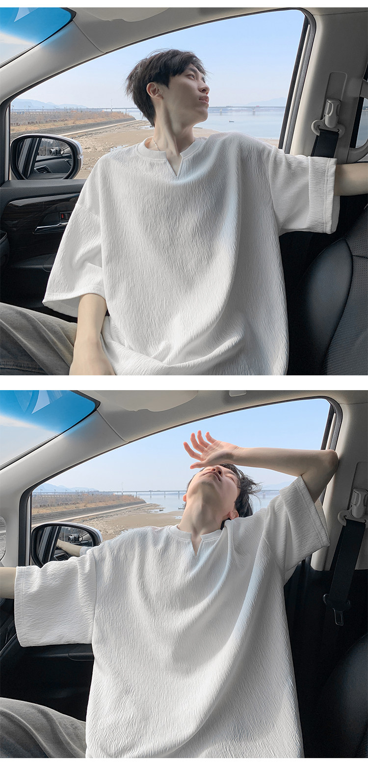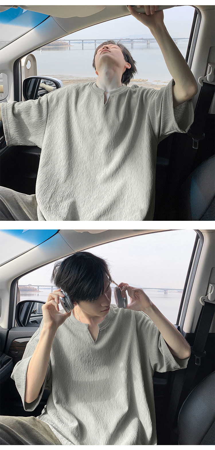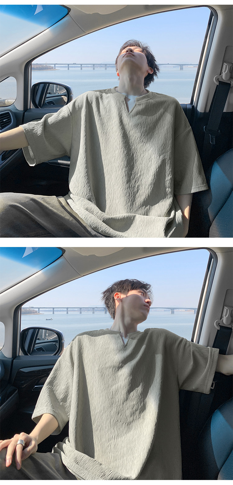 潮牌復古紋理感褶皺短袖T恤男夏季薄款加肥加大碼寬鬆涼感V領體恤