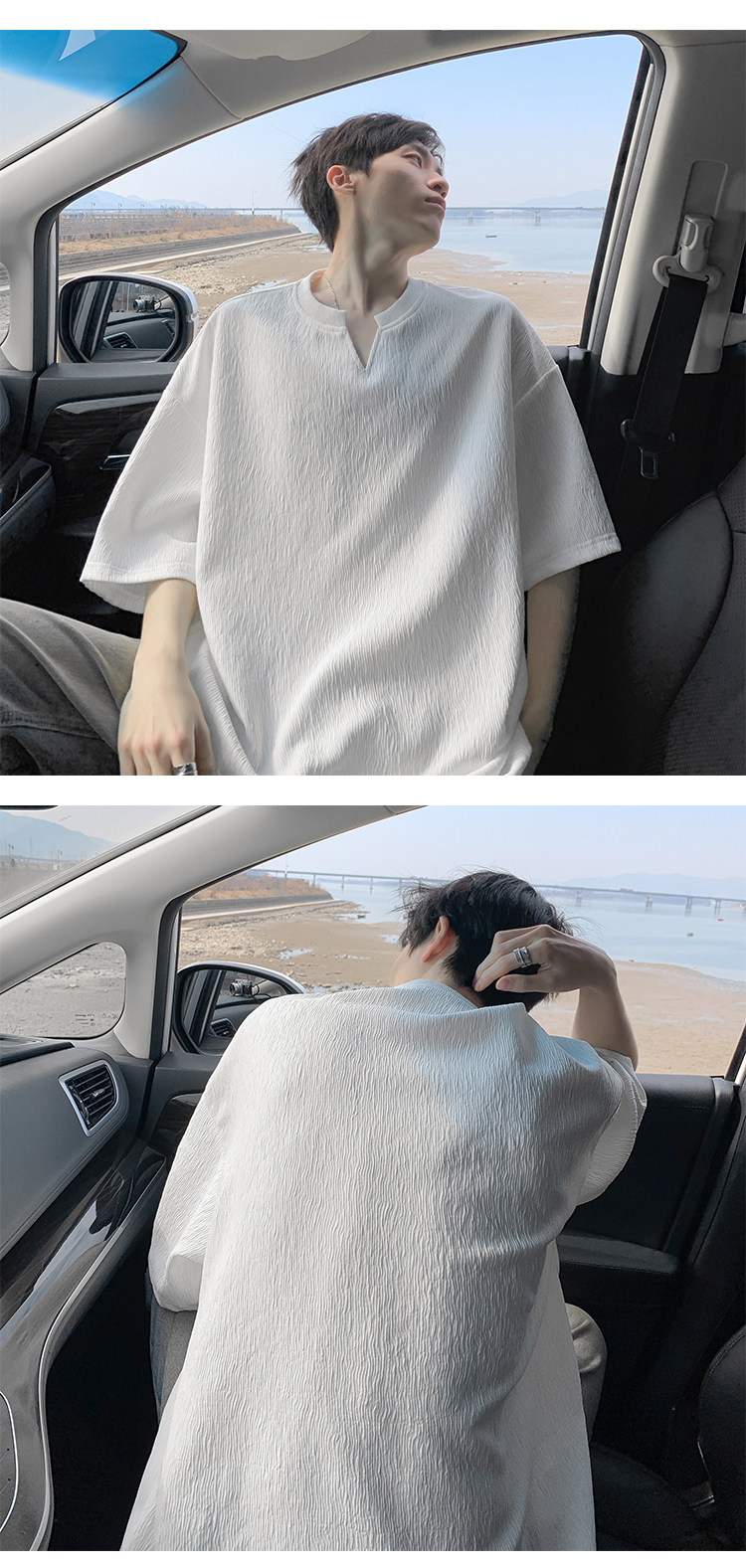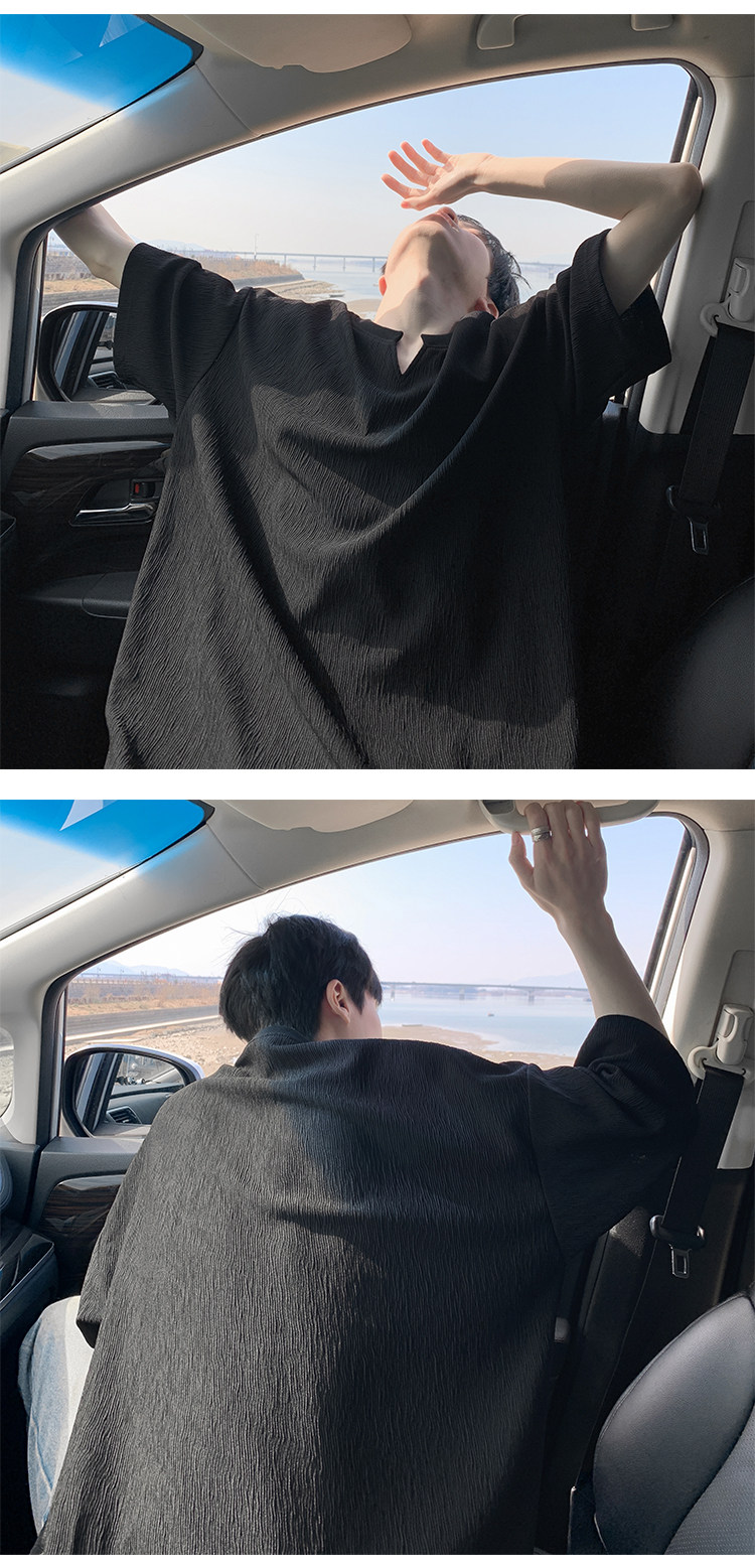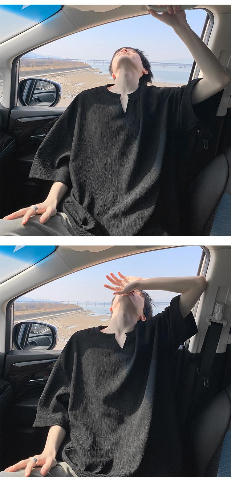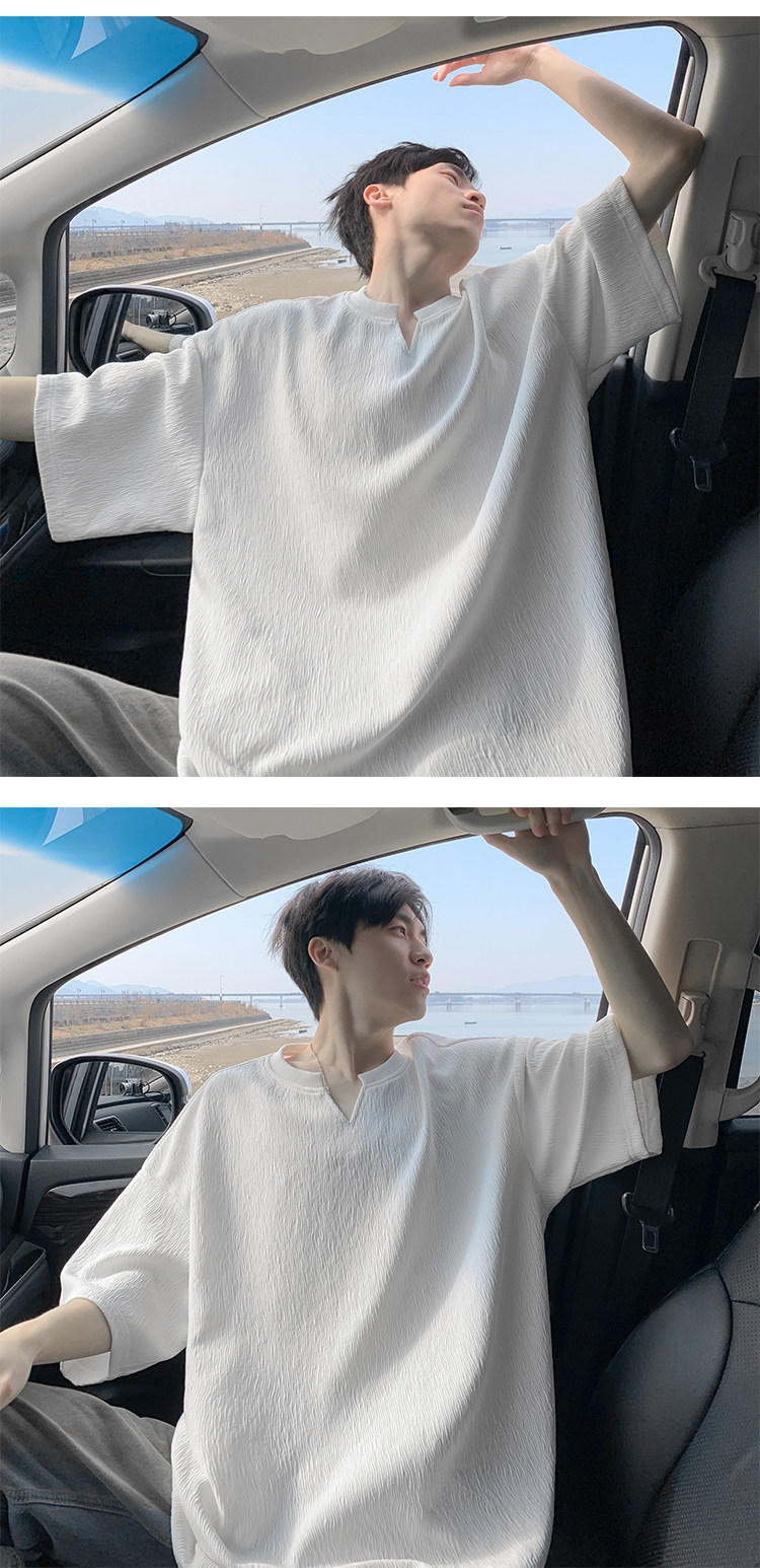 潮牌復古紋理感褶皺短袖T恤男夏季薄款加肥加大碼寬鬆涼感V領體恤