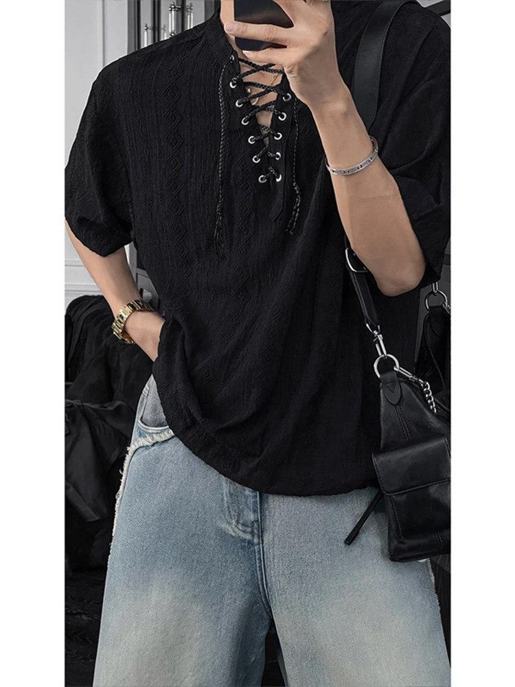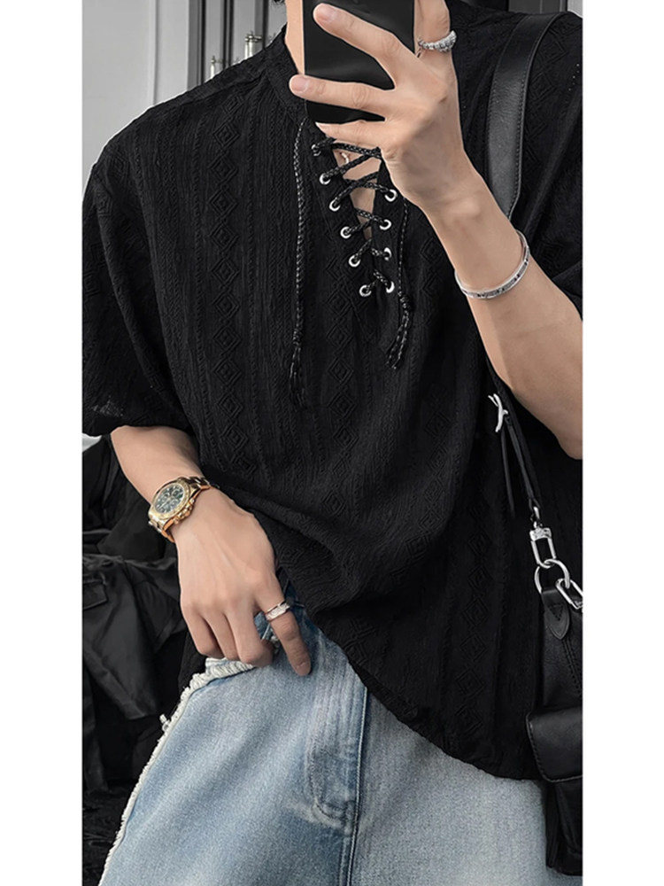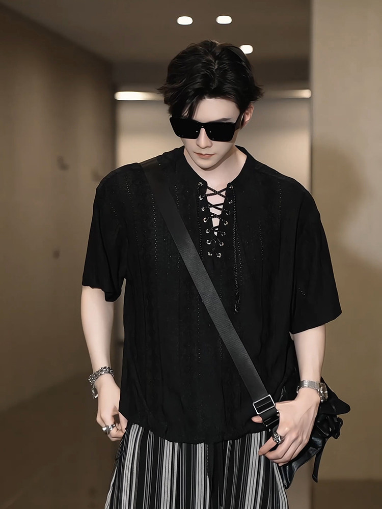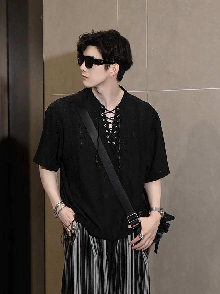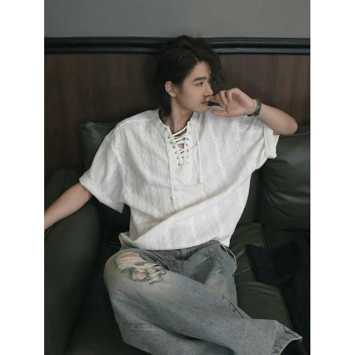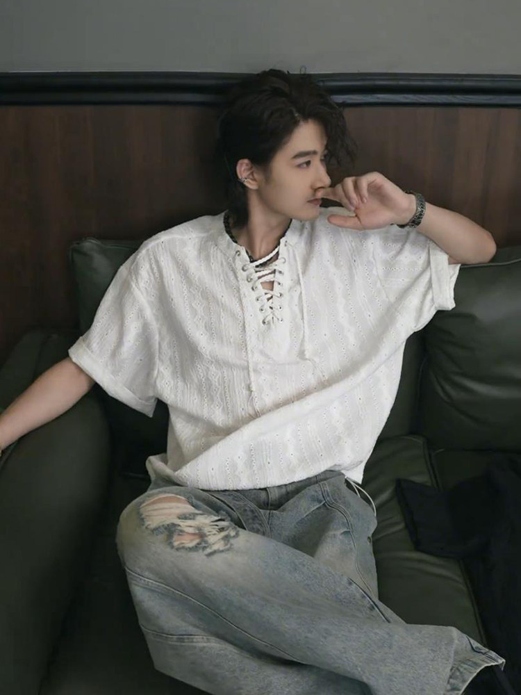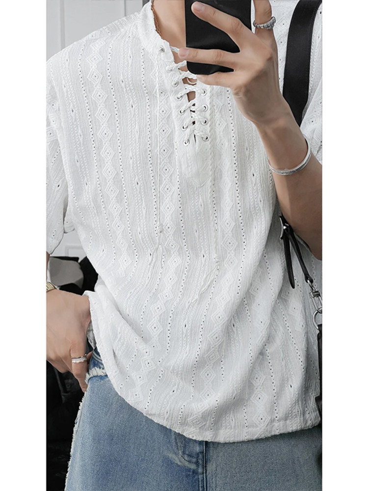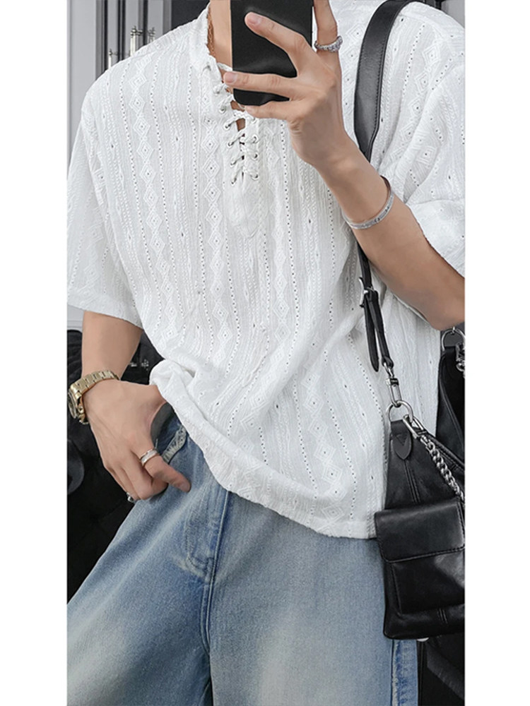老錢風鏤空提花綁帶v領短袖男款夏季高級感痞帥t恤設計感小衆半袖