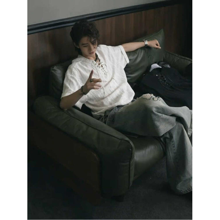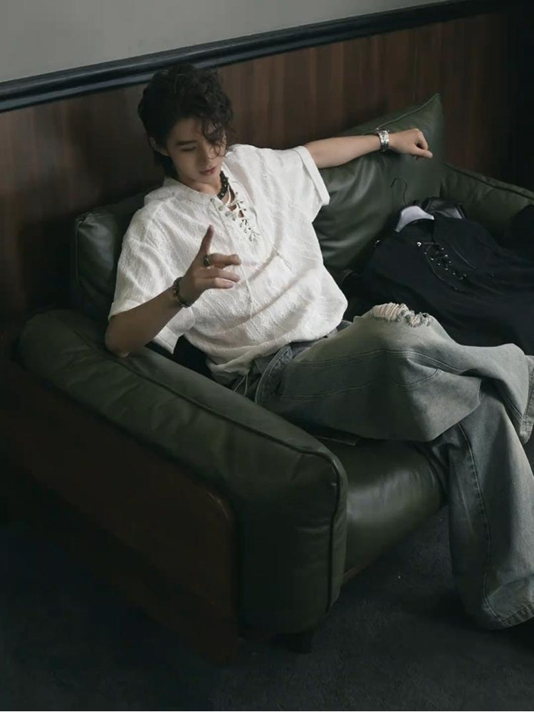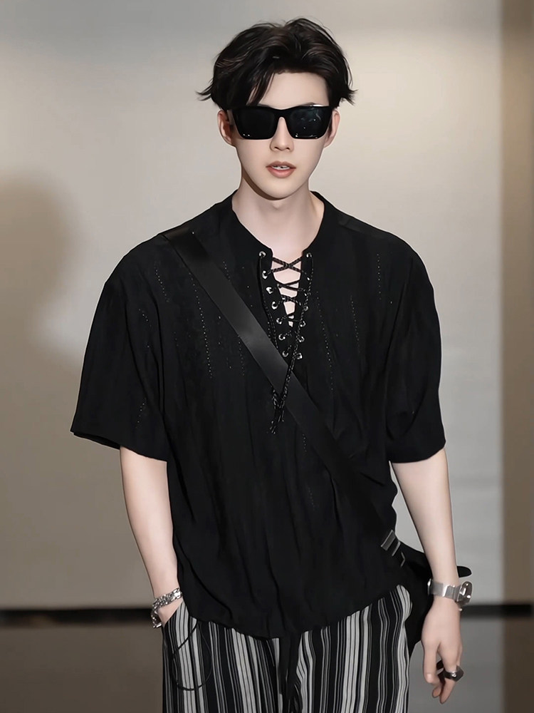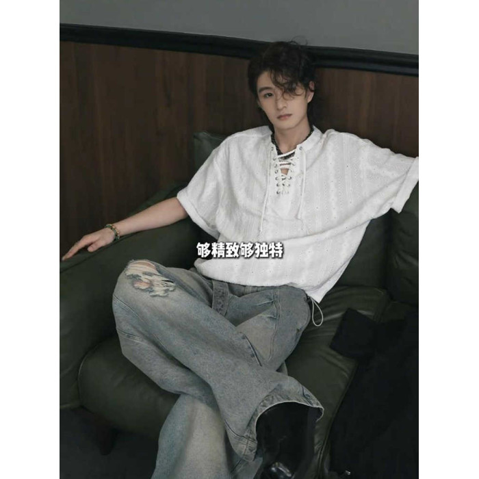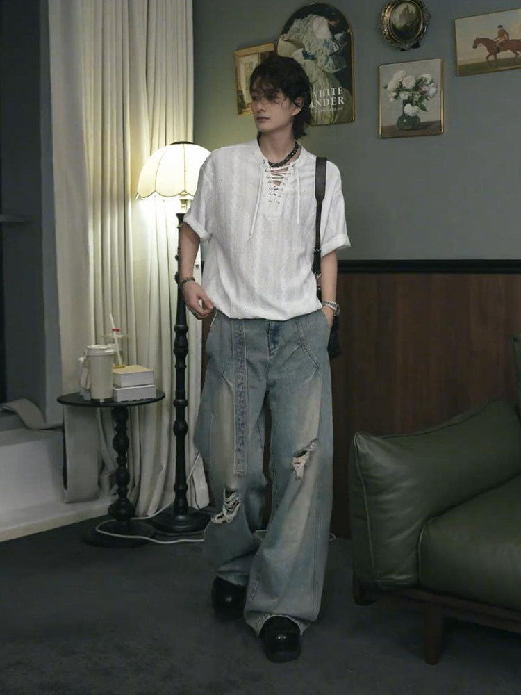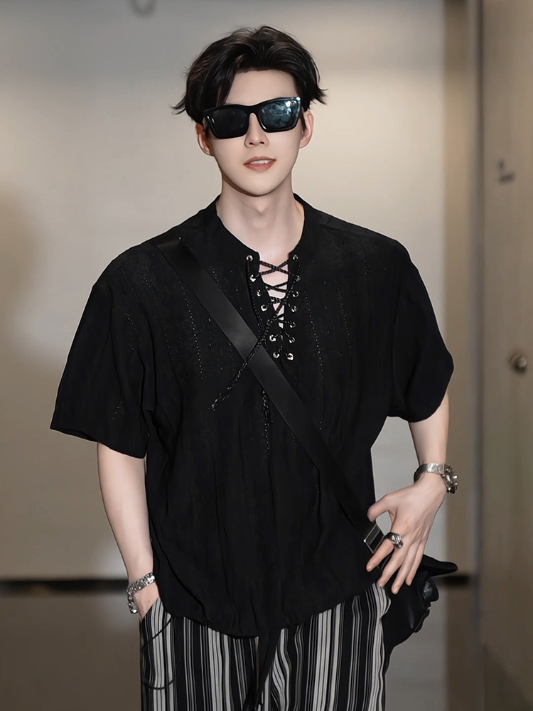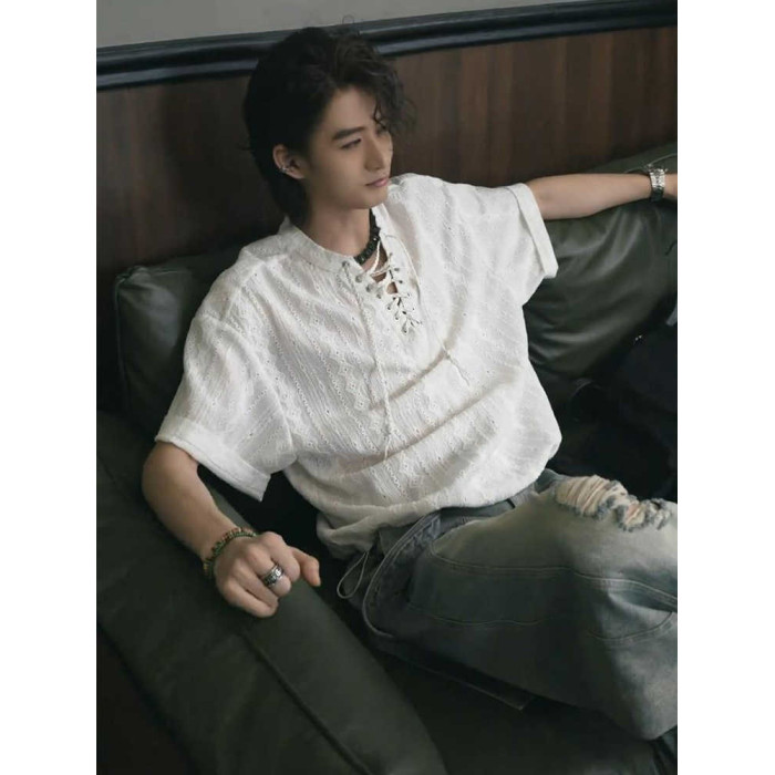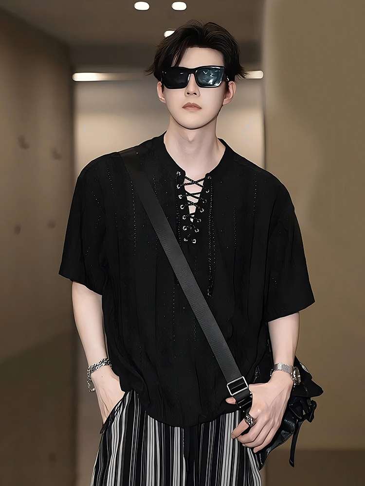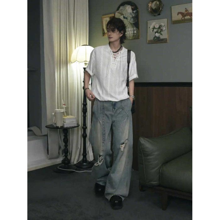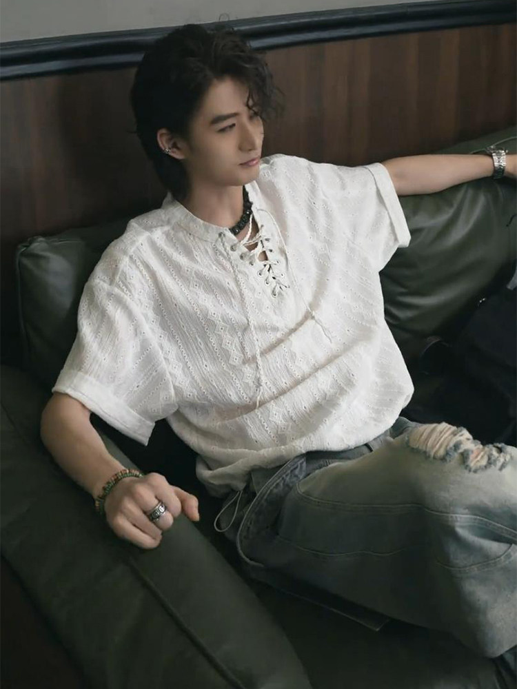 老錢風鏤空提花綁帶v領短袖男款夏季高級感痞帥t恤設計感小衆半袖