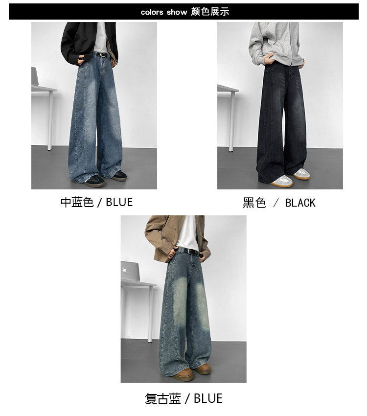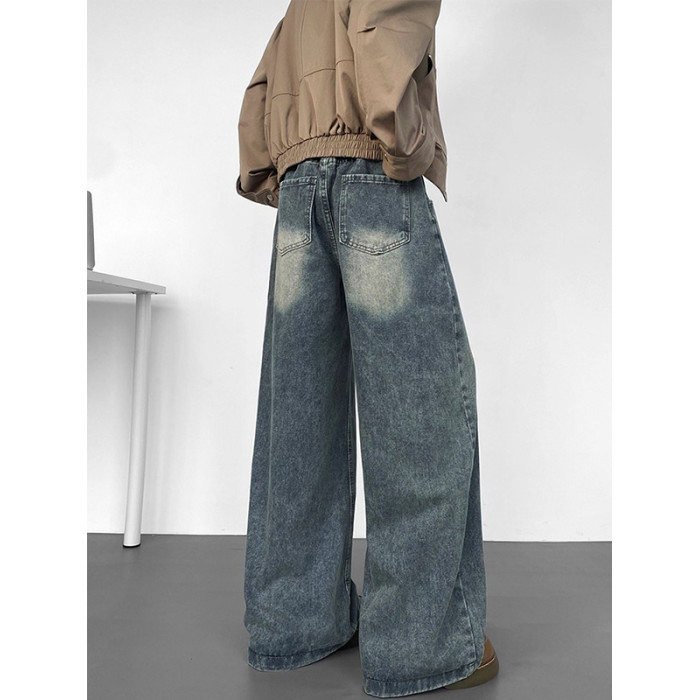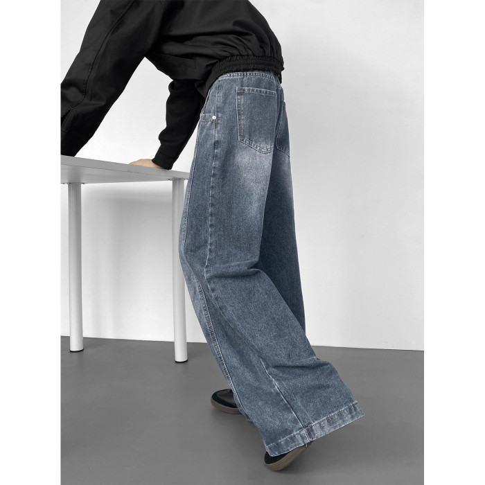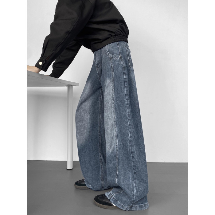 美式高街彎刀牛仔褲男冬季寬鬆加絨加厚大碼濶腿褲男生復古長褲子