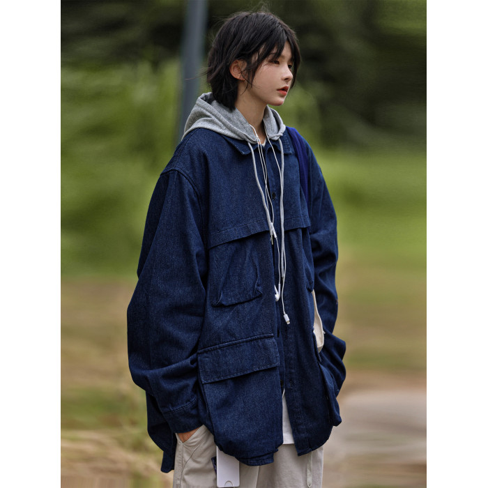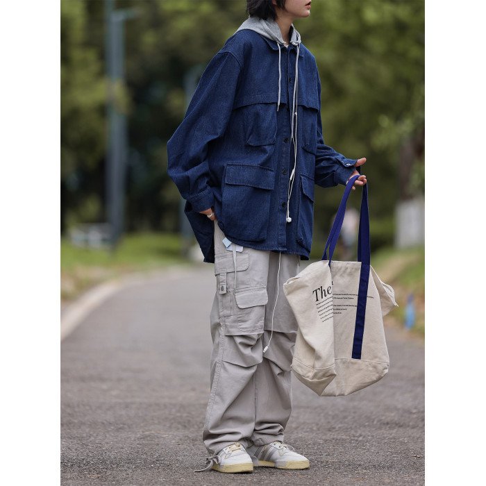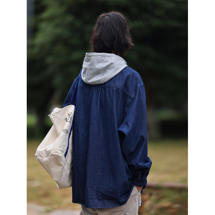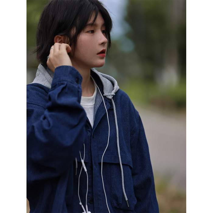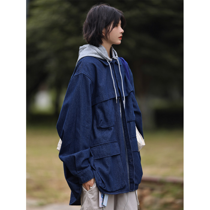 Nobodyknows日系假兩件可拆卸帽多口袋男女廓形牛仔夾克春祺外套