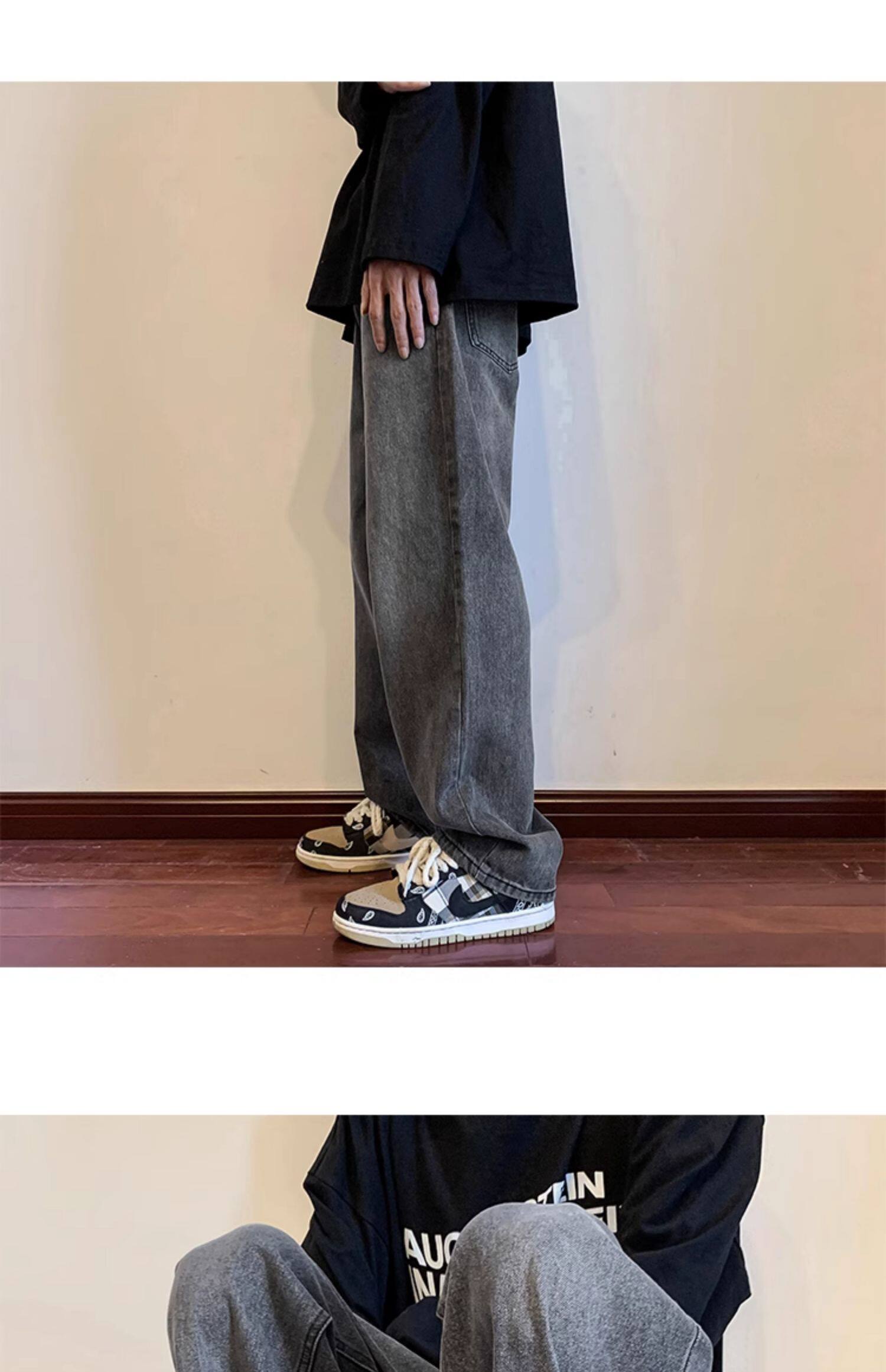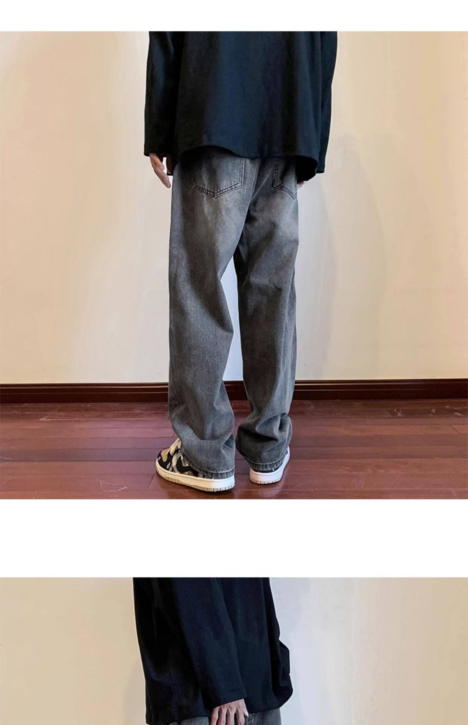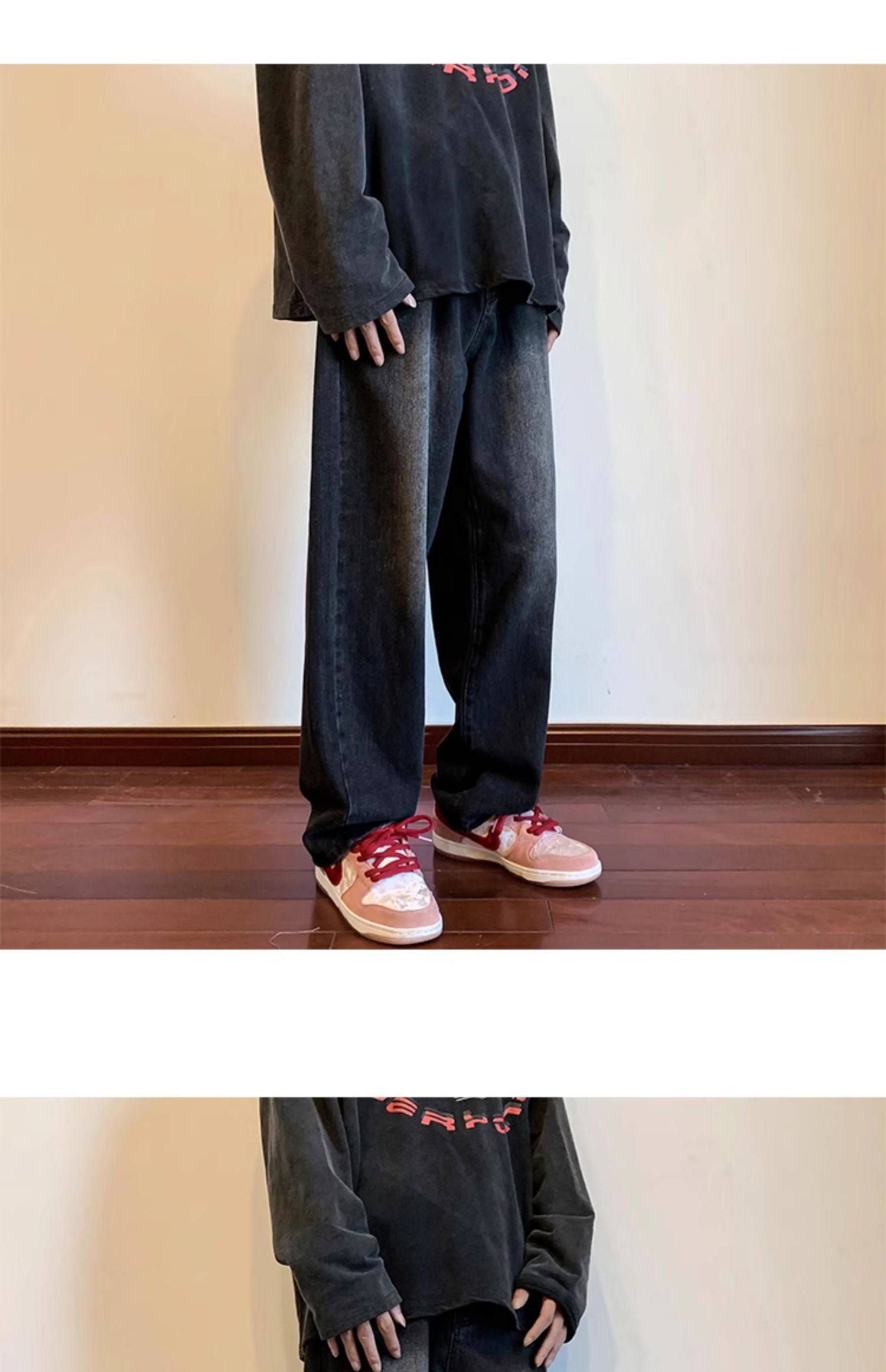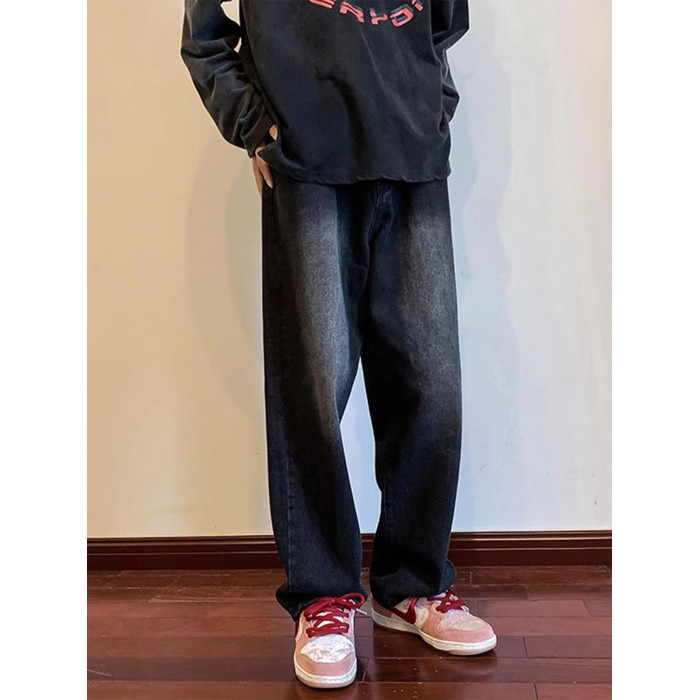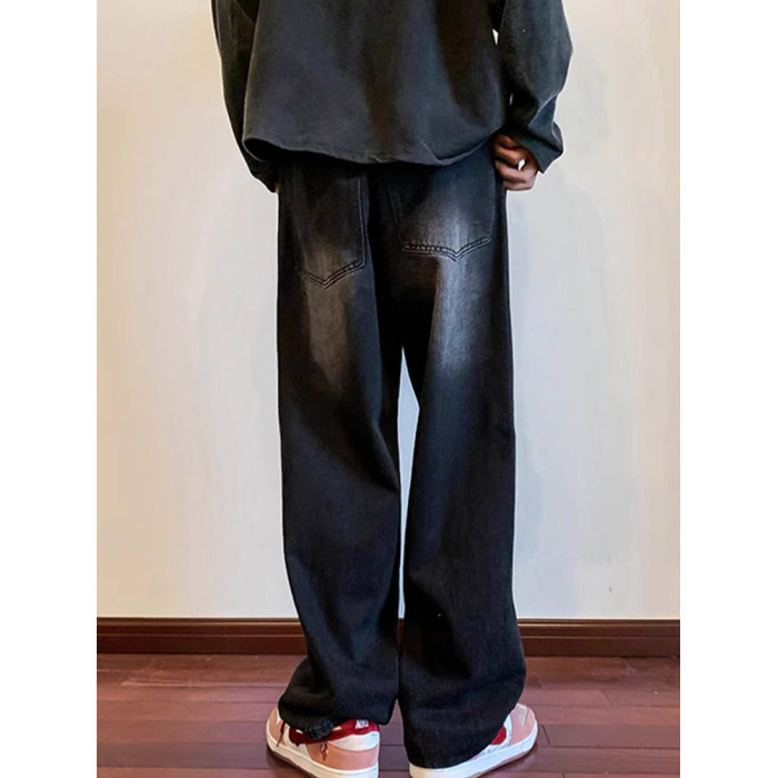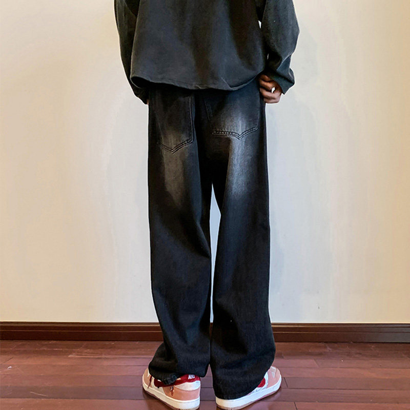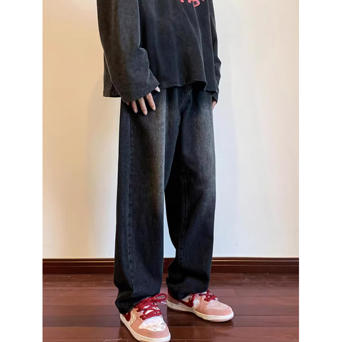 美式高街vibe黑色牛仔褲男款潮牌寬鬆水洗直筒褲冬季濶腿拖地長褲