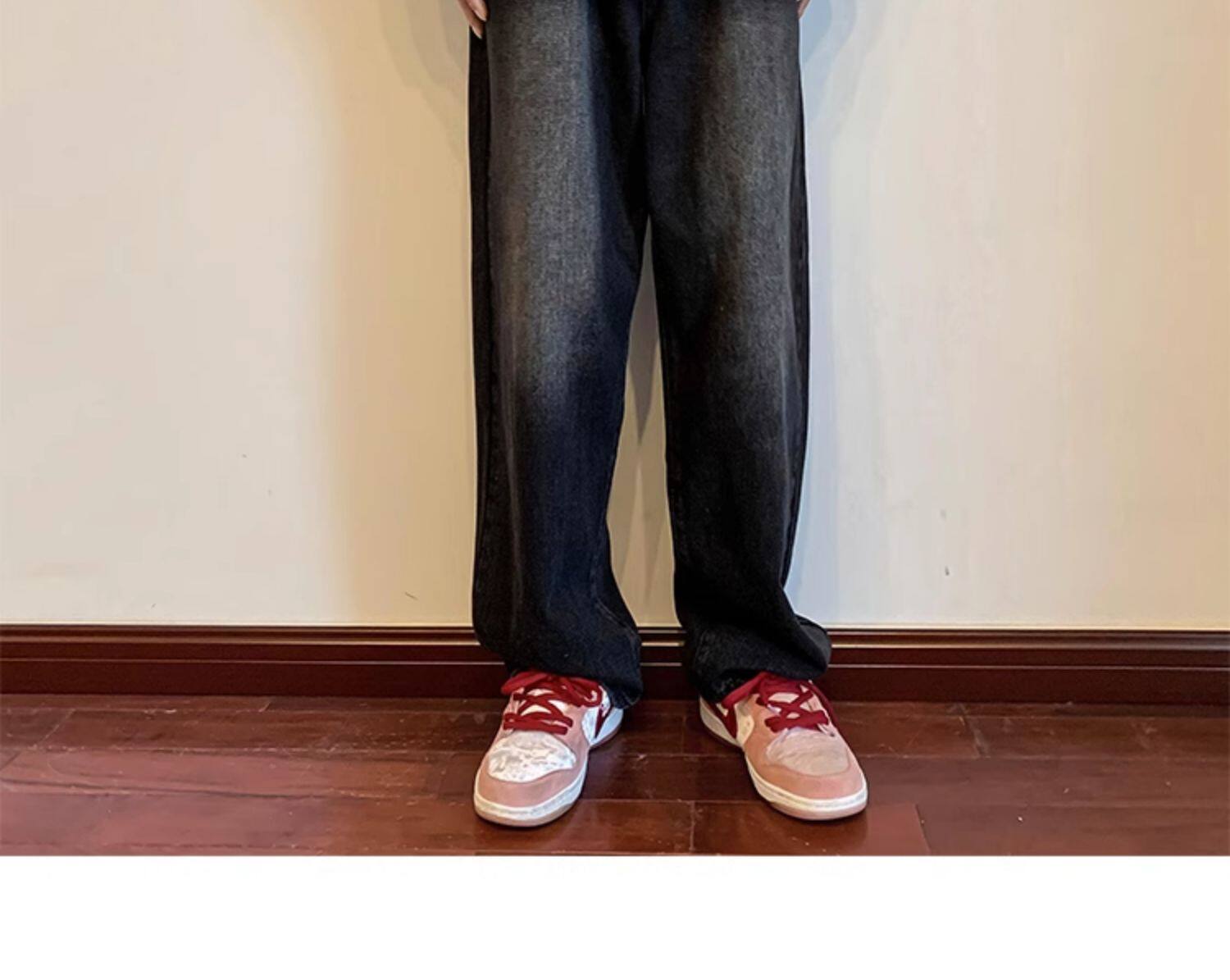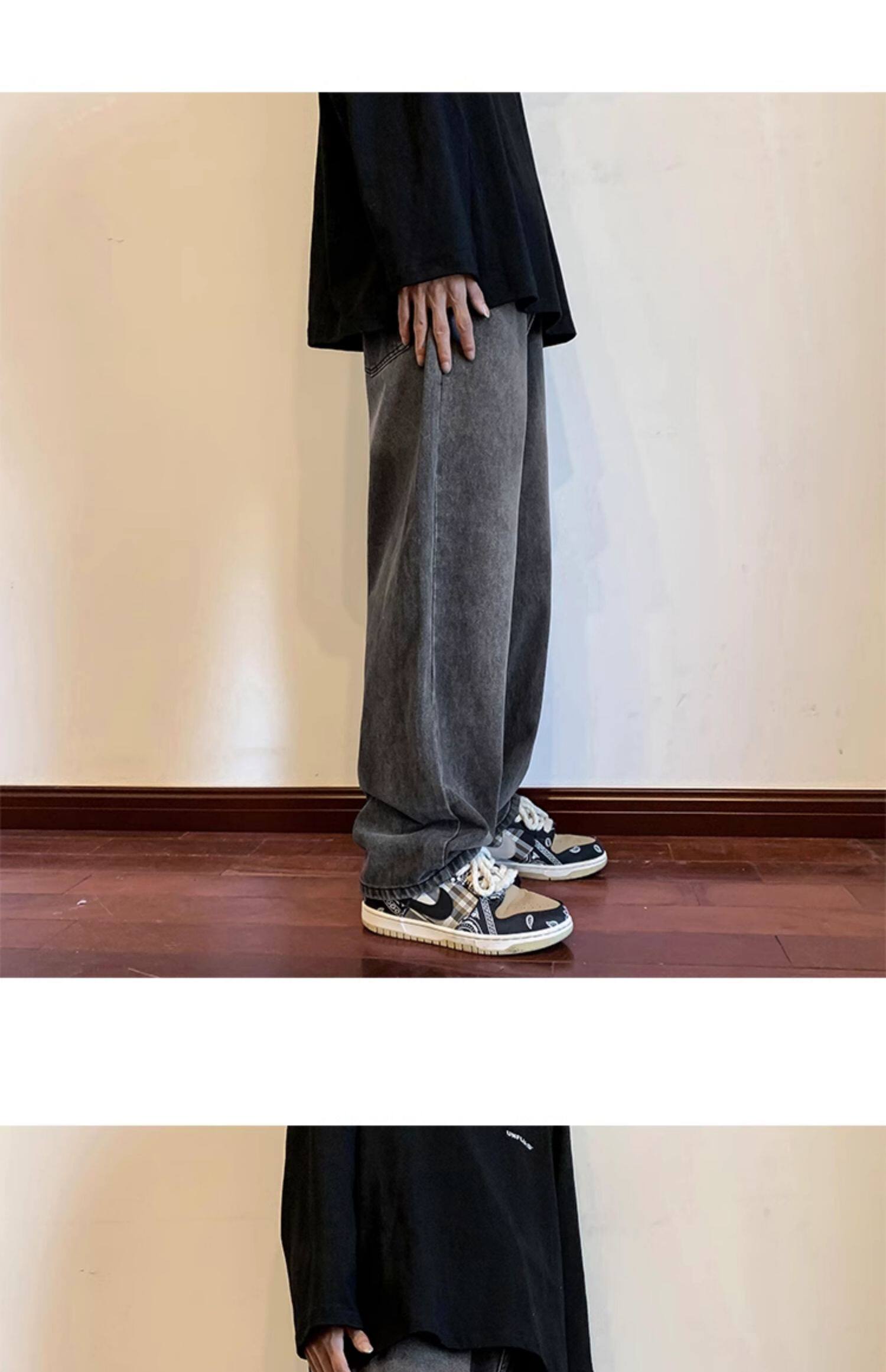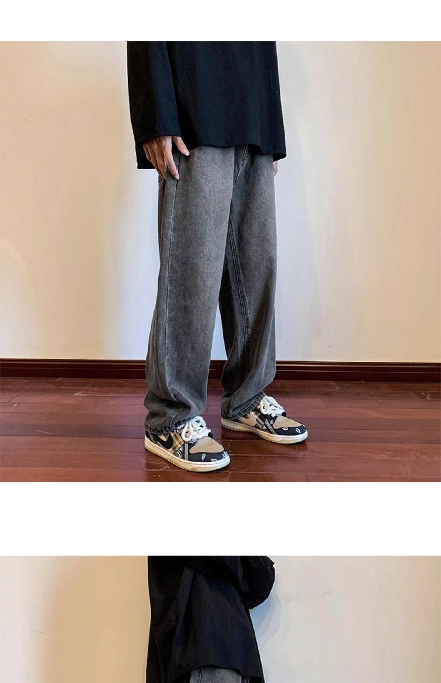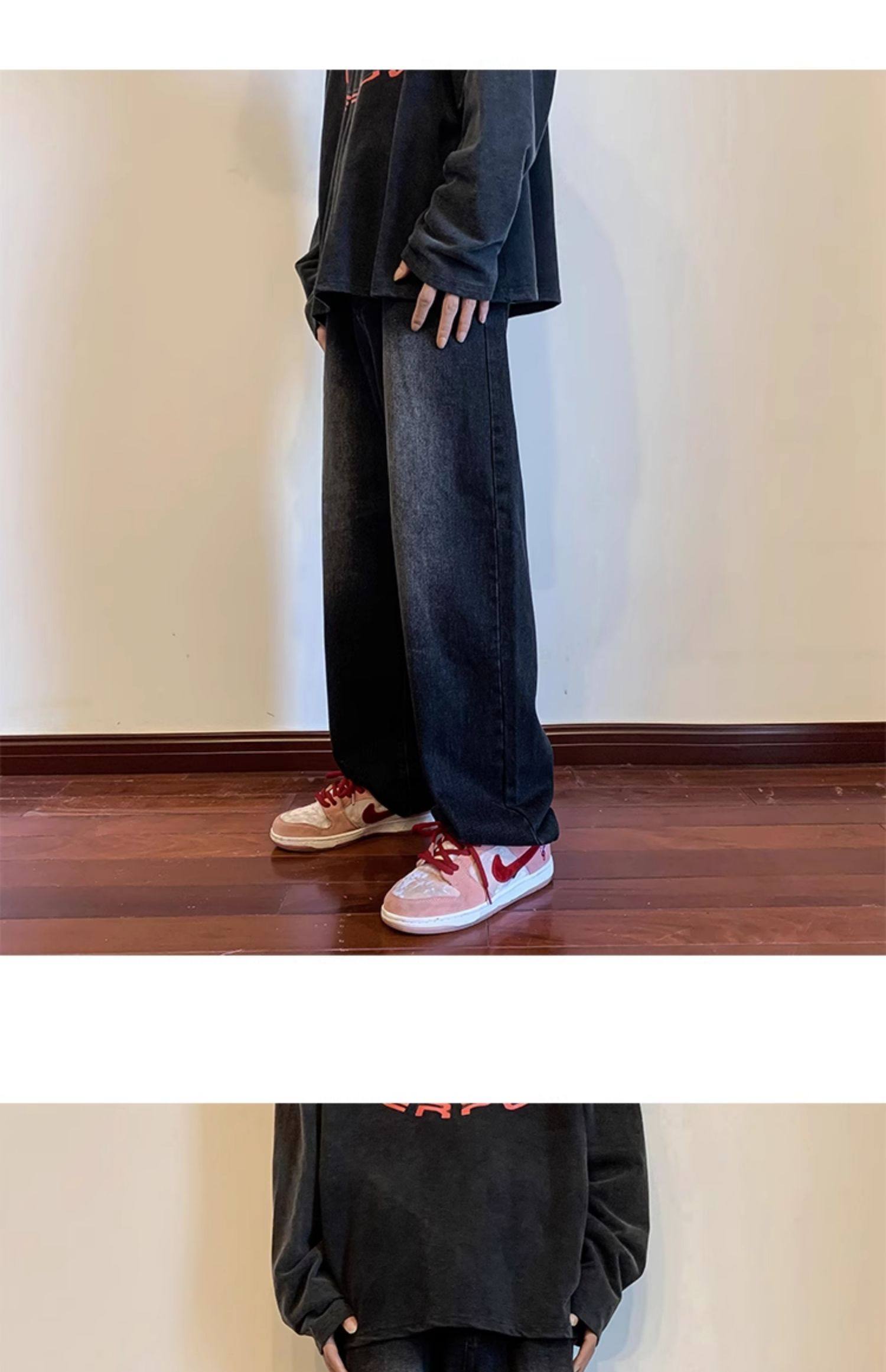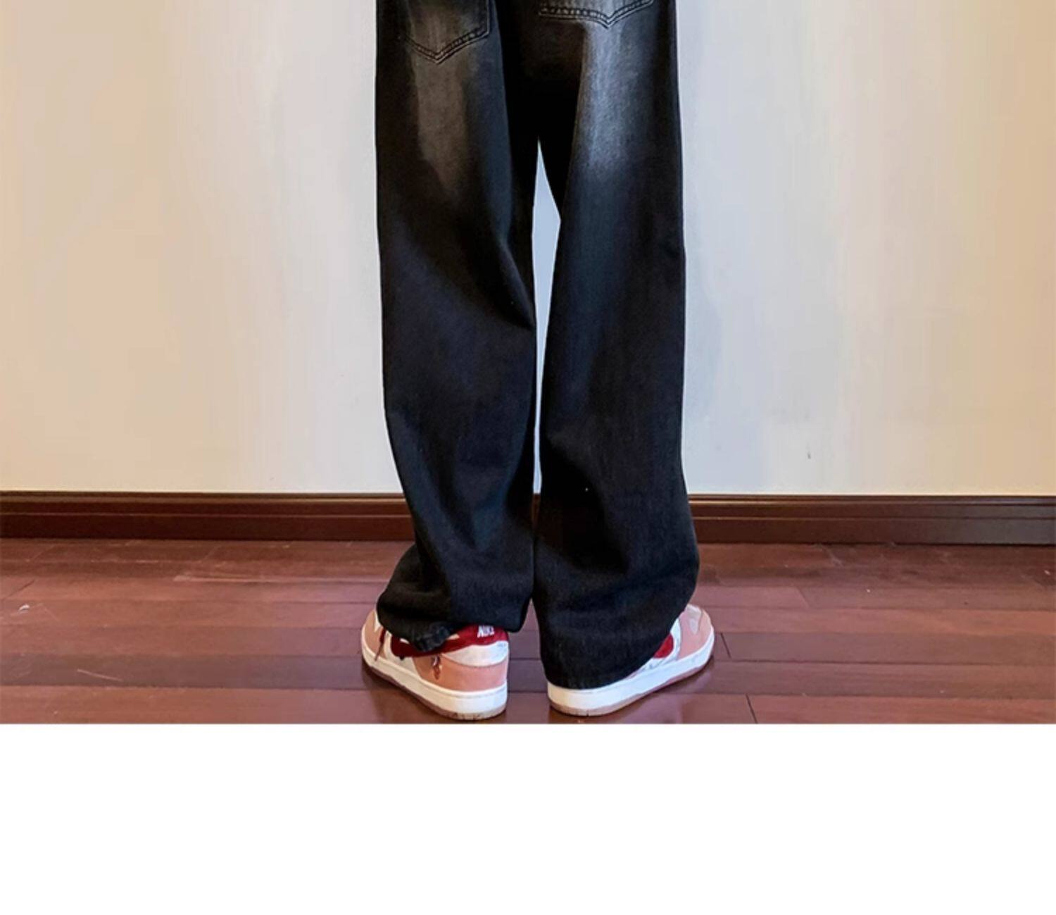 美式高街vibe黑色牛仔褲男款潮牌寬鬆水洗直筒褲冬季濶腿拖地長褲