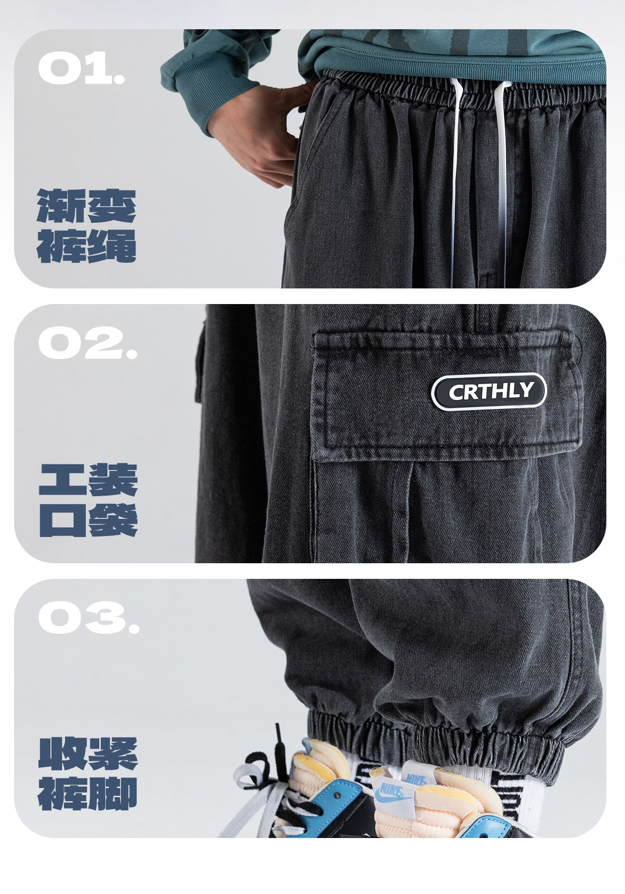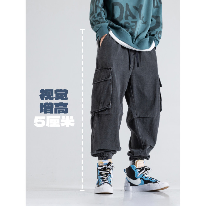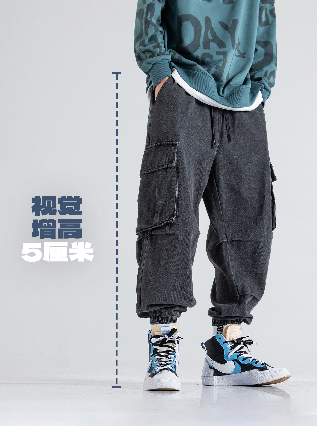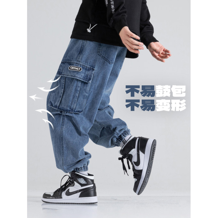 高街工裝褲子男款春季美式束腳長褲休閒大碼寬鬆男士牛仔褲濶腿