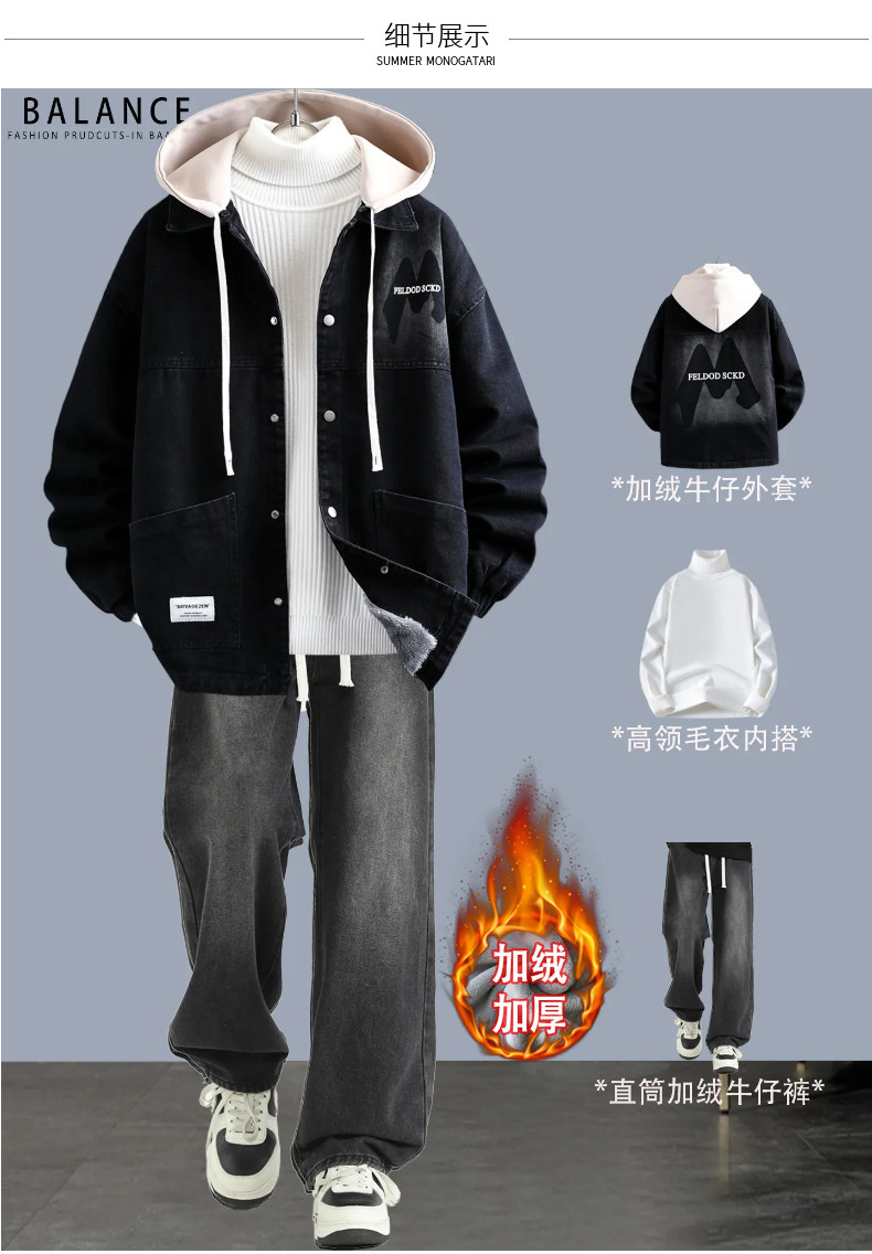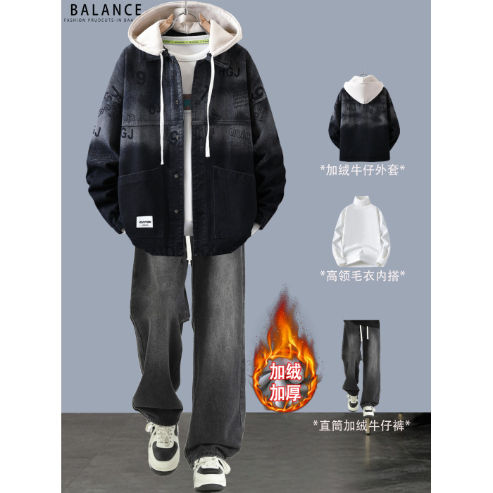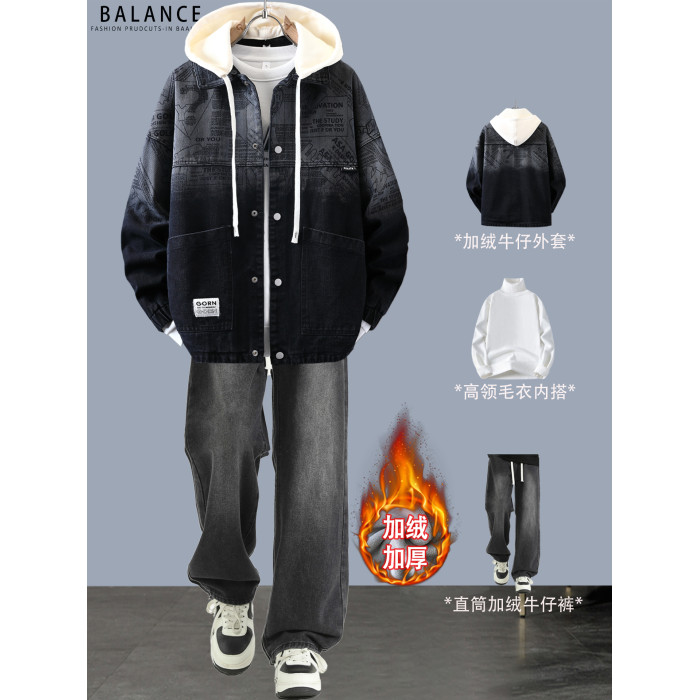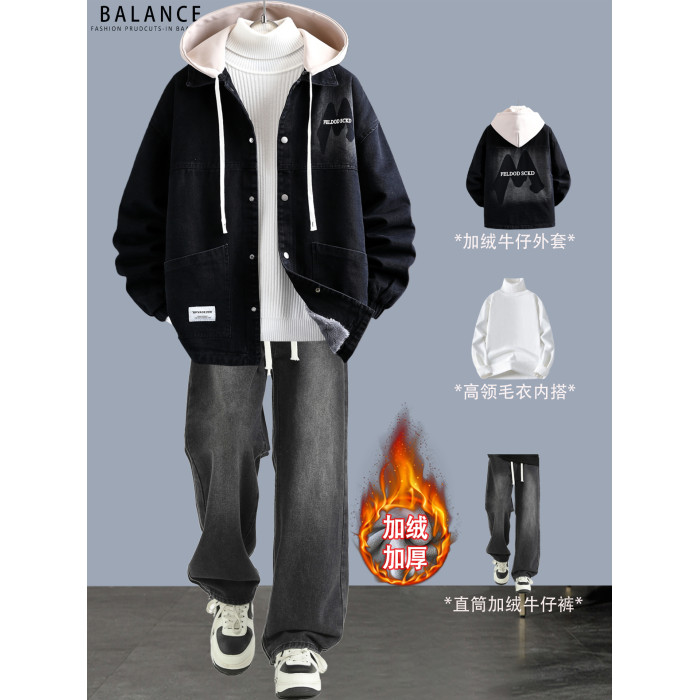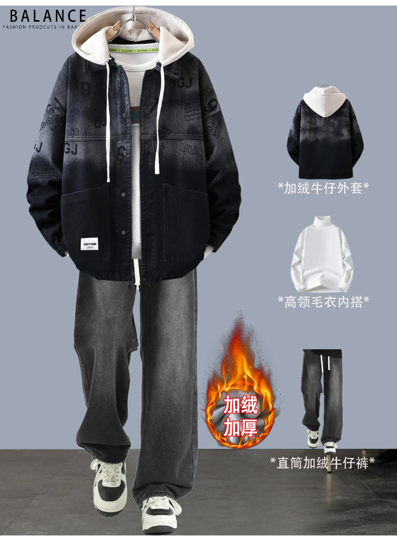 冬季加絨加厚牛仔外套男孩青少年連帽夾克帥氣潮流套裝初高中學生