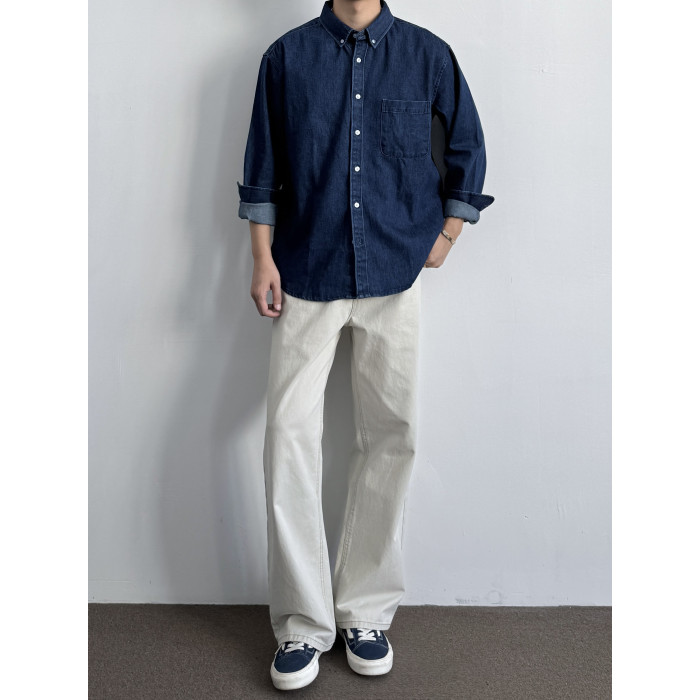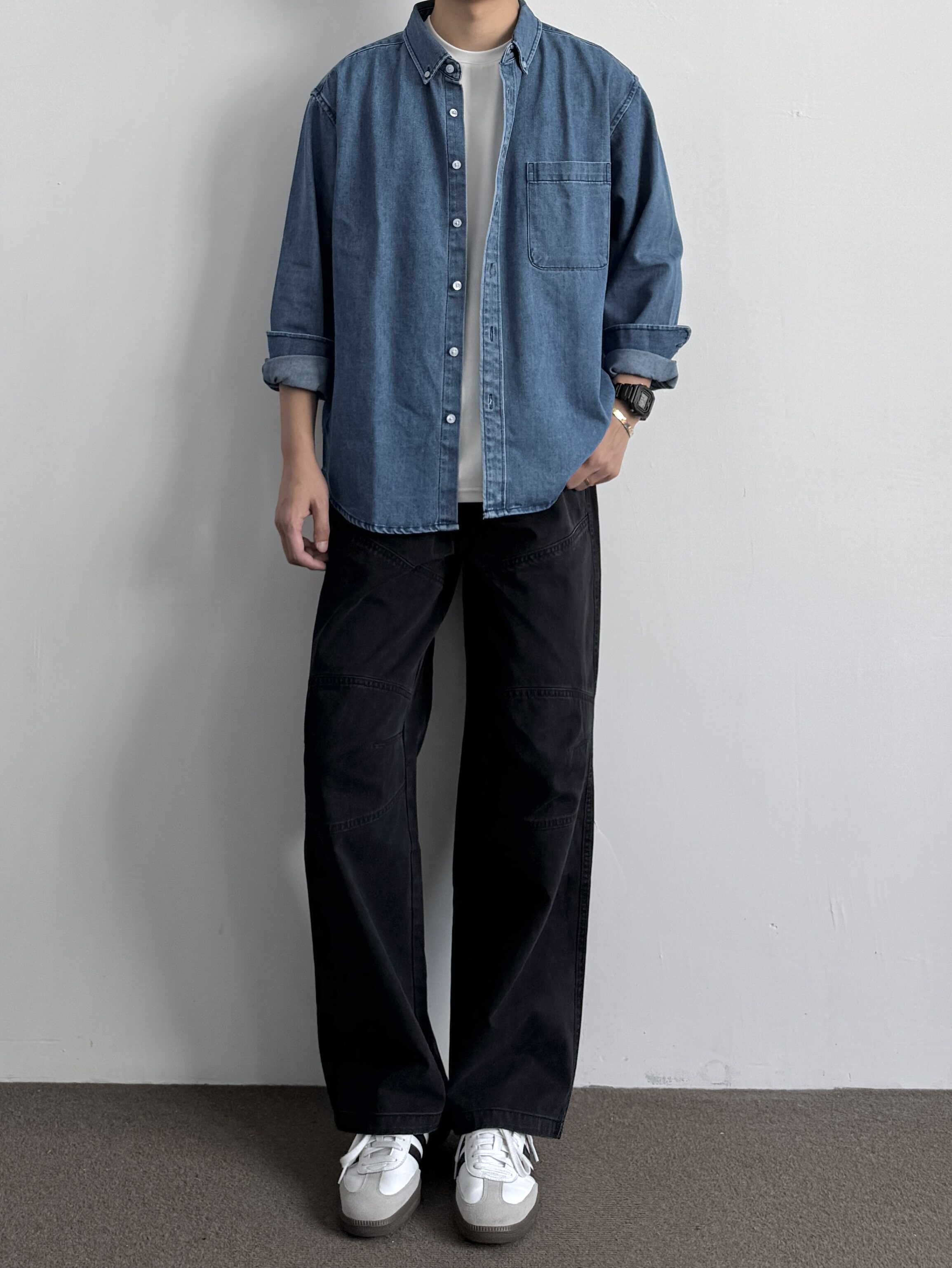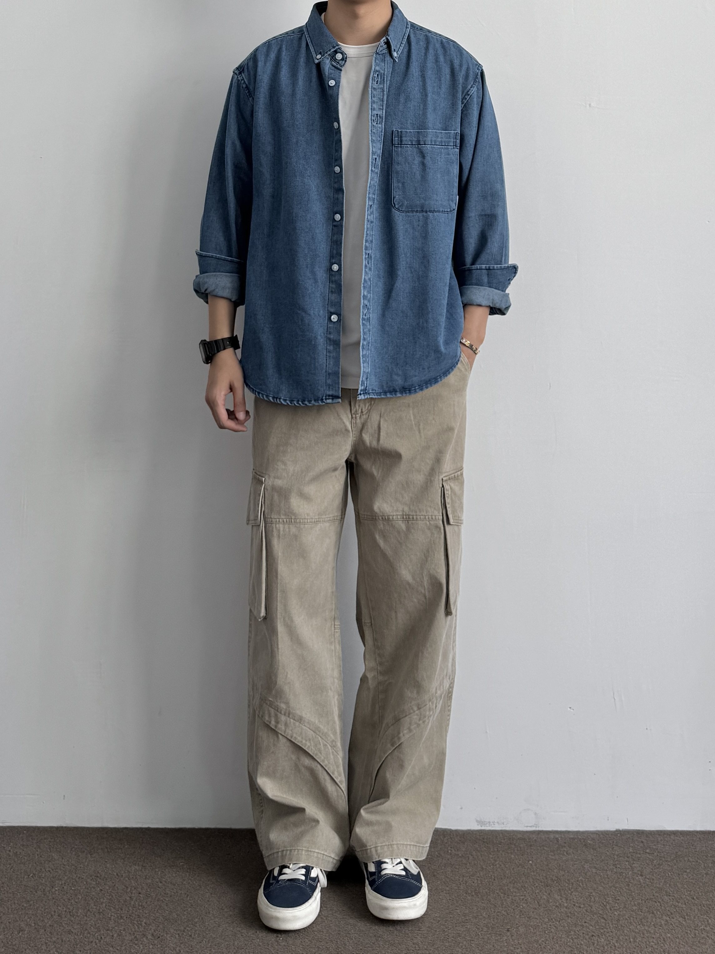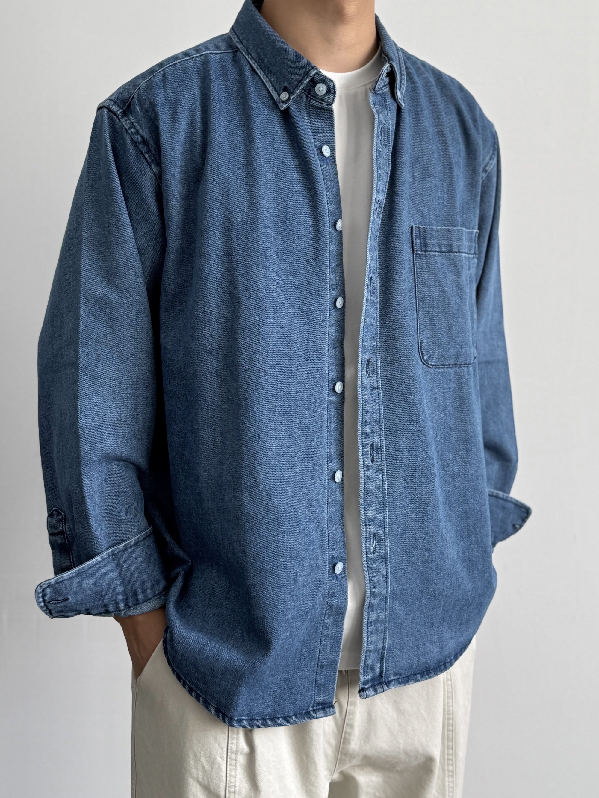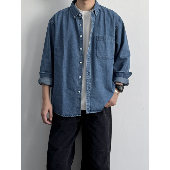 ONUN日系復古水洗工裝牛仔襯衫長袖寬鬆休閒百搭紐釦領襯衣外套秋