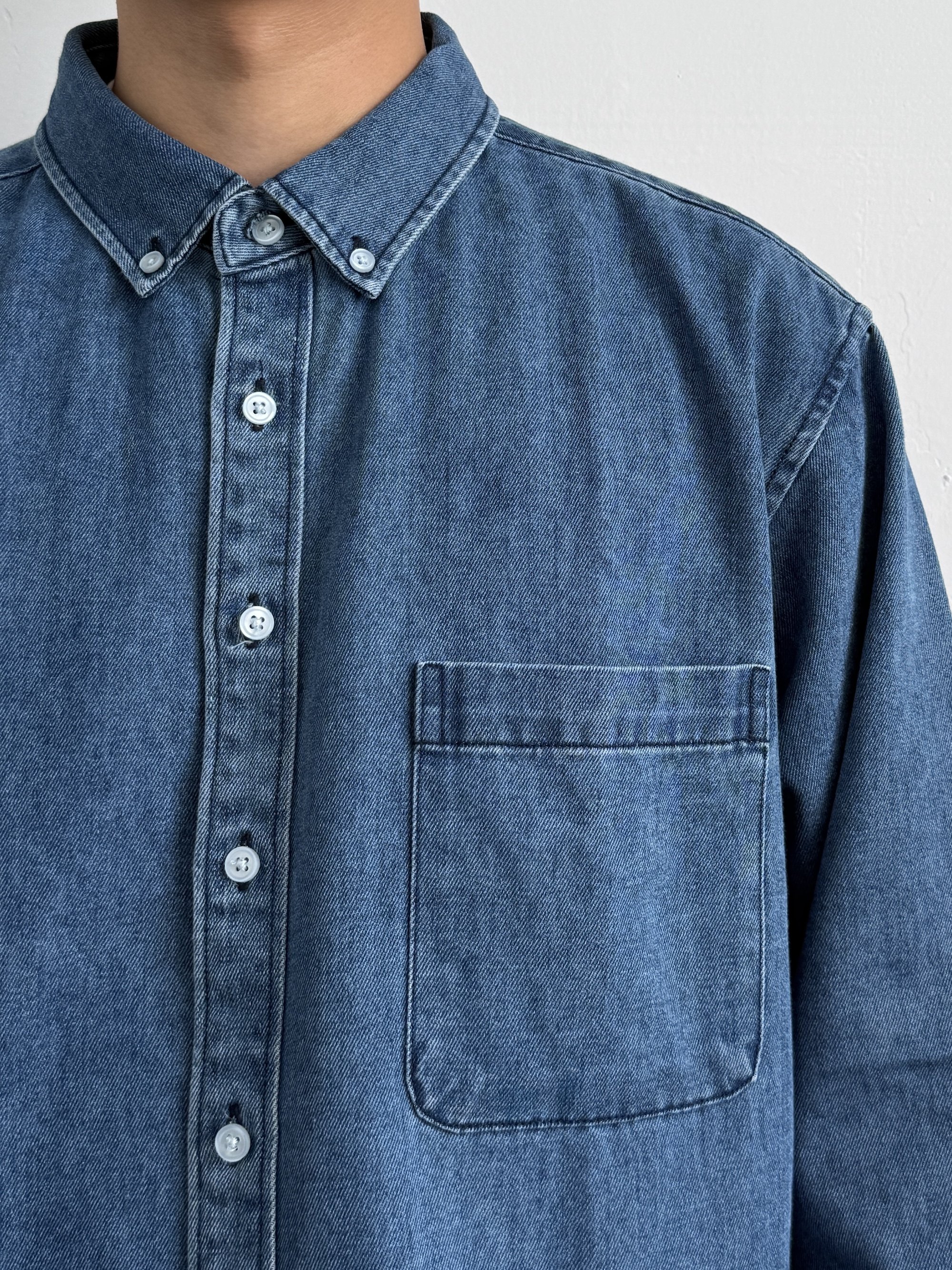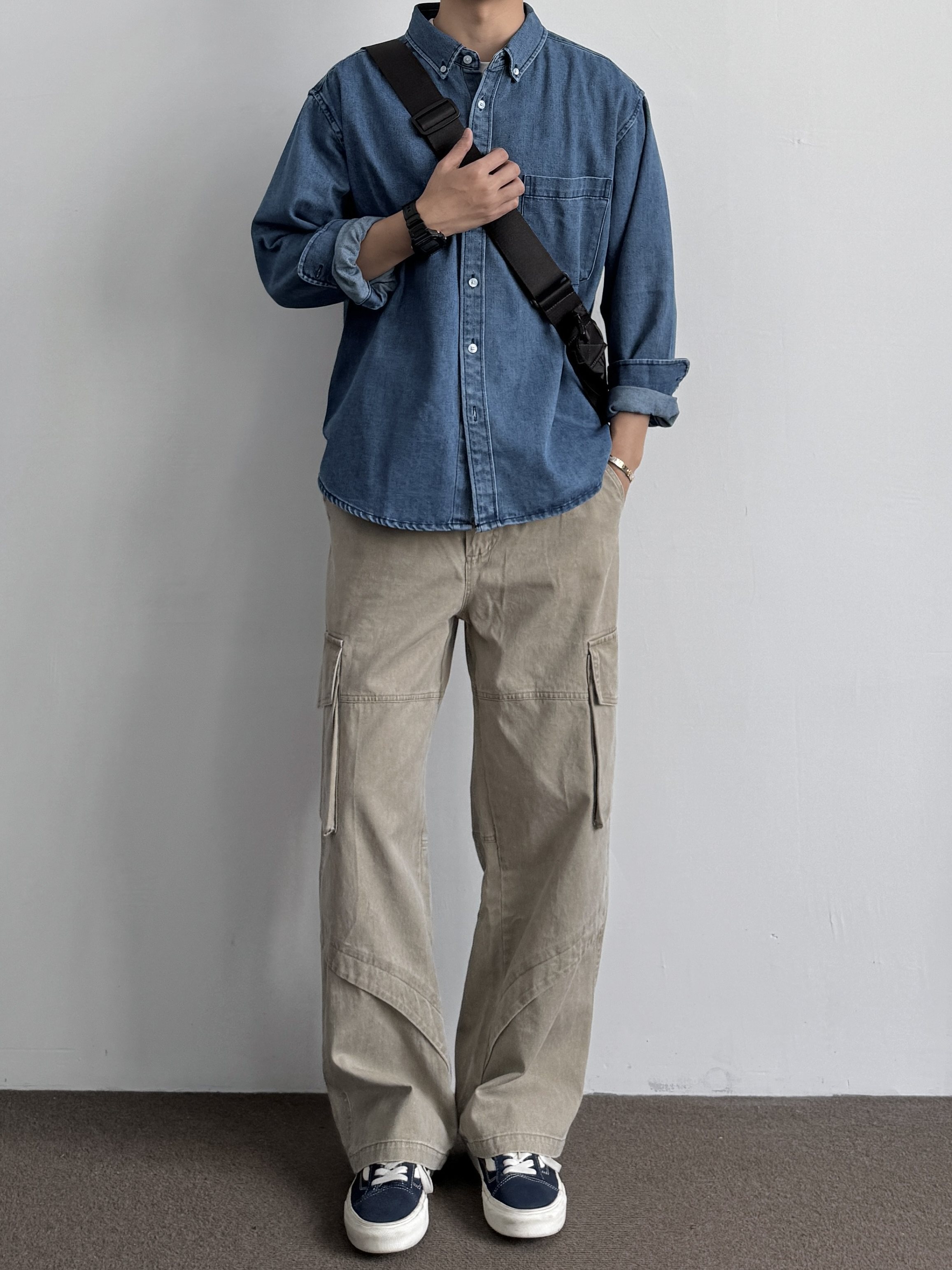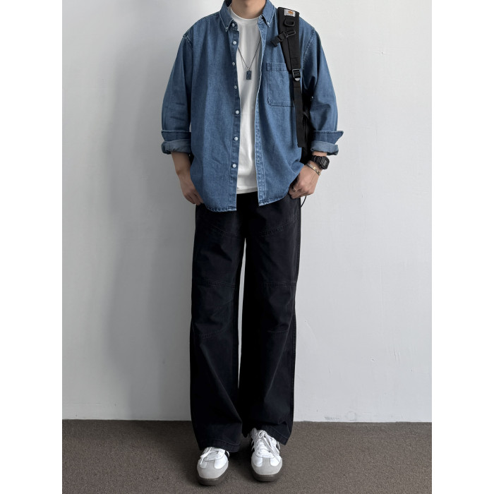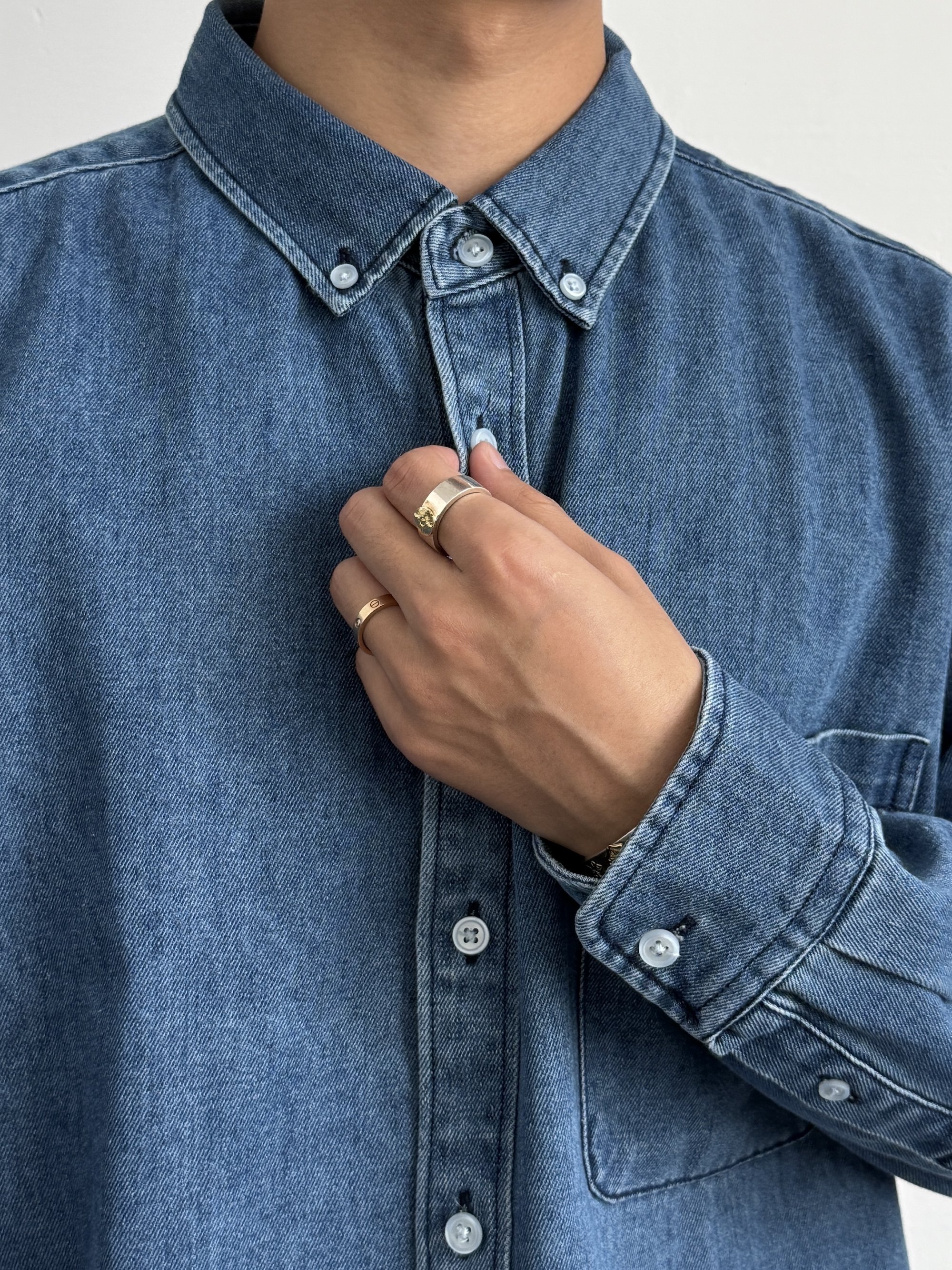 ONUN日系復古水洗工裝牛仔襯衫長袖寬鬆休閒百搭紐釦領襯衣外套秋