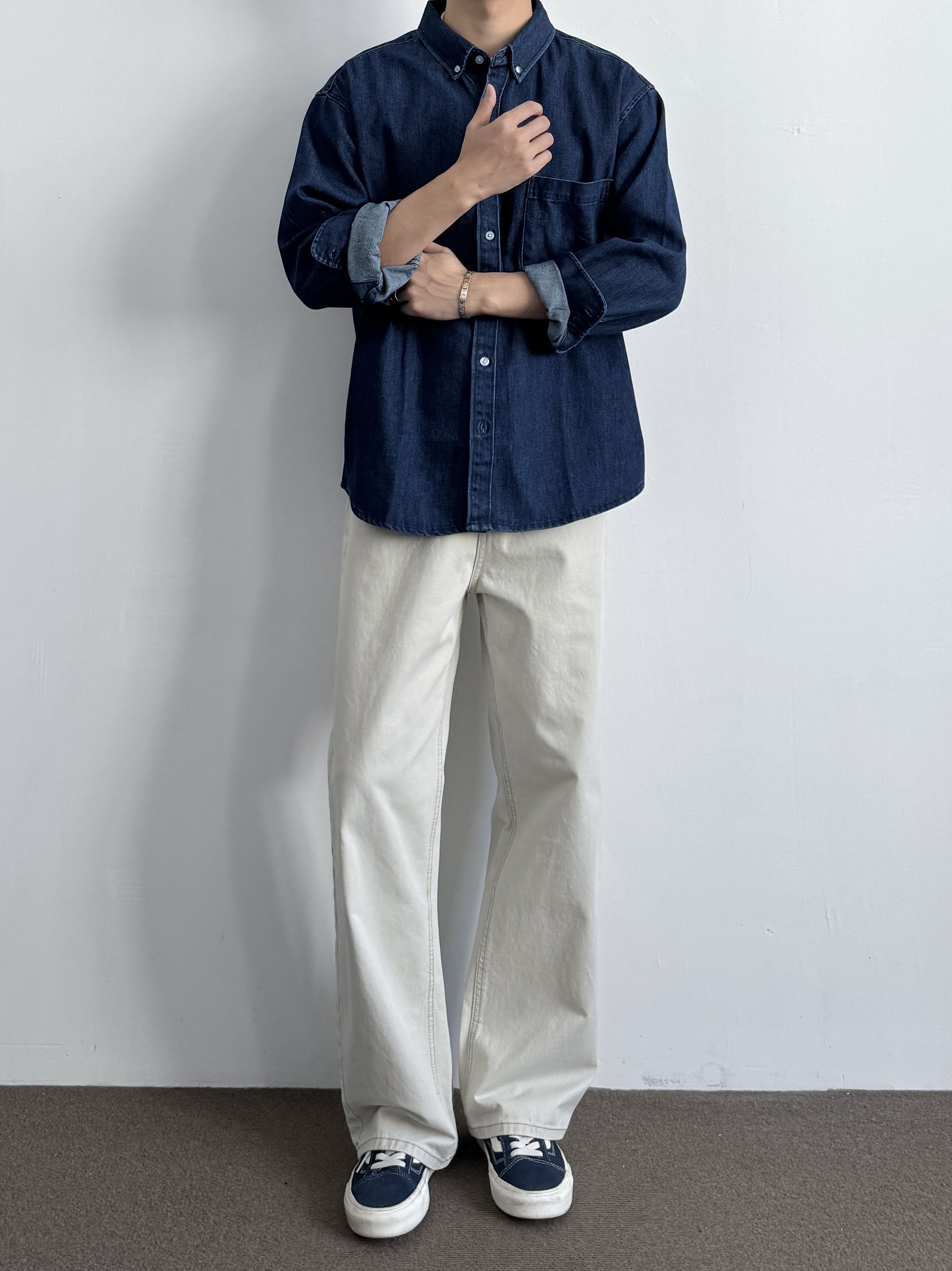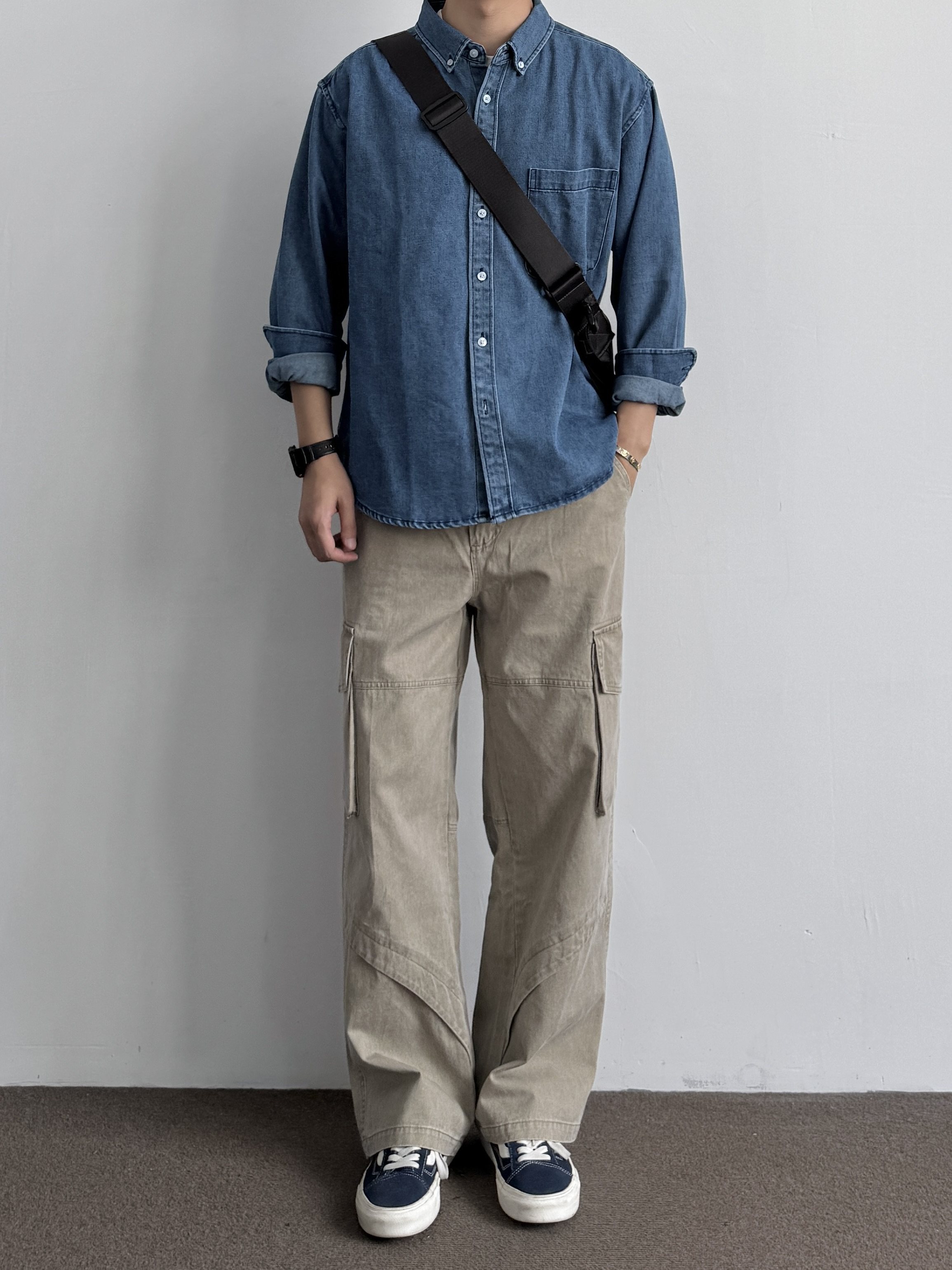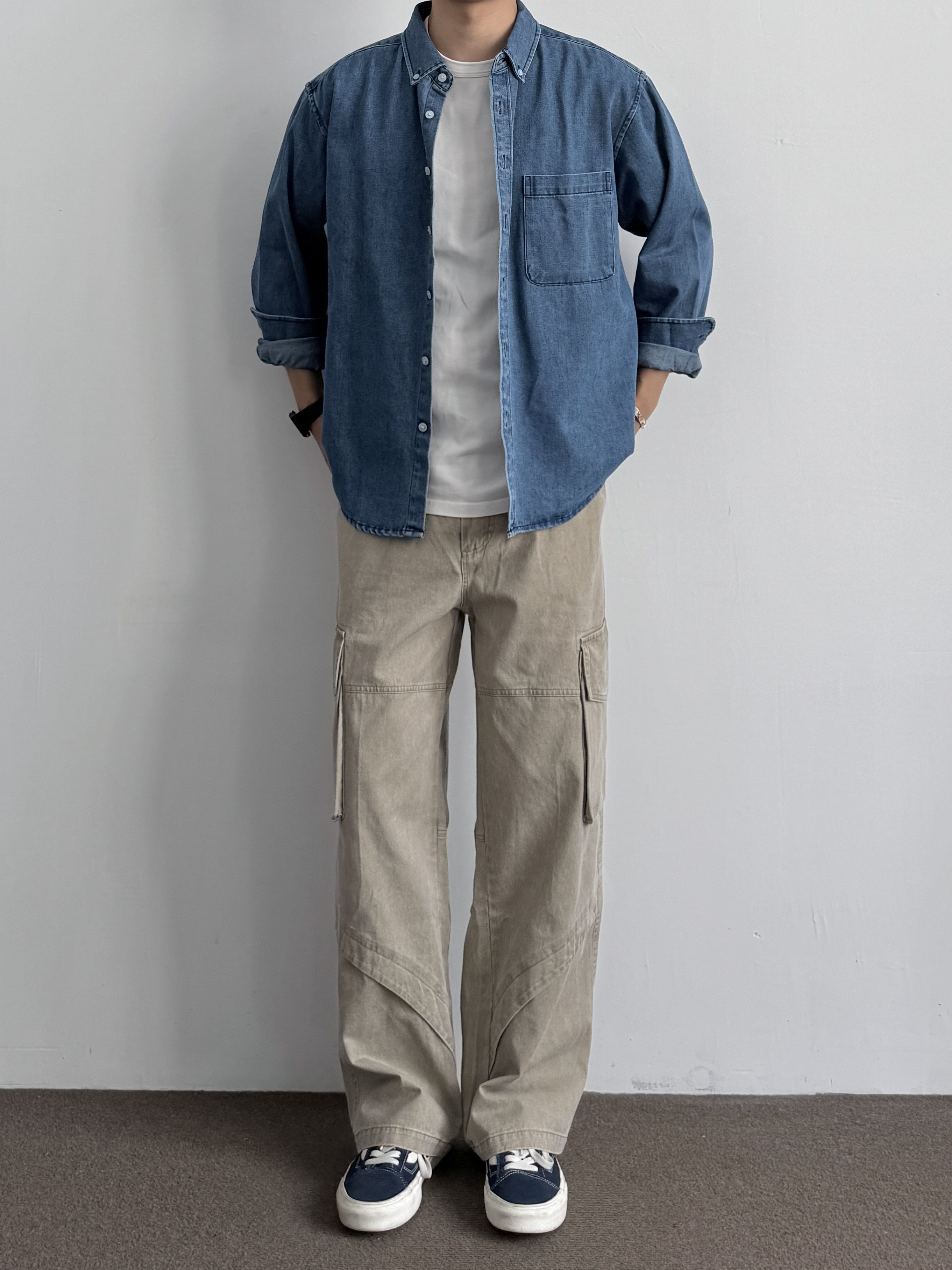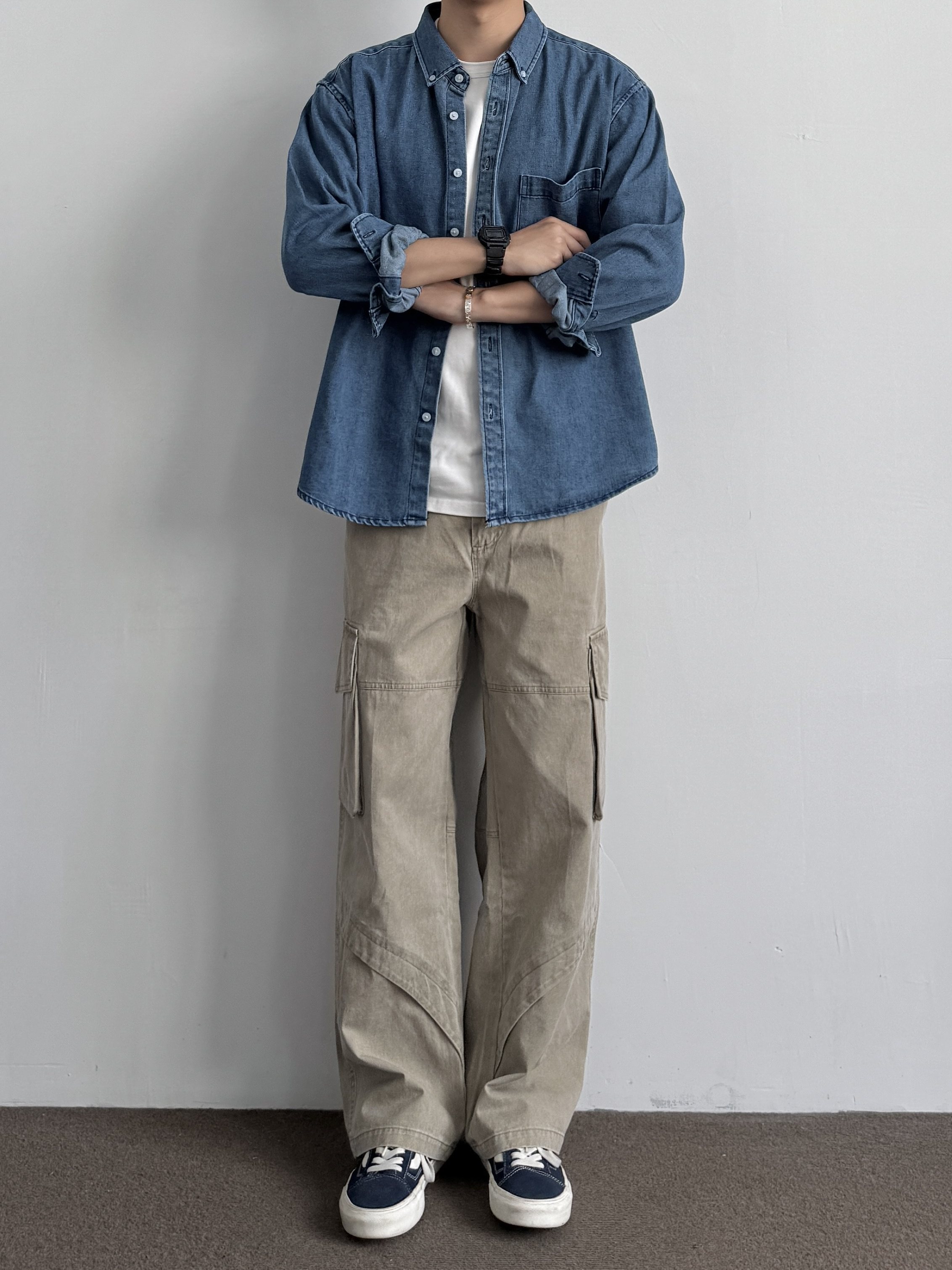 ONUN日系復古水洗工裝牛仔襯衫長袖寬鬆休閒百搭紐釦領襯衣外套秋