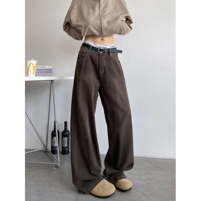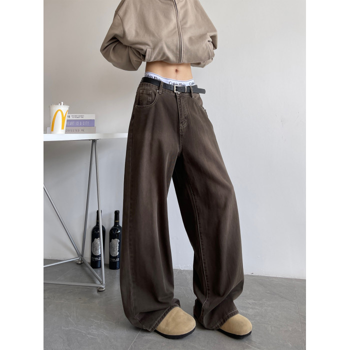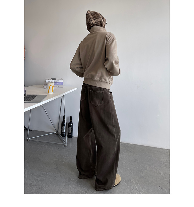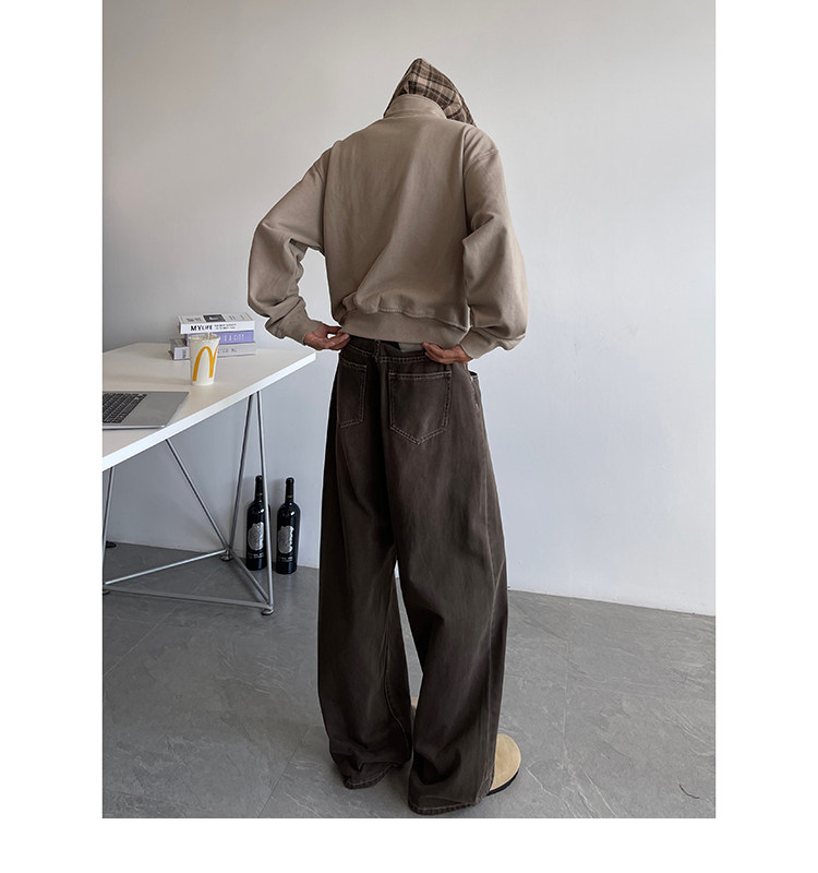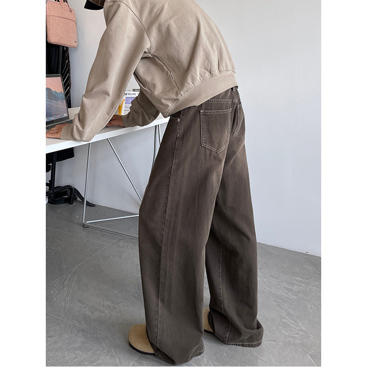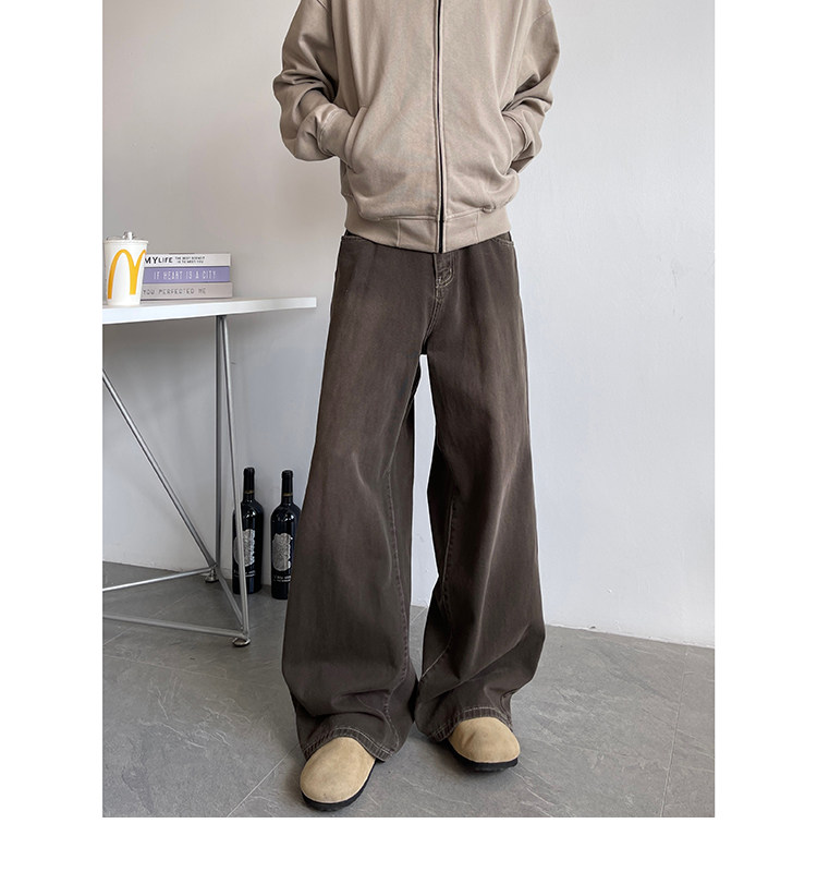 美式復古棕色牛仔褲男潮牌做舊cleanfit寬鬆直筒拖地濶腿休閒長褲