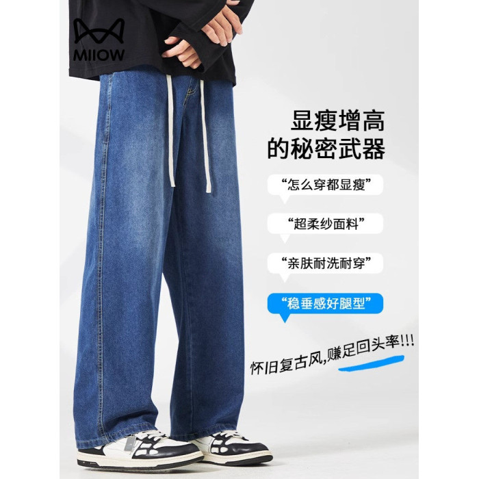 貓人秋冬季美式黑色牛仔褲男士寬鬆濶腿男生直筒加絨加厚長褲子男