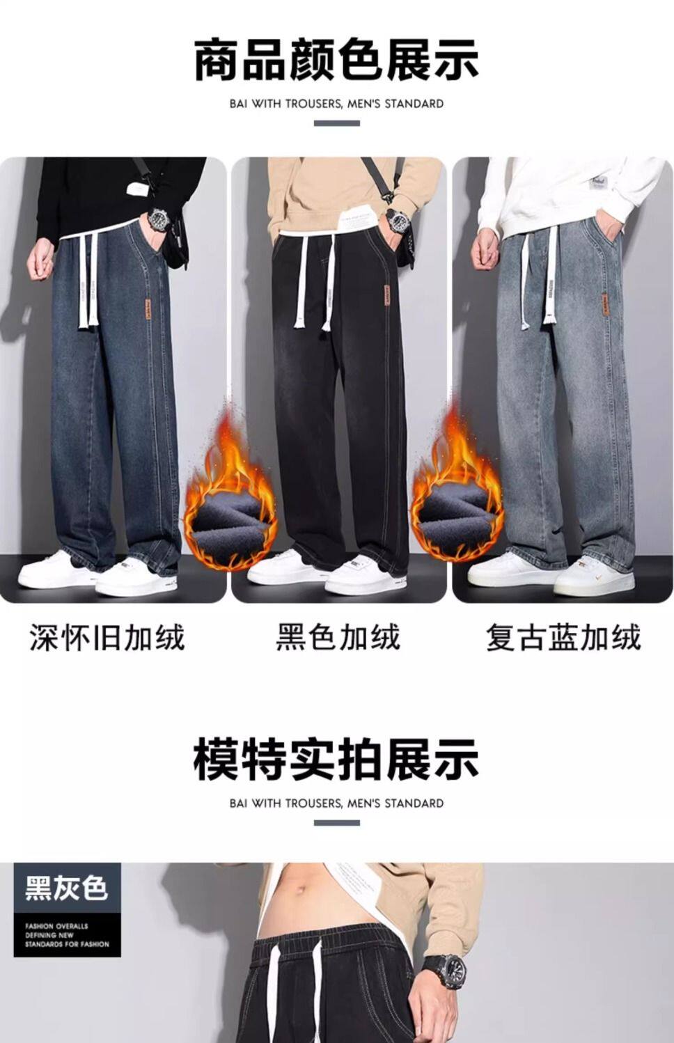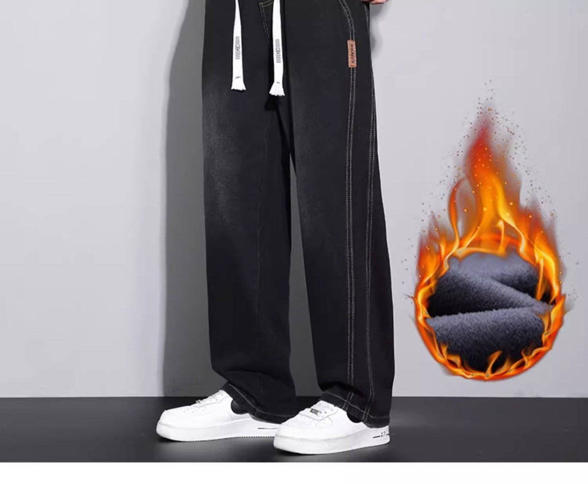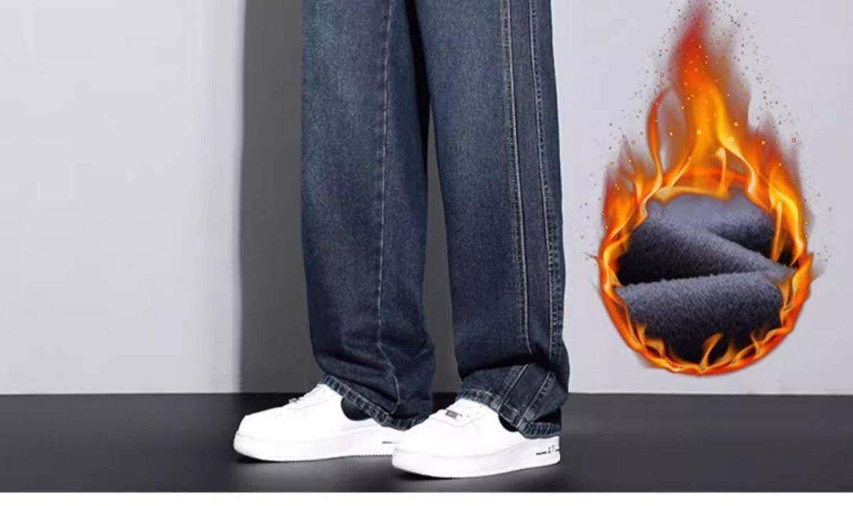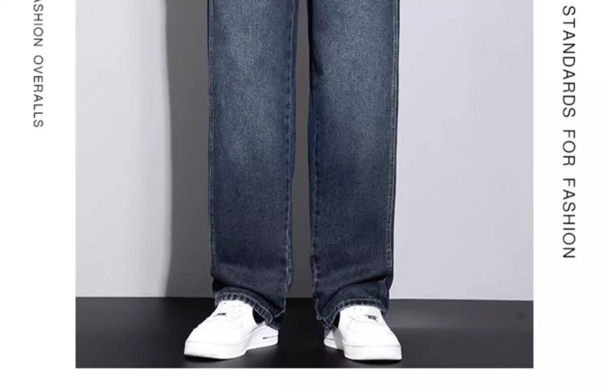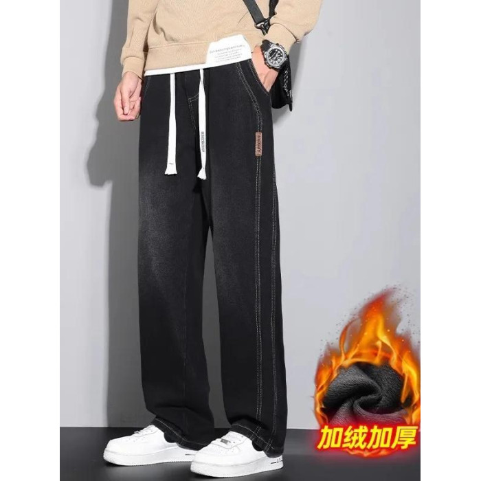 美式復古濶腿男士牛仔褲直筒加絨加厚寬鬆秋冬季新款2024休閒長褲