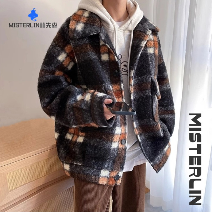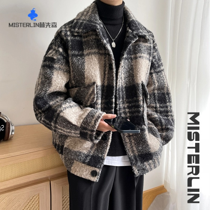小香風格子毛呢外套男春秋冬季港風潮牌寬鬆加厚保暖休閒繙領夾克
