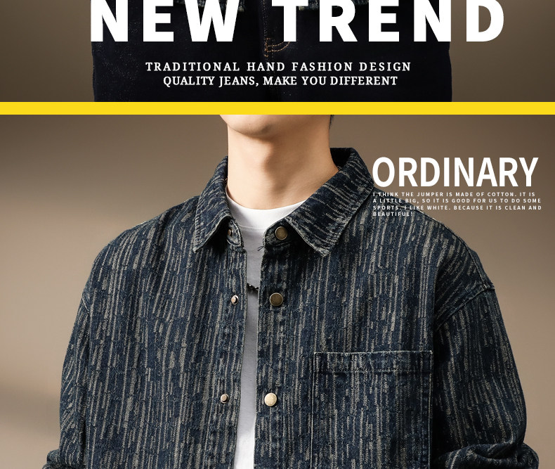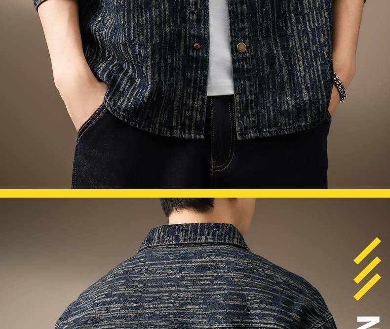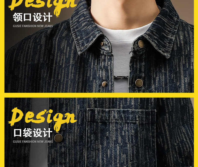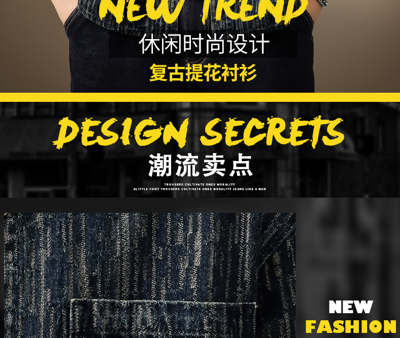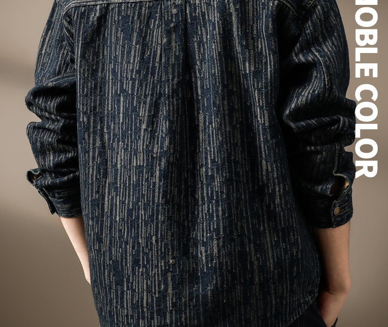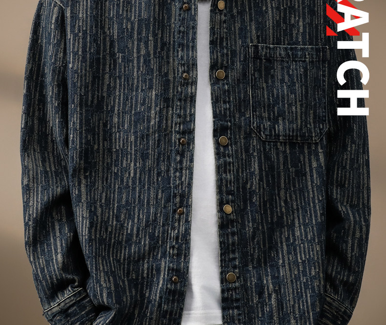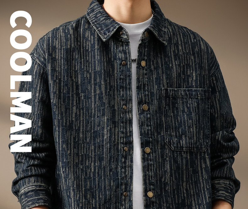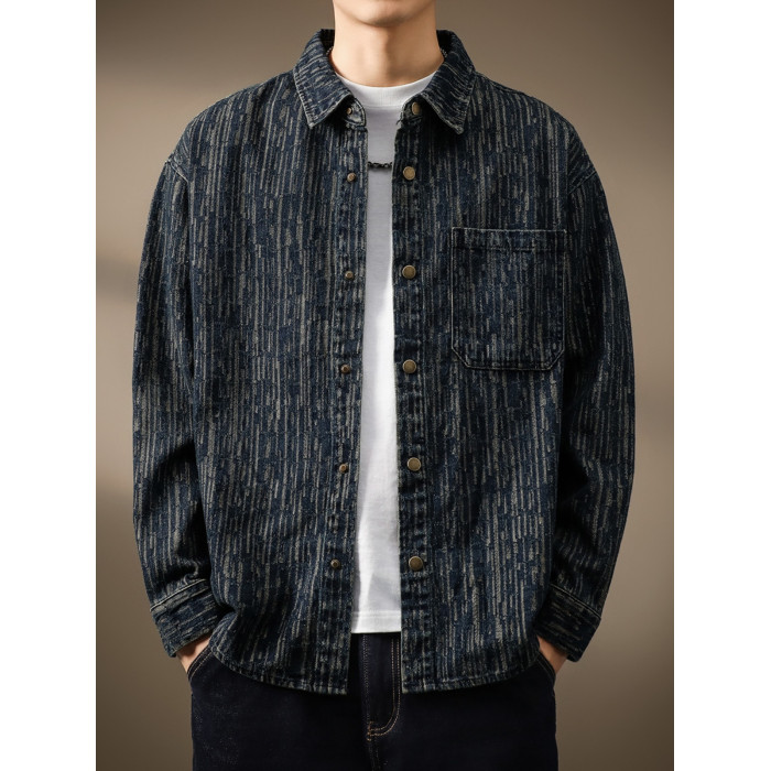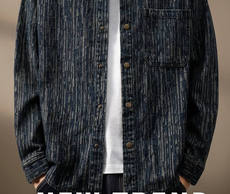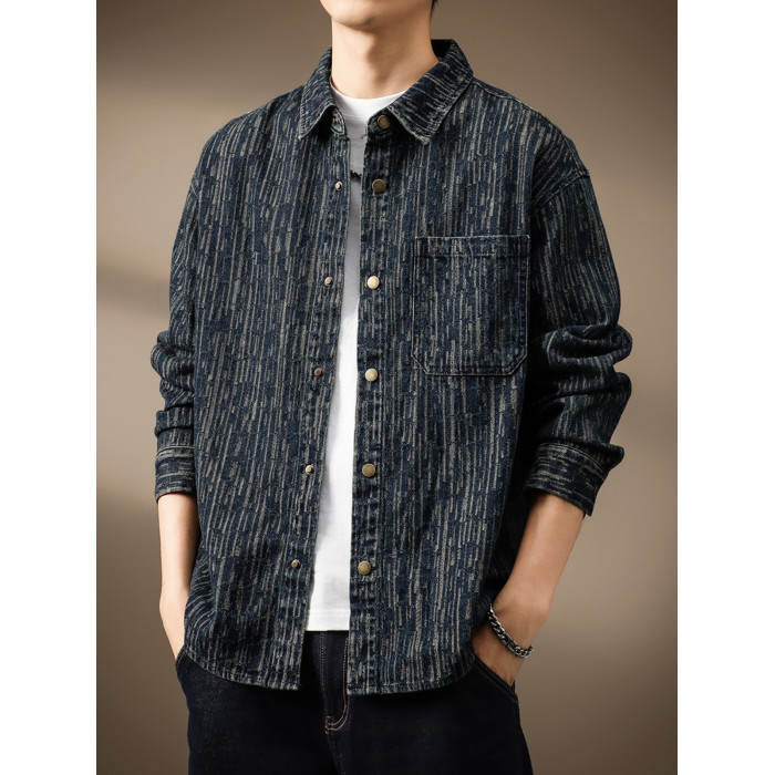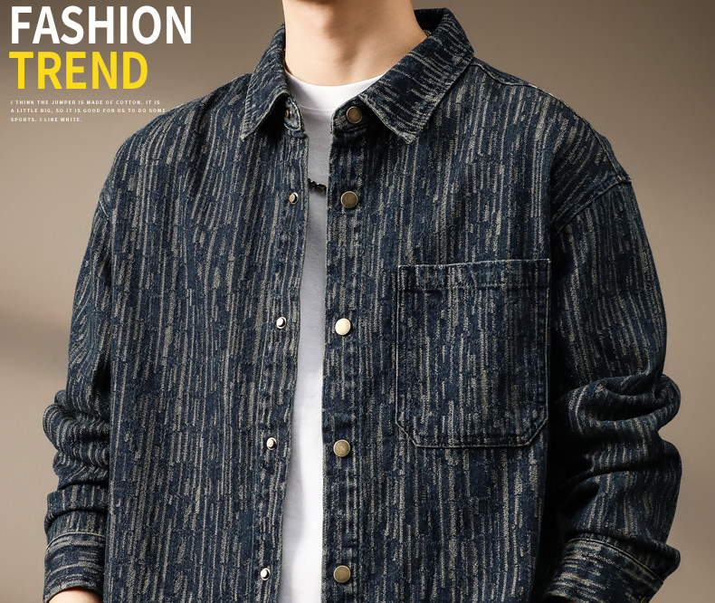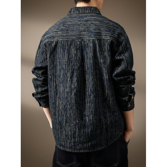 高級美式復古提花牛仔襯衫男寬鬆大碼秋季新款條紋水洗夾克外套潮