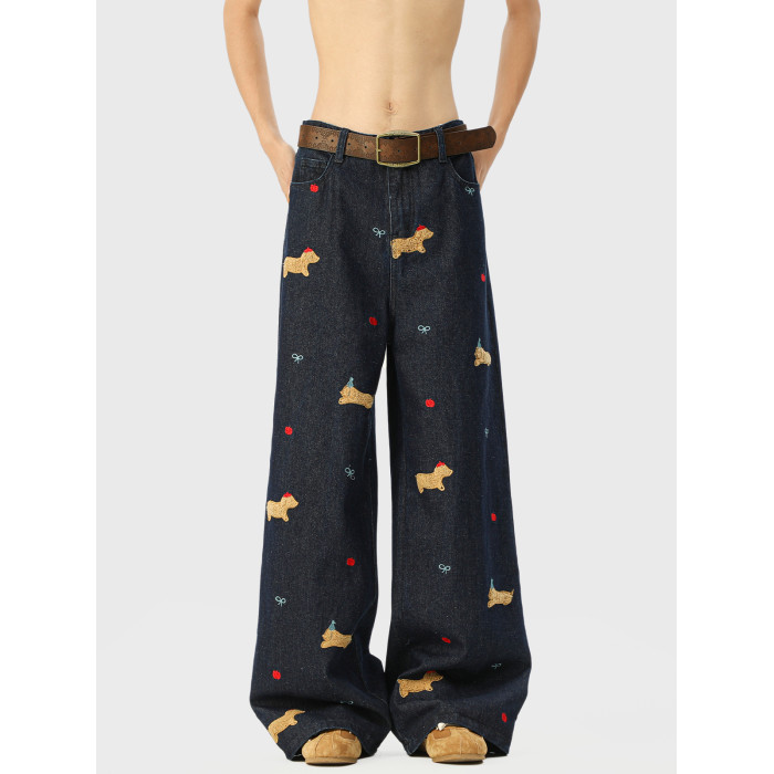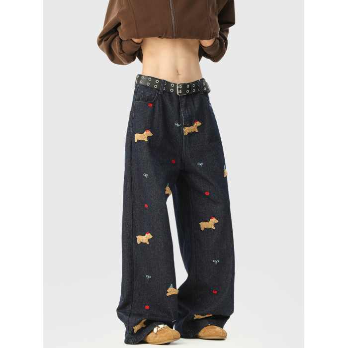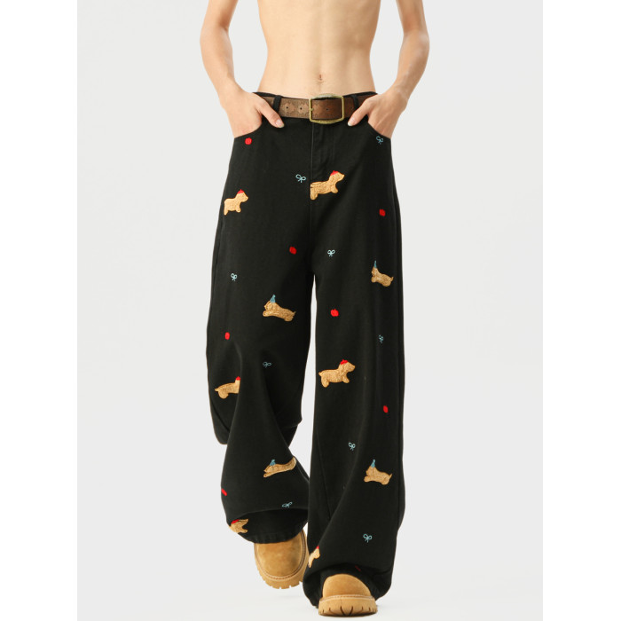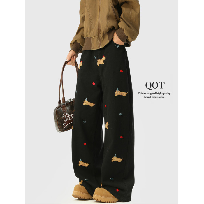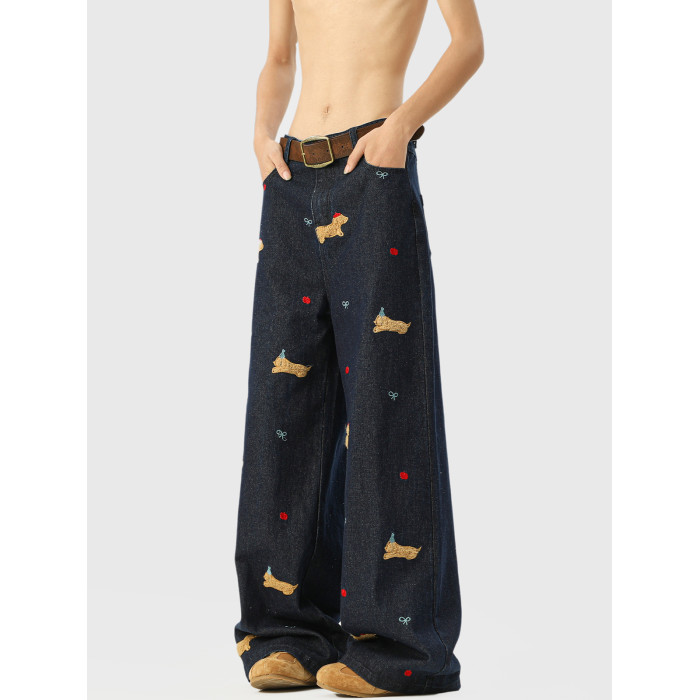美式臘腸狗貼布牛仔褲男女秋季百搭設計感濶腿長褲刺綉直筒拖地褲