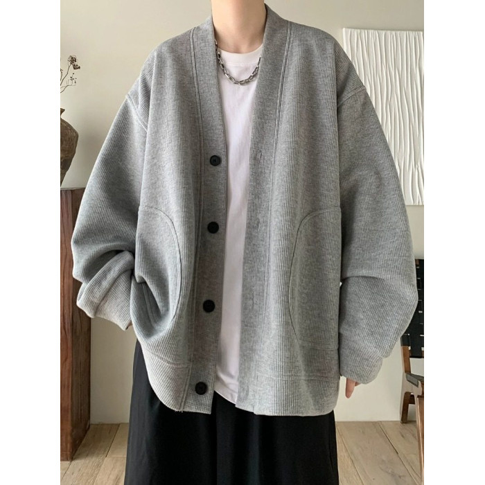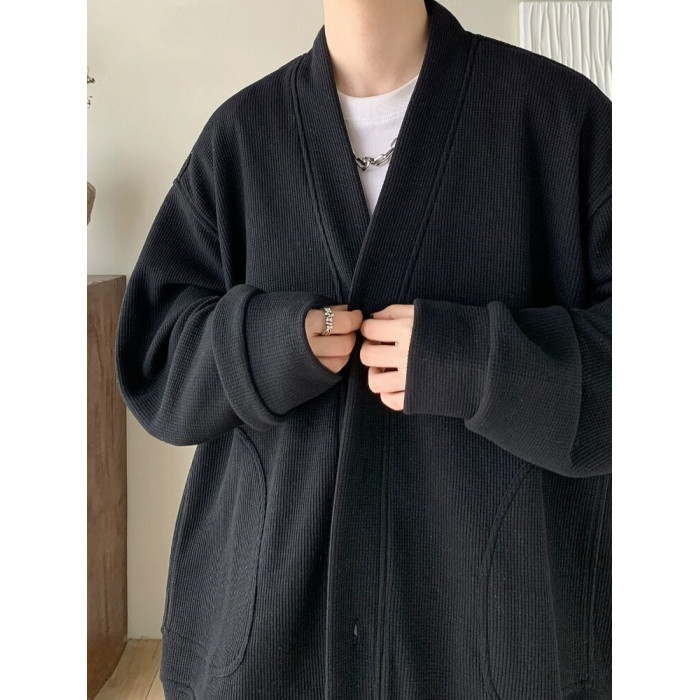 純黑色日系慵懶風外套男潮高級感華夫格V領針織開衫情侶春秋夾克