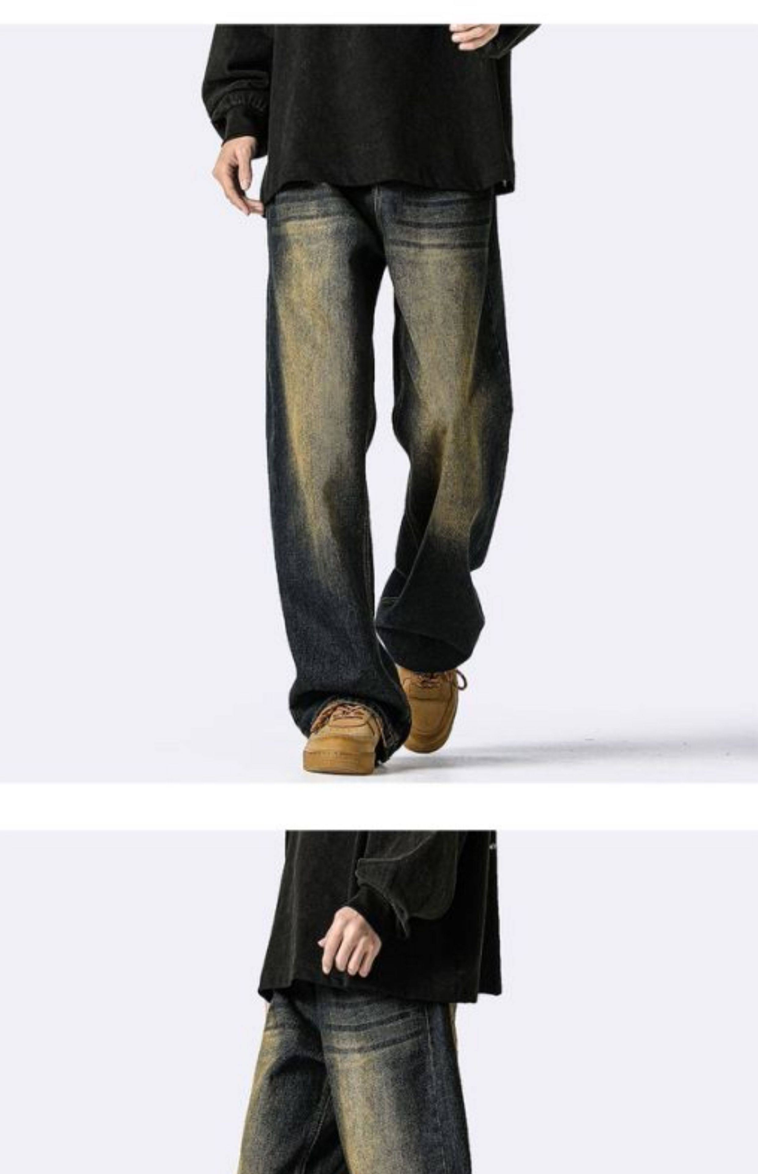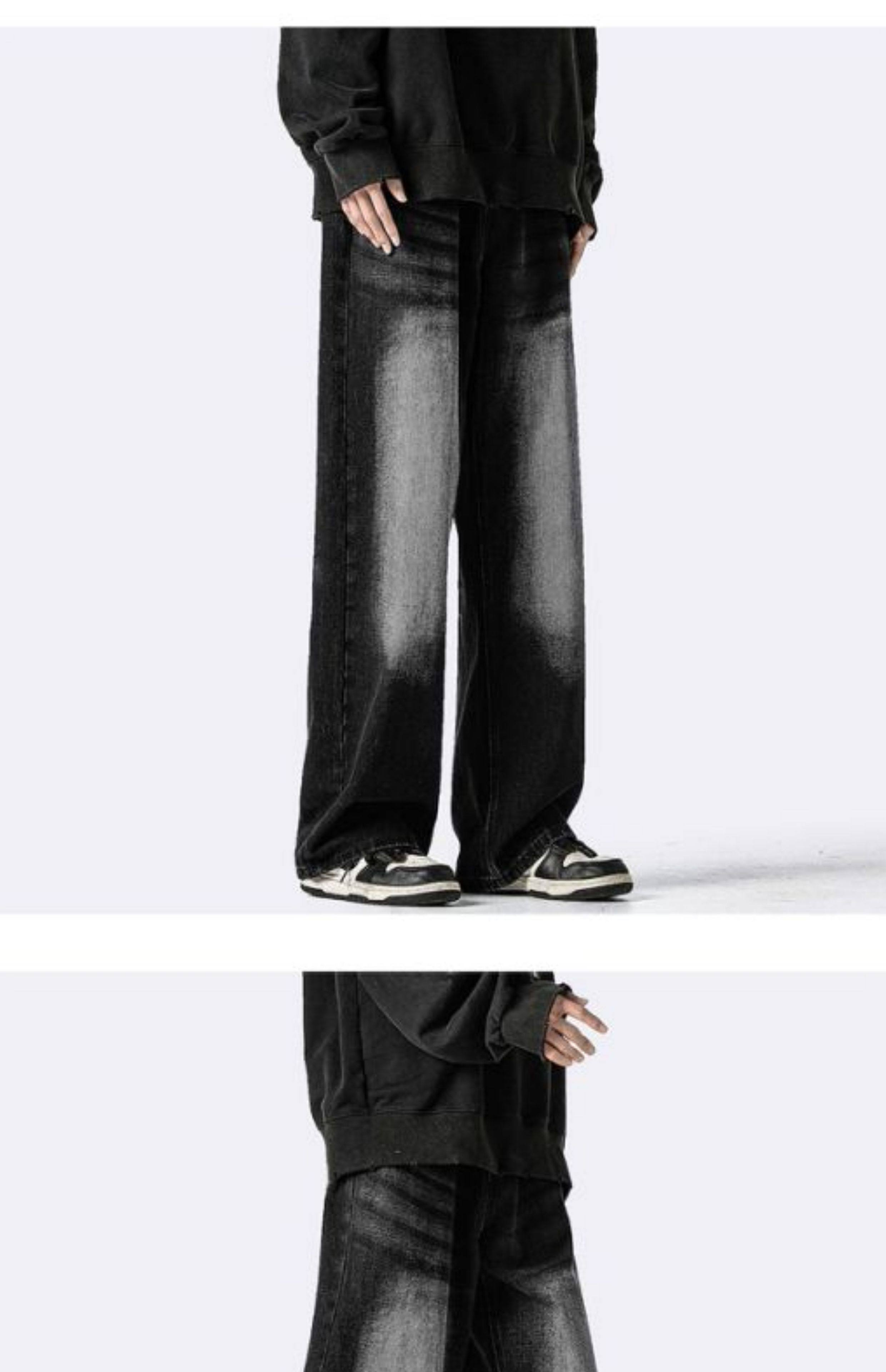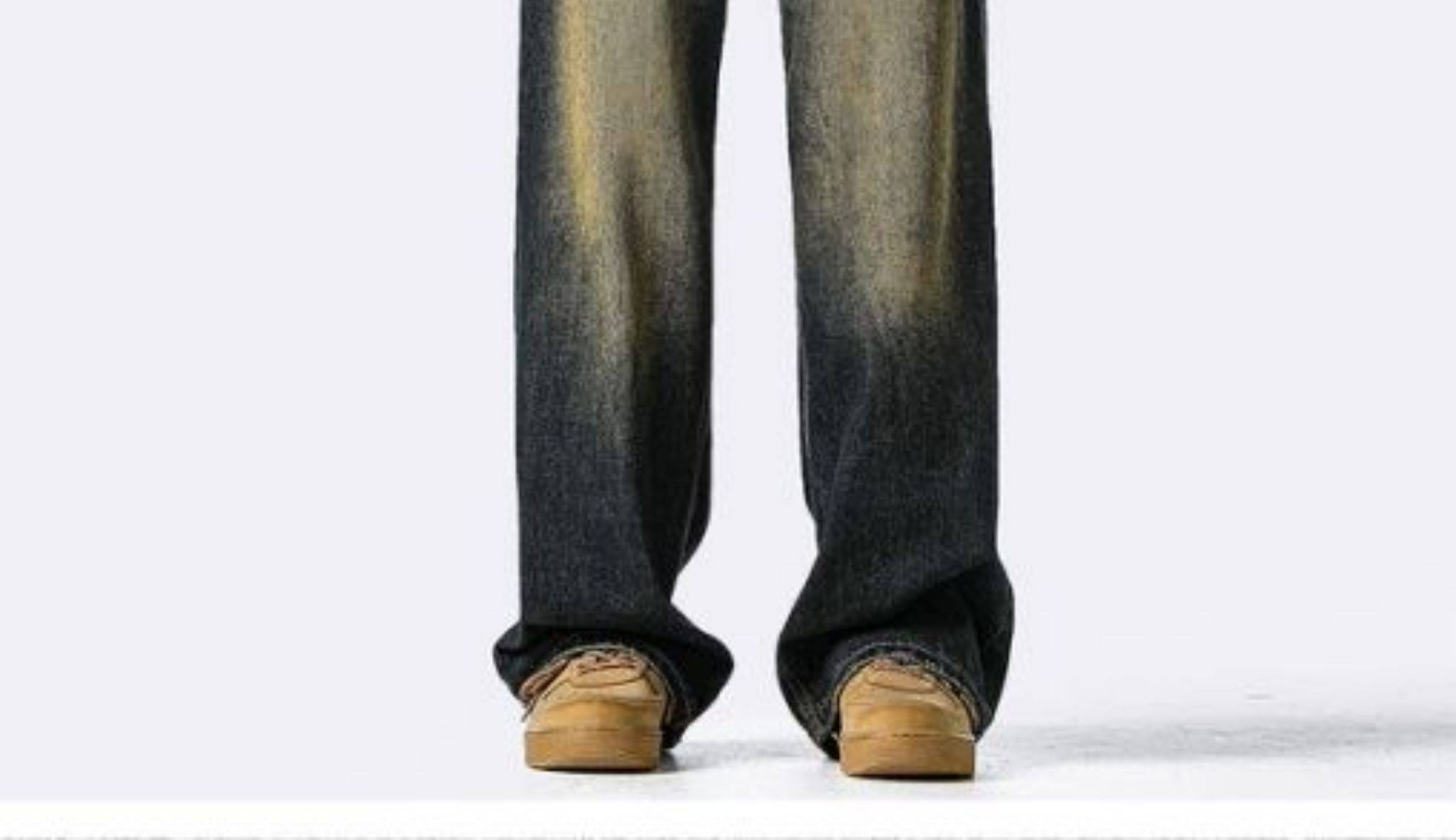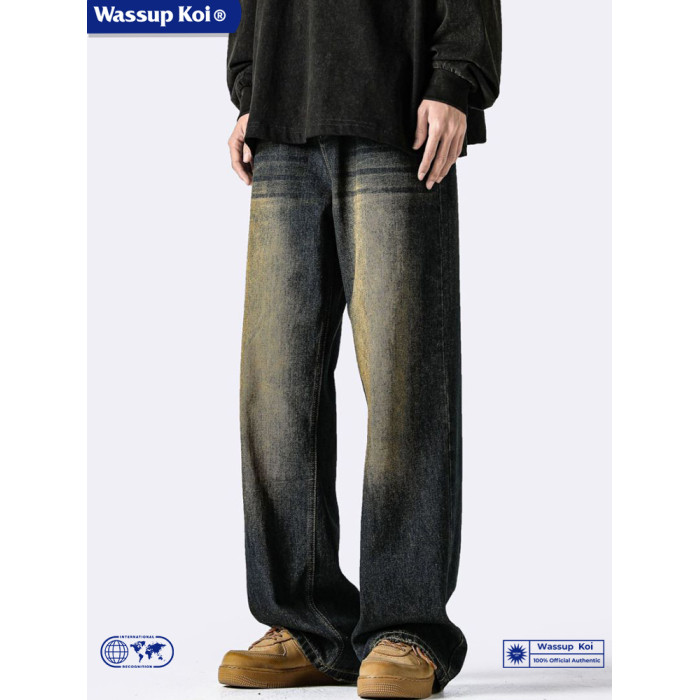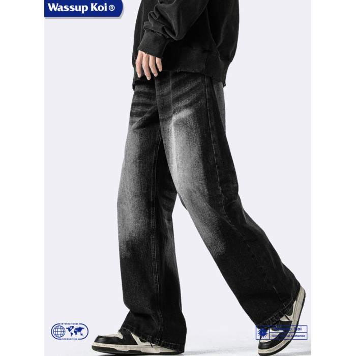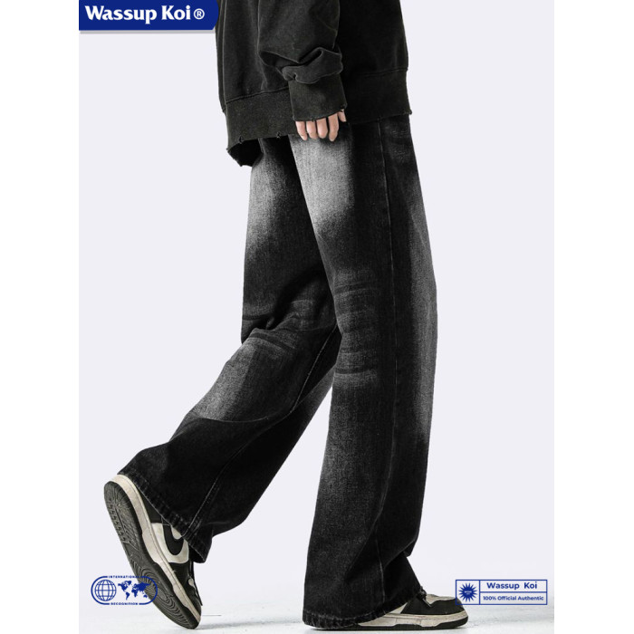 WASSUP KOI復古做舊水洗直筒牛仔褲男秋季美式高街寬鬆濶腿褲子潮