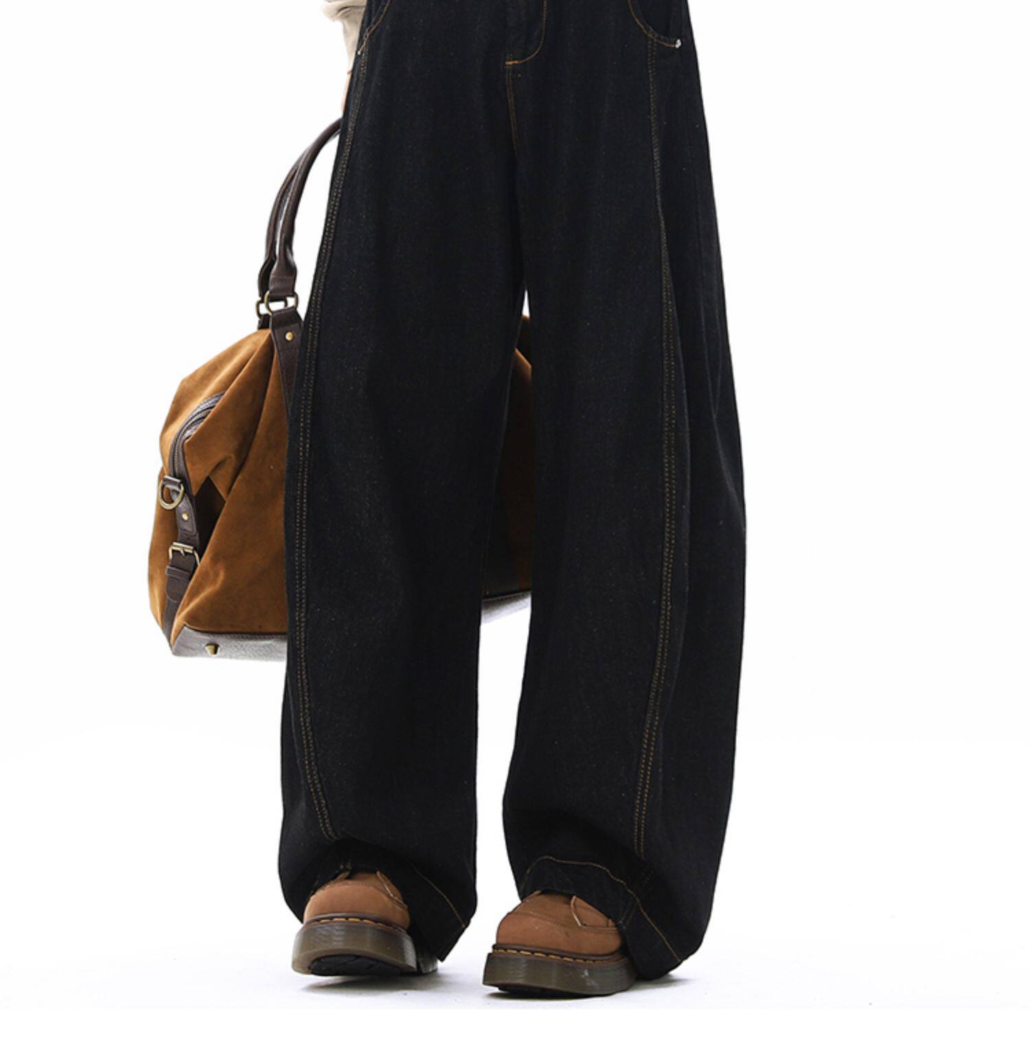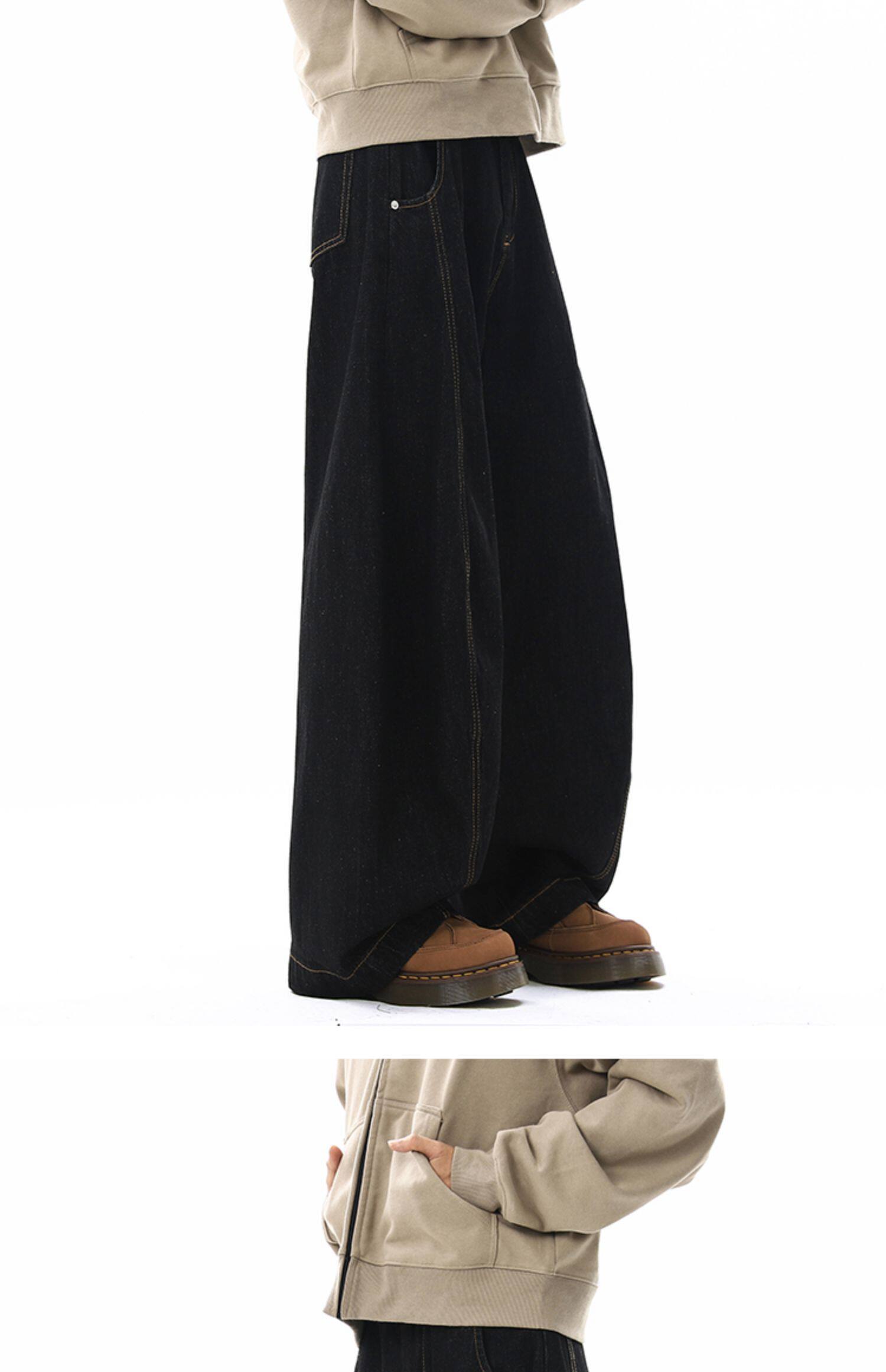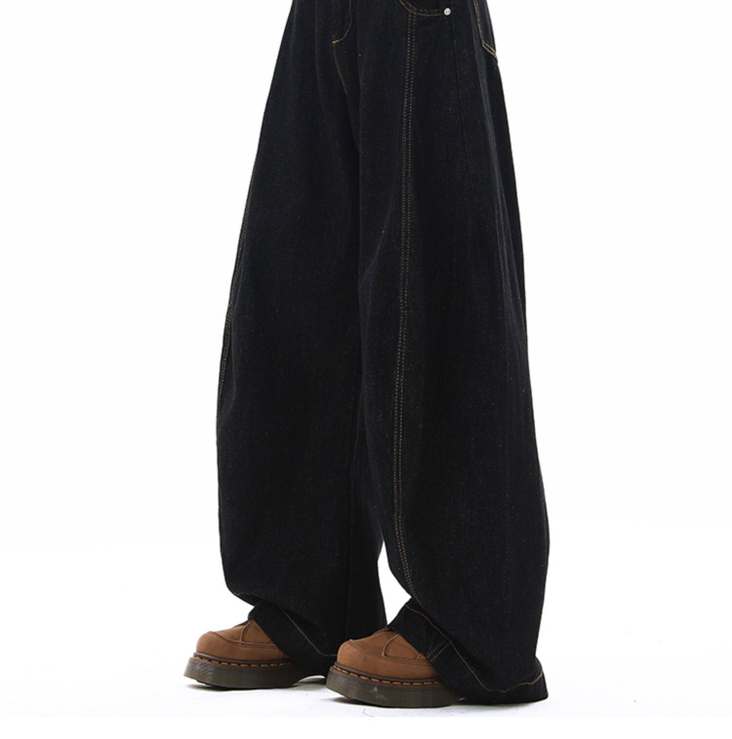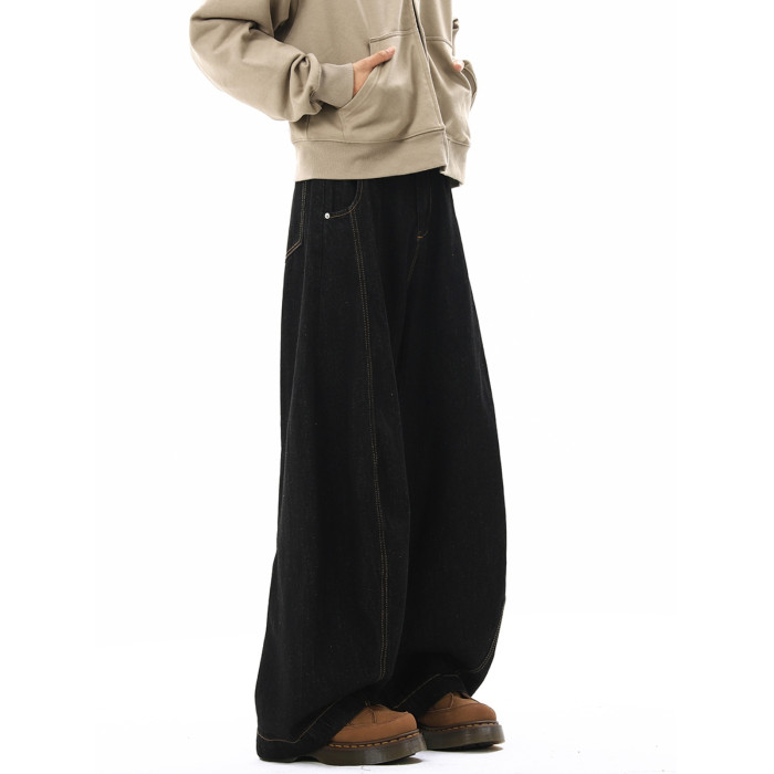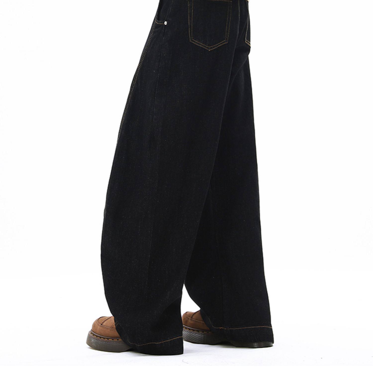 美式丹甯黑色彎刀濶腿牛仔褲男高街潮牌寬鬆高級感直筒拖地長褲子