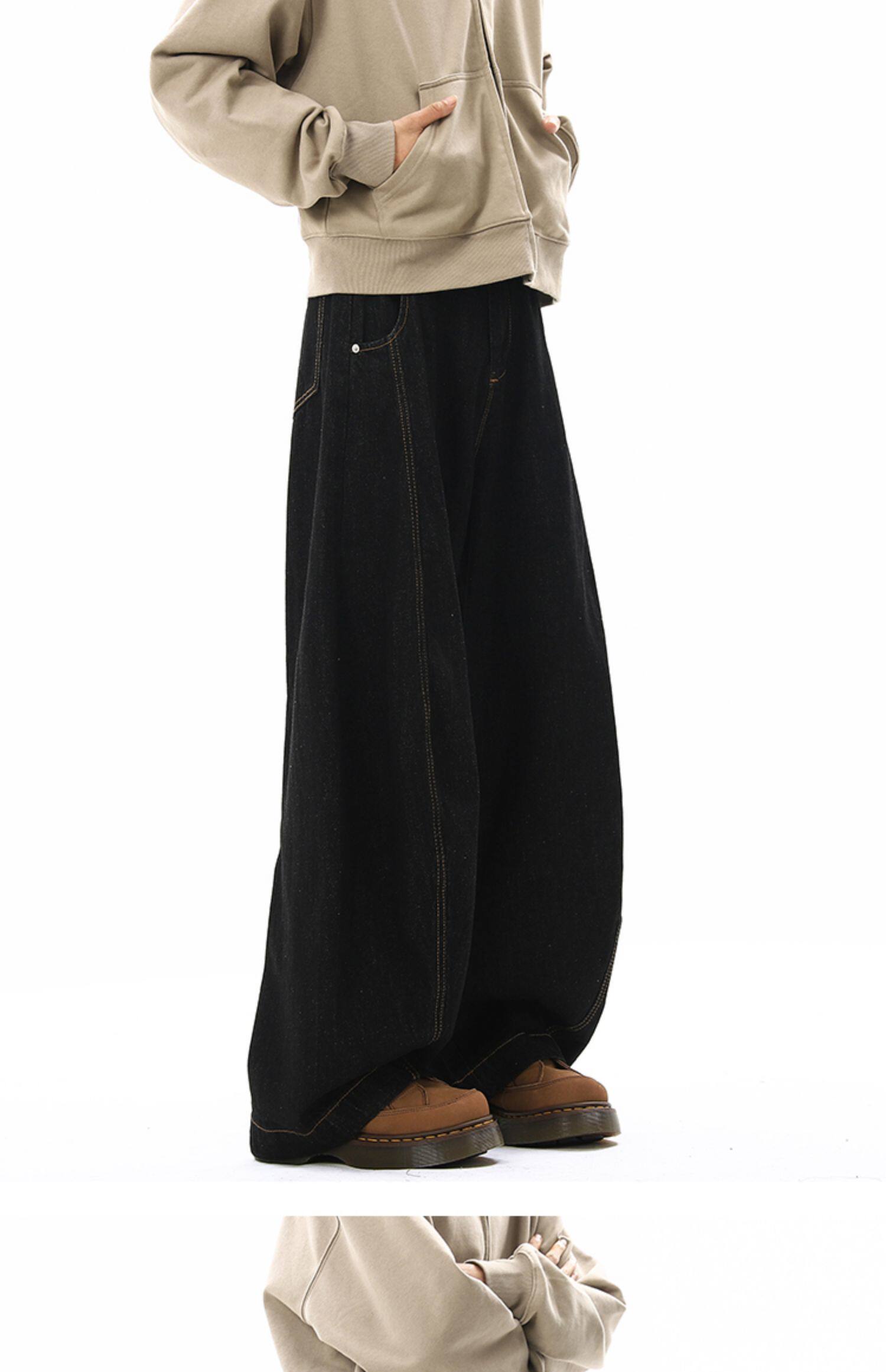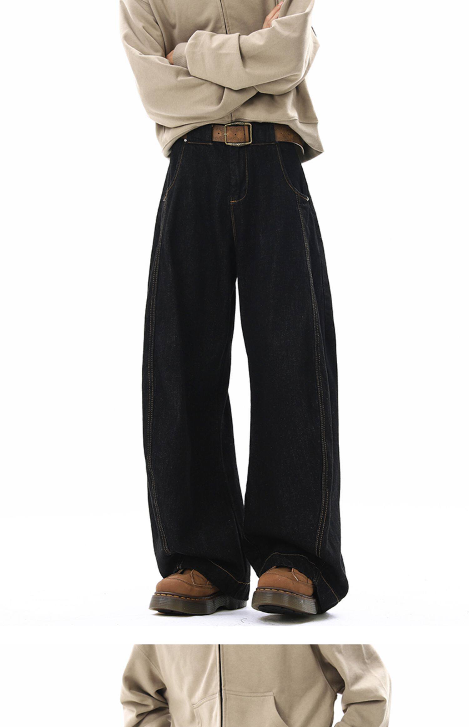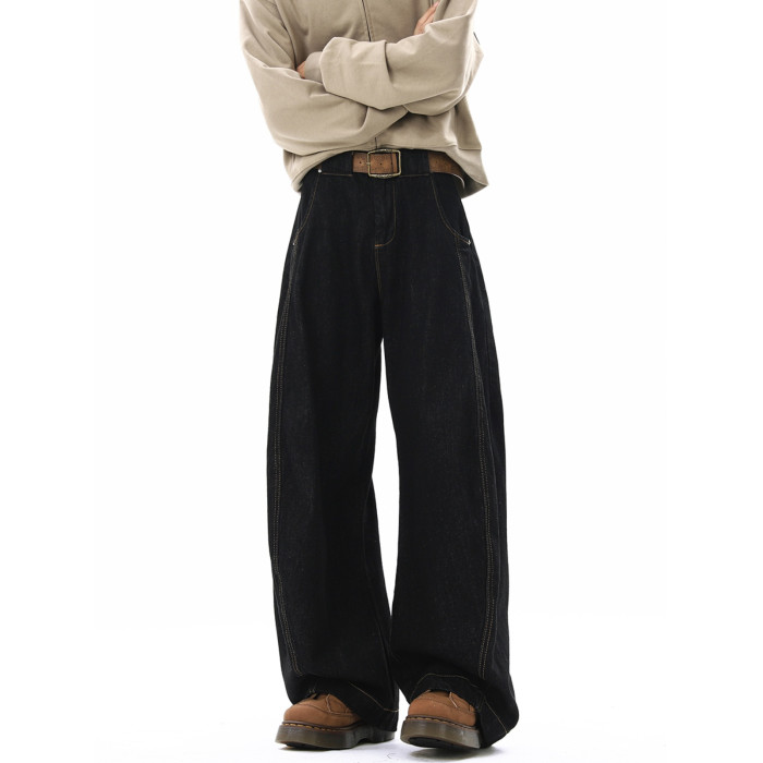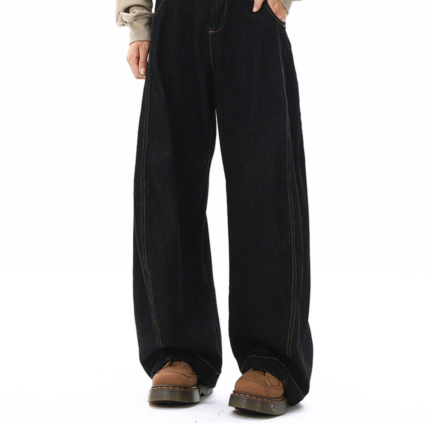 美式丹甯黑色彎刀濶腿牛仔褲男高街潮牌寬鬆高級感直筒拖地長褲子