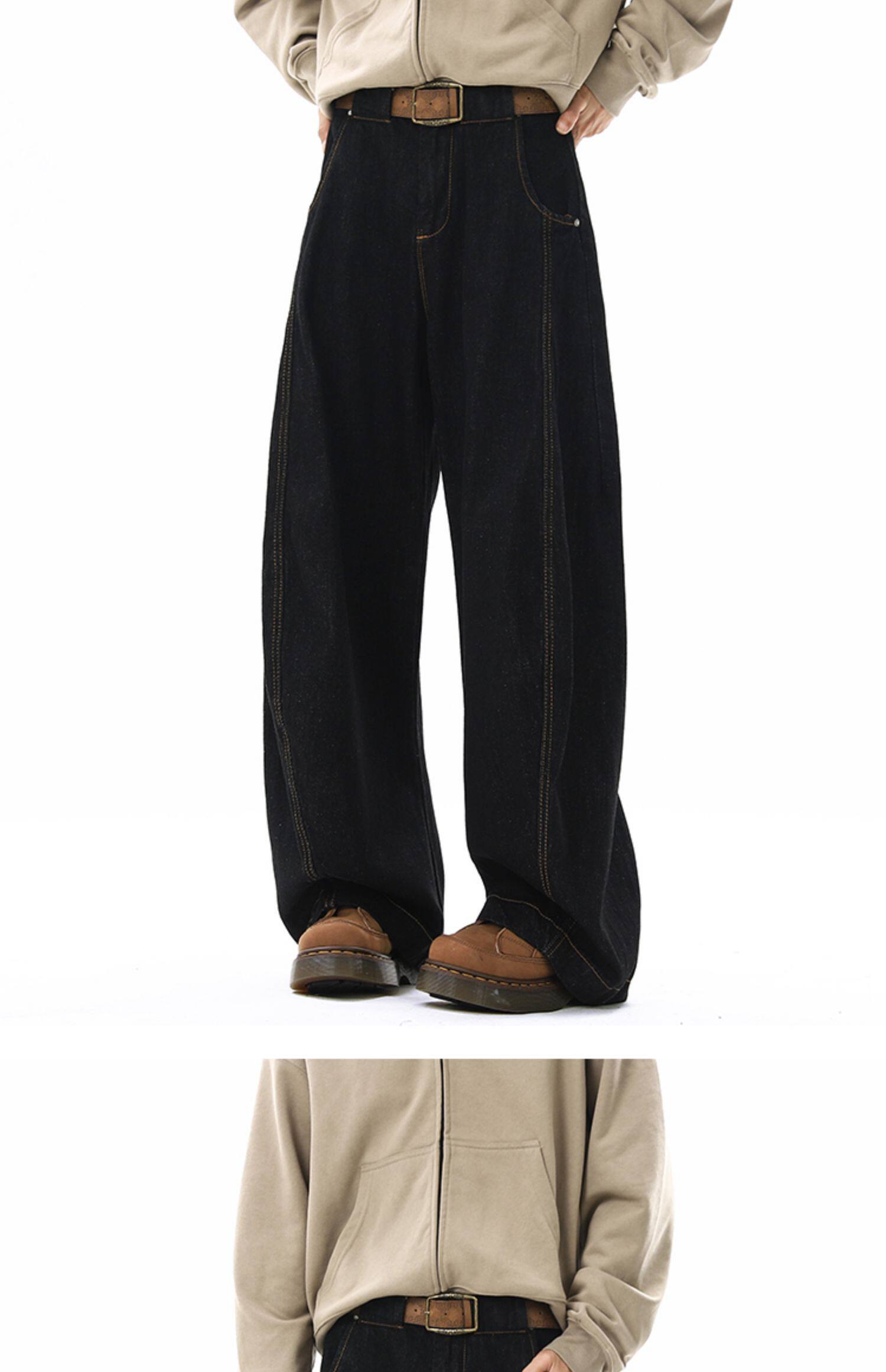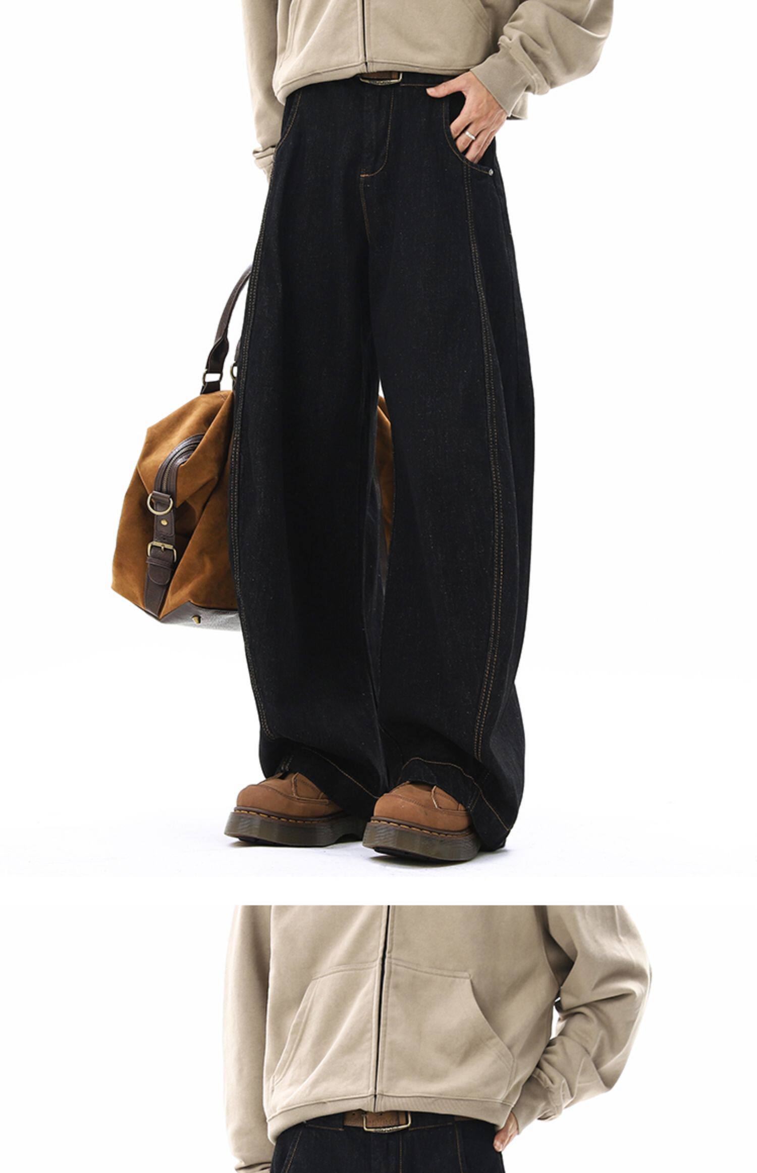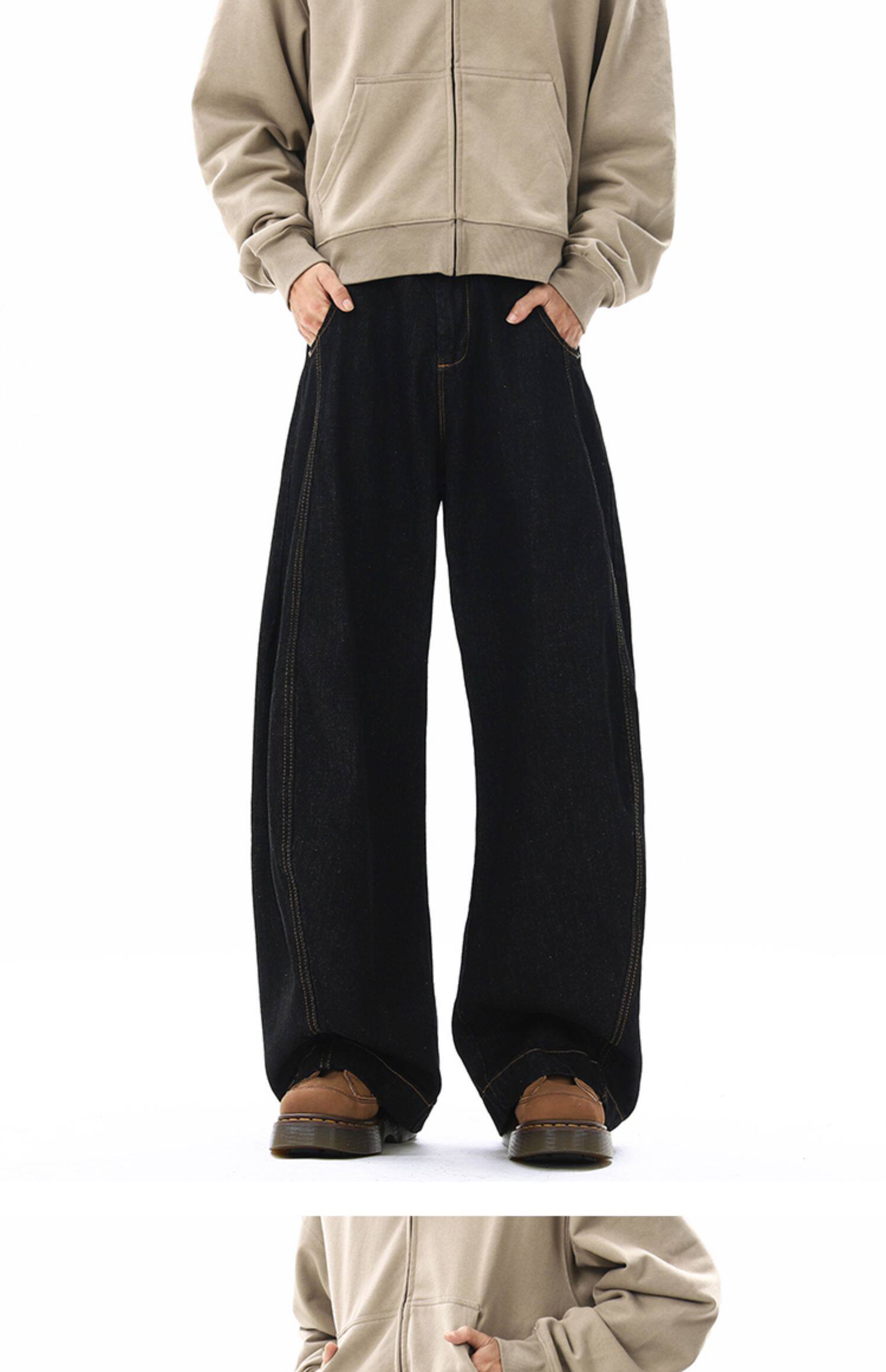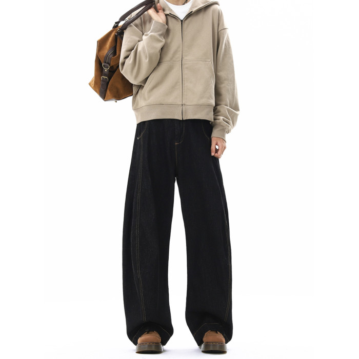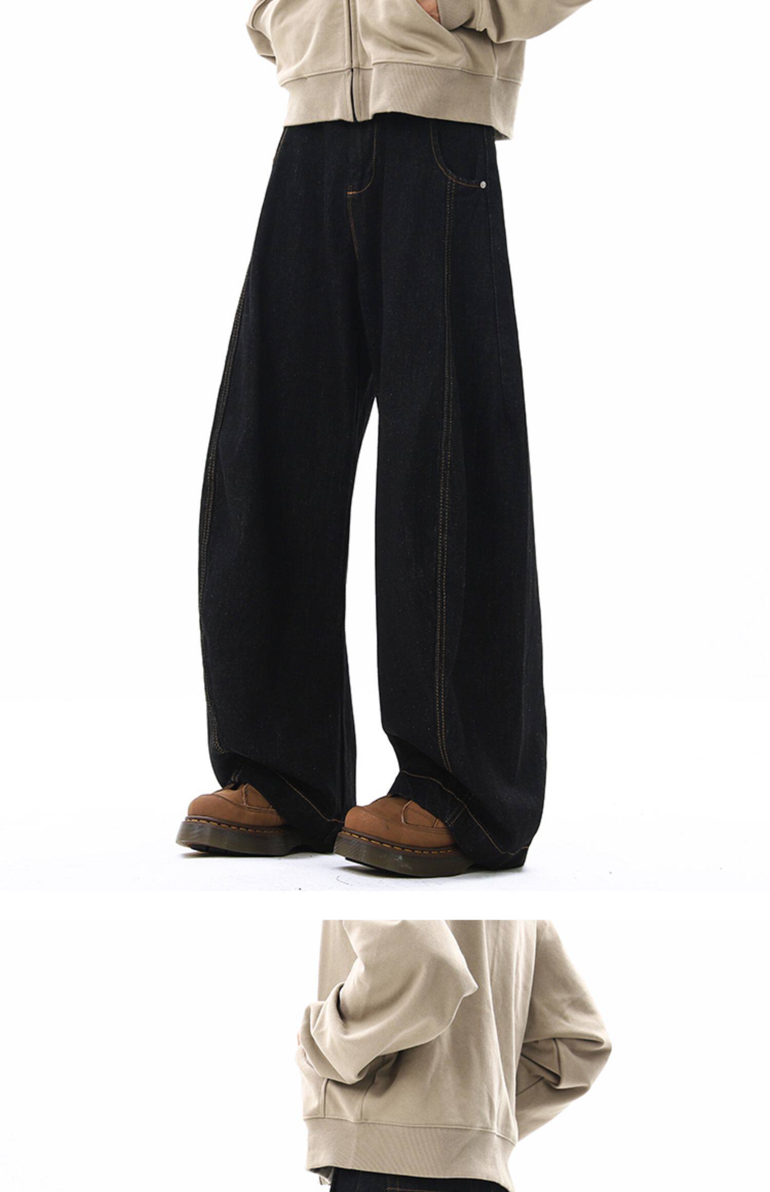 美式丹甯黑色彎刀濶腿牛仔褲男高街潮牌寬鬆高級感直筒拖地長褲子