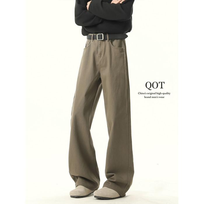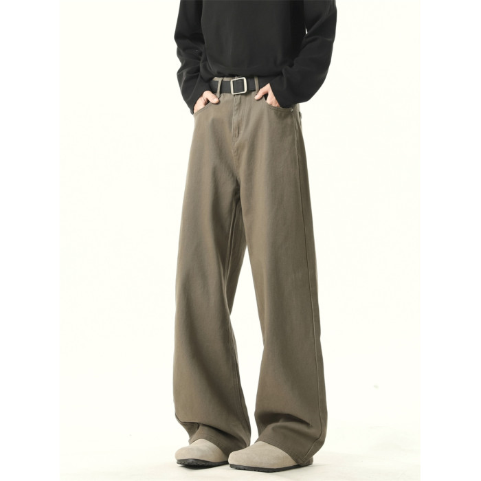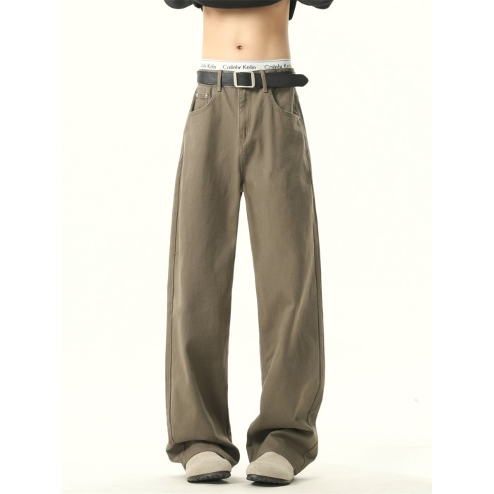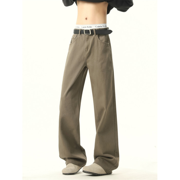 美式棕色休閒牛仔褲男女秋季潮cleanfit水洗休閒褲復古直筒微喇褲