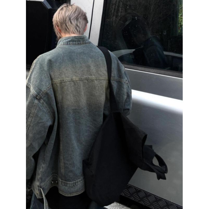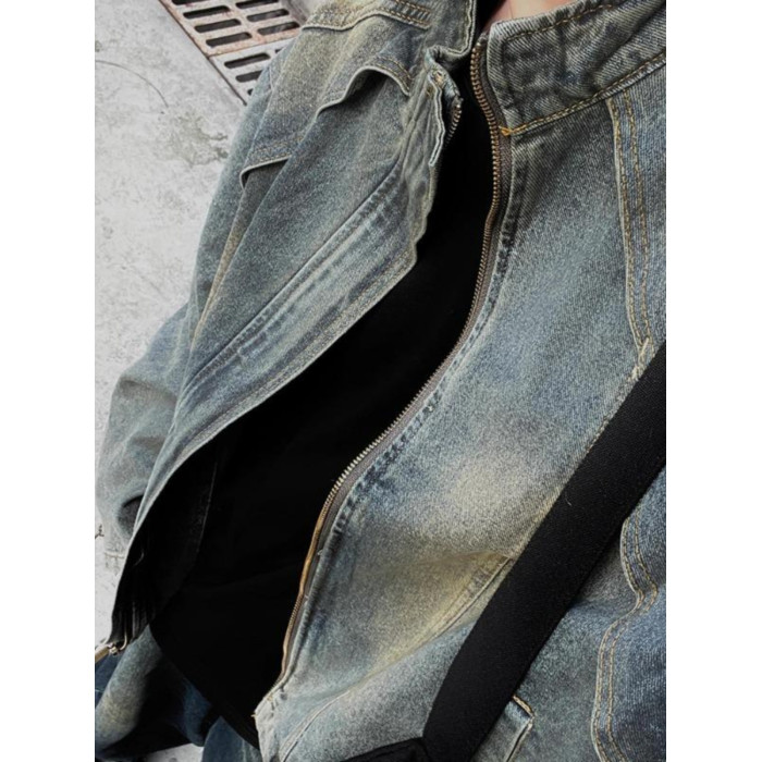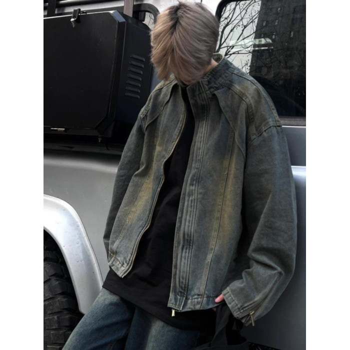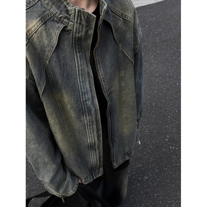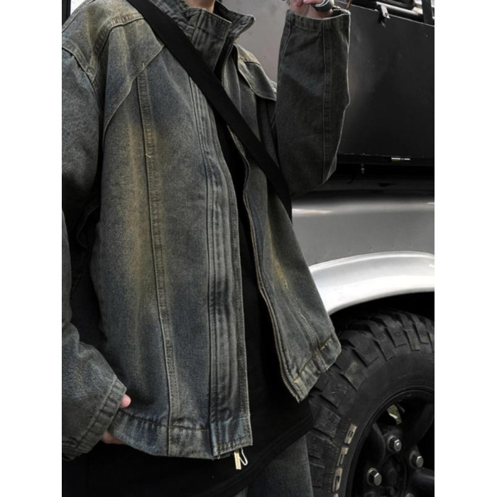 美式復古水洗做舊黃泥染立領牛仔夾克男春秋季痞帥寬鬆拉鍊外套潮