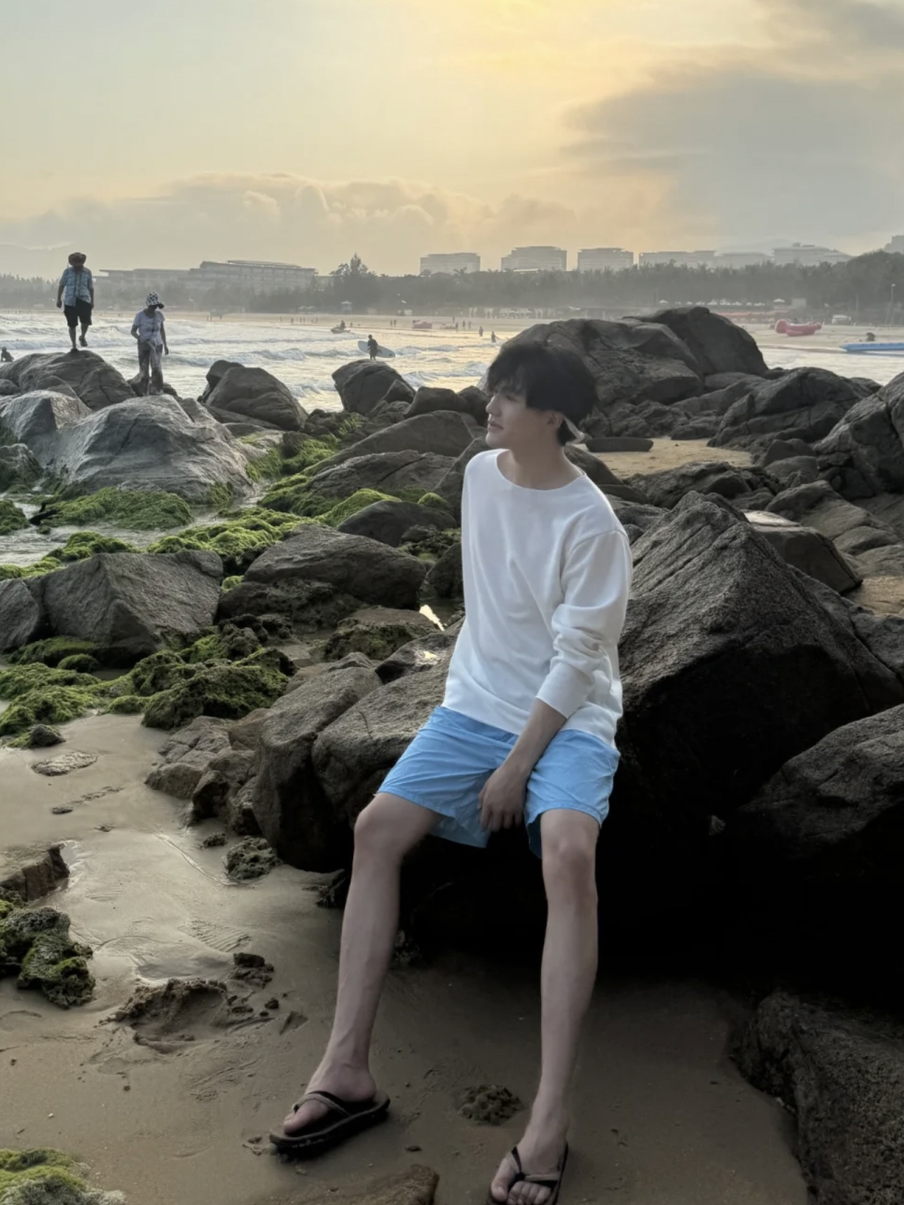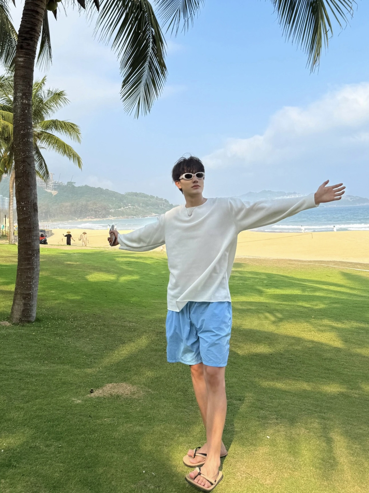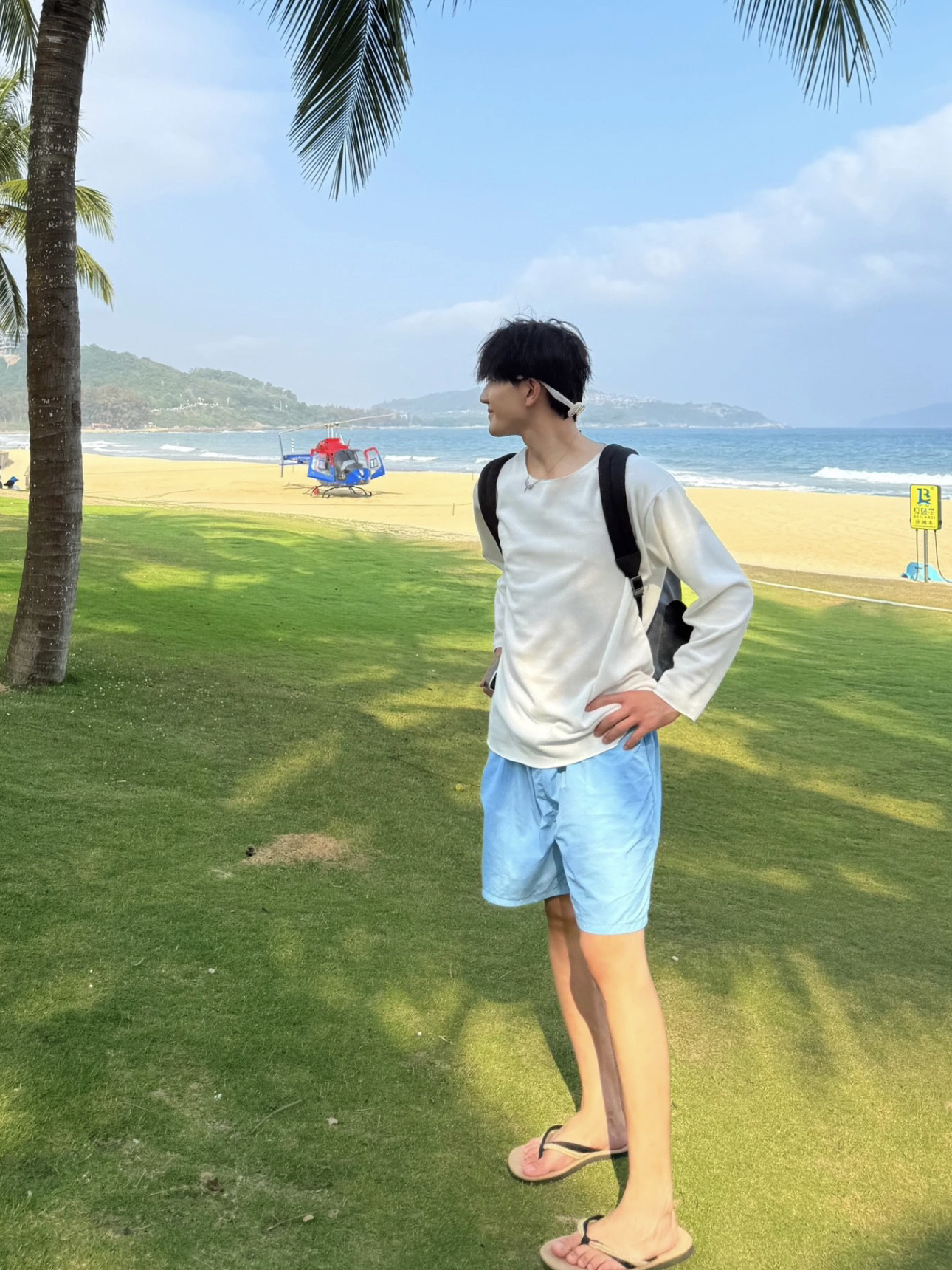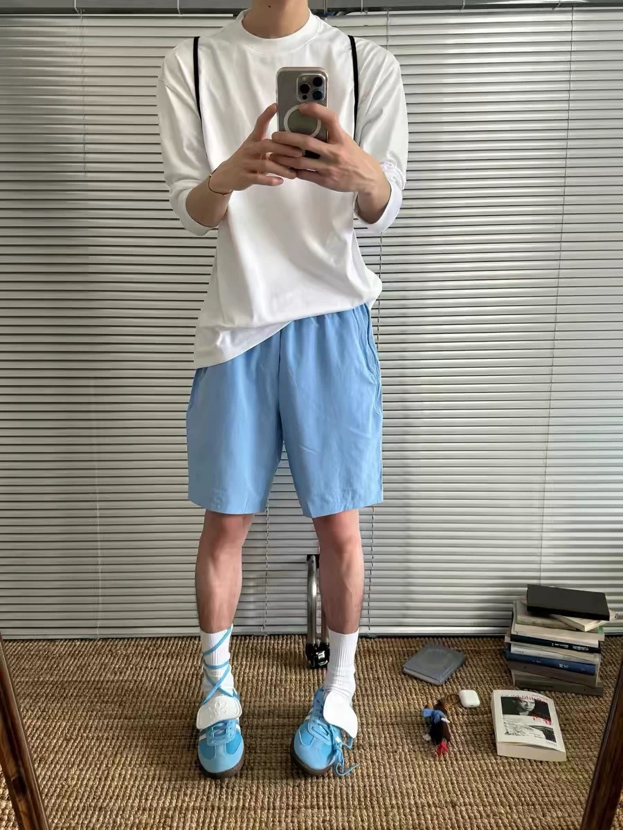 夏日多巴胺穿搭藍色尼龍速乾短褲男海邊沙灘度假休閒不過膝五分褲