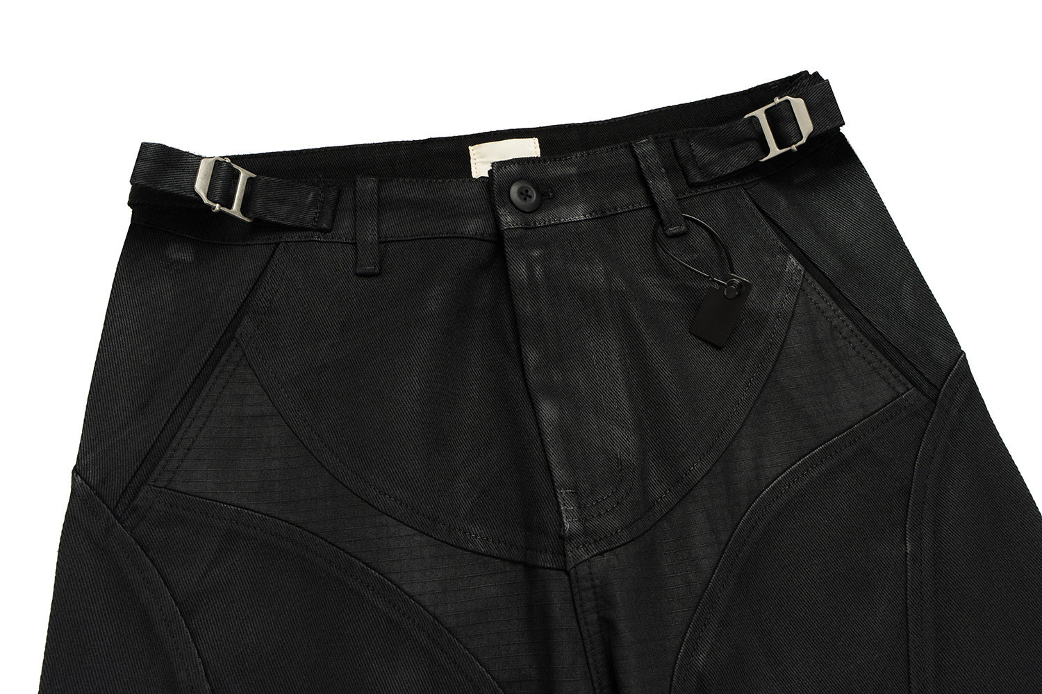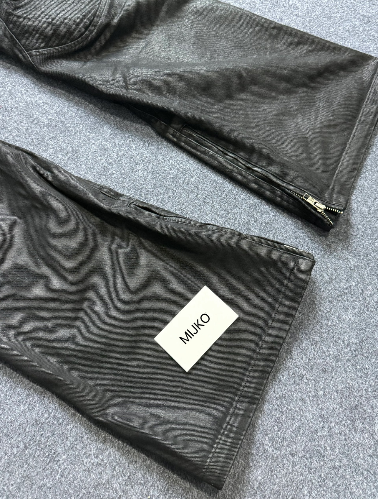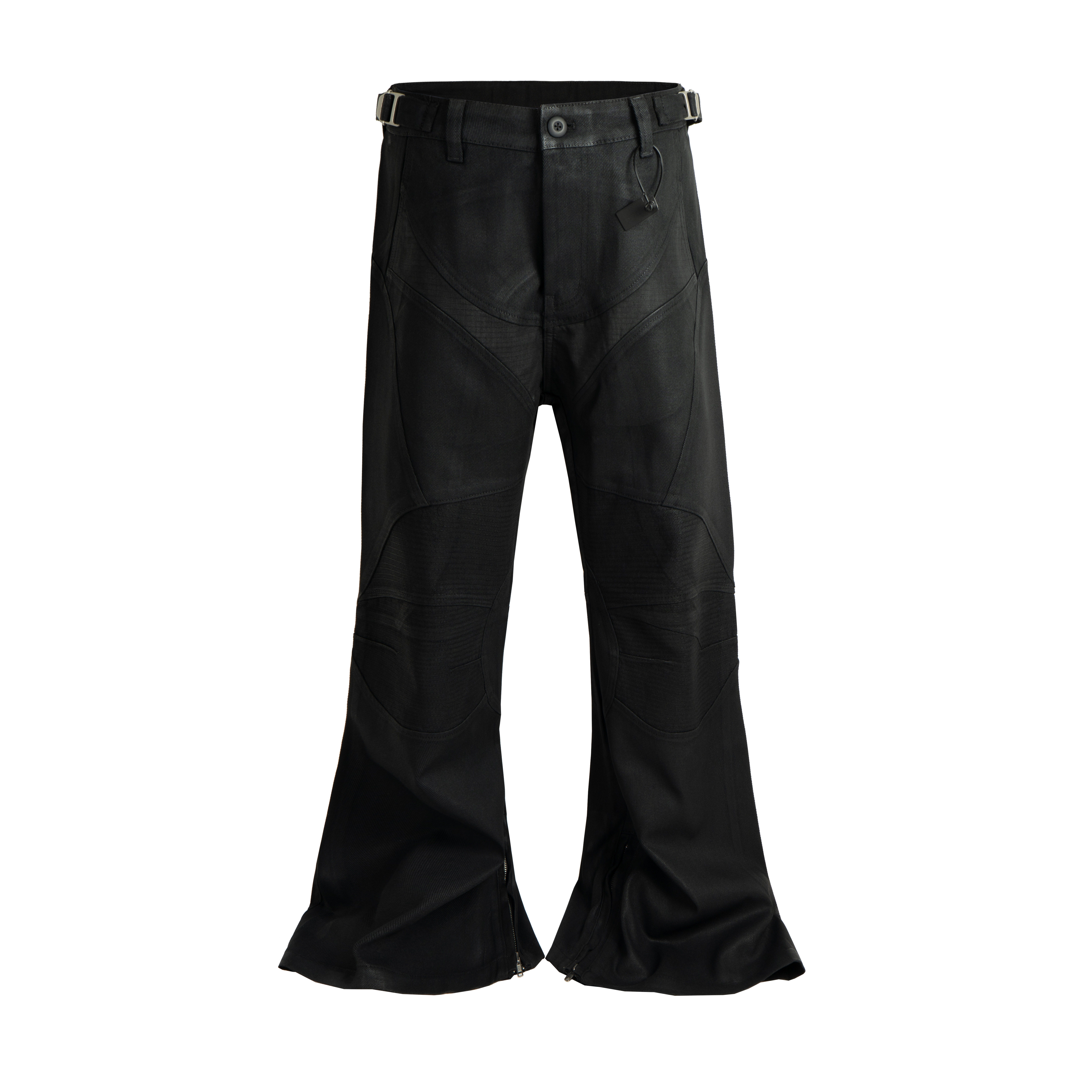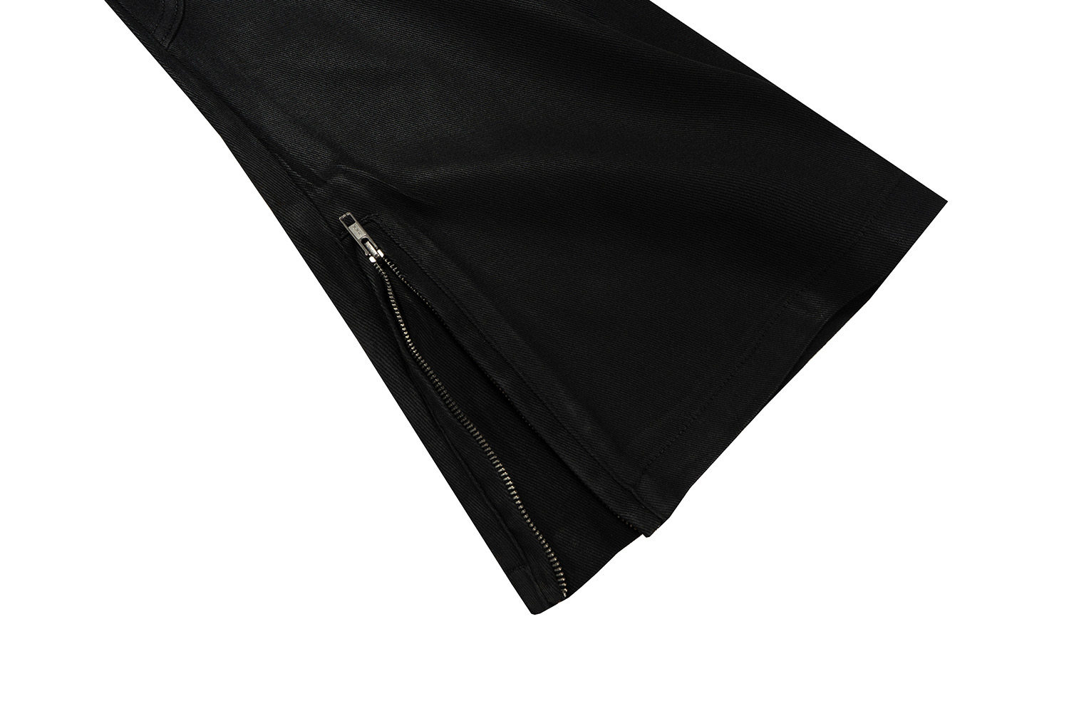 美式vibe風重磅黑色塗層刷蠟機車盔甲拼接褶皺廓形微喇叭牛仔褲男