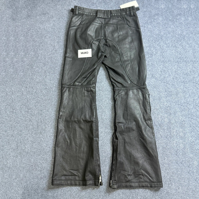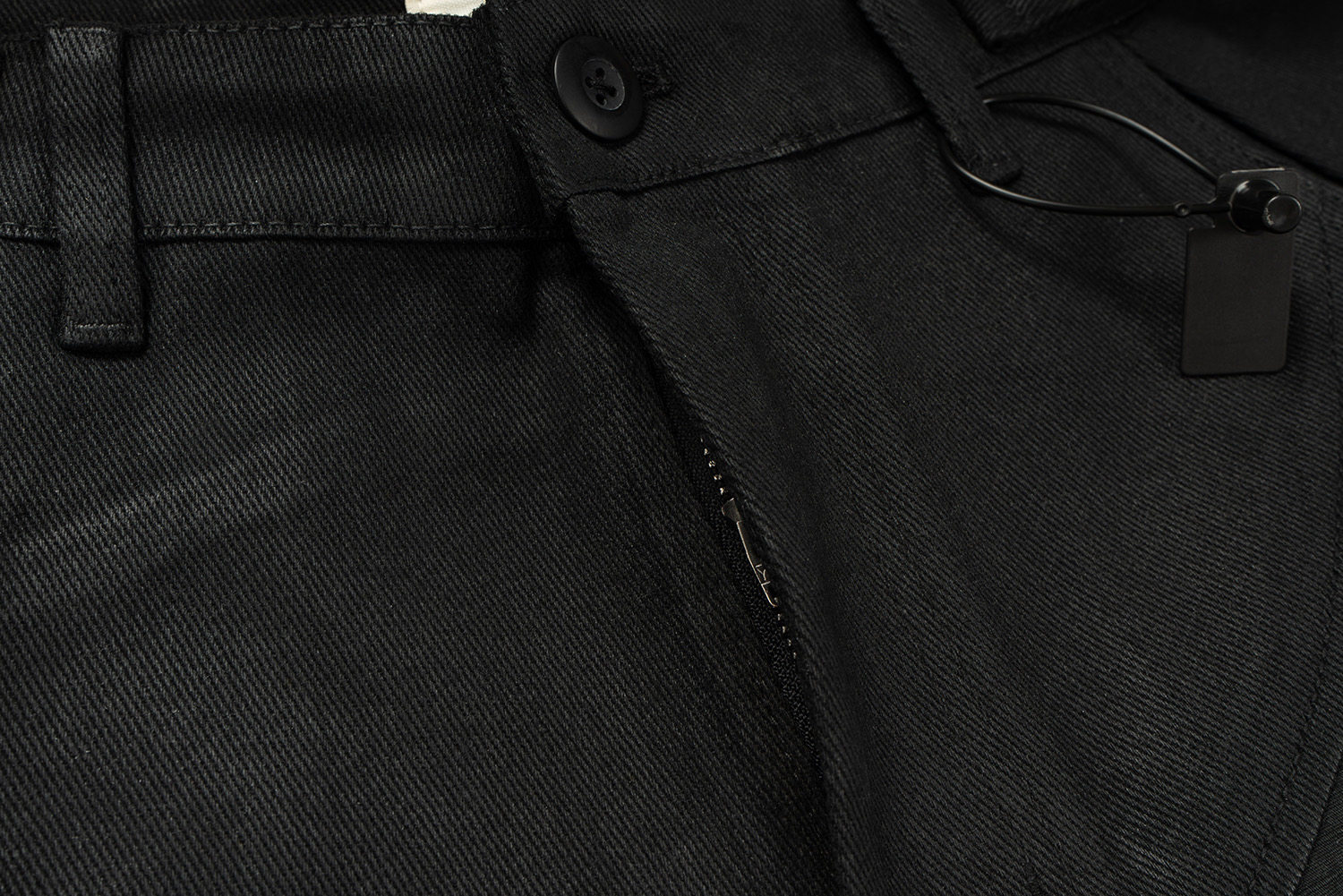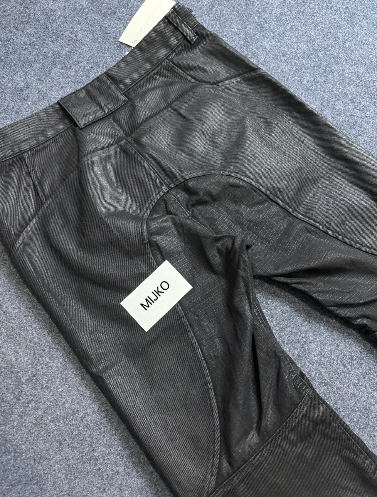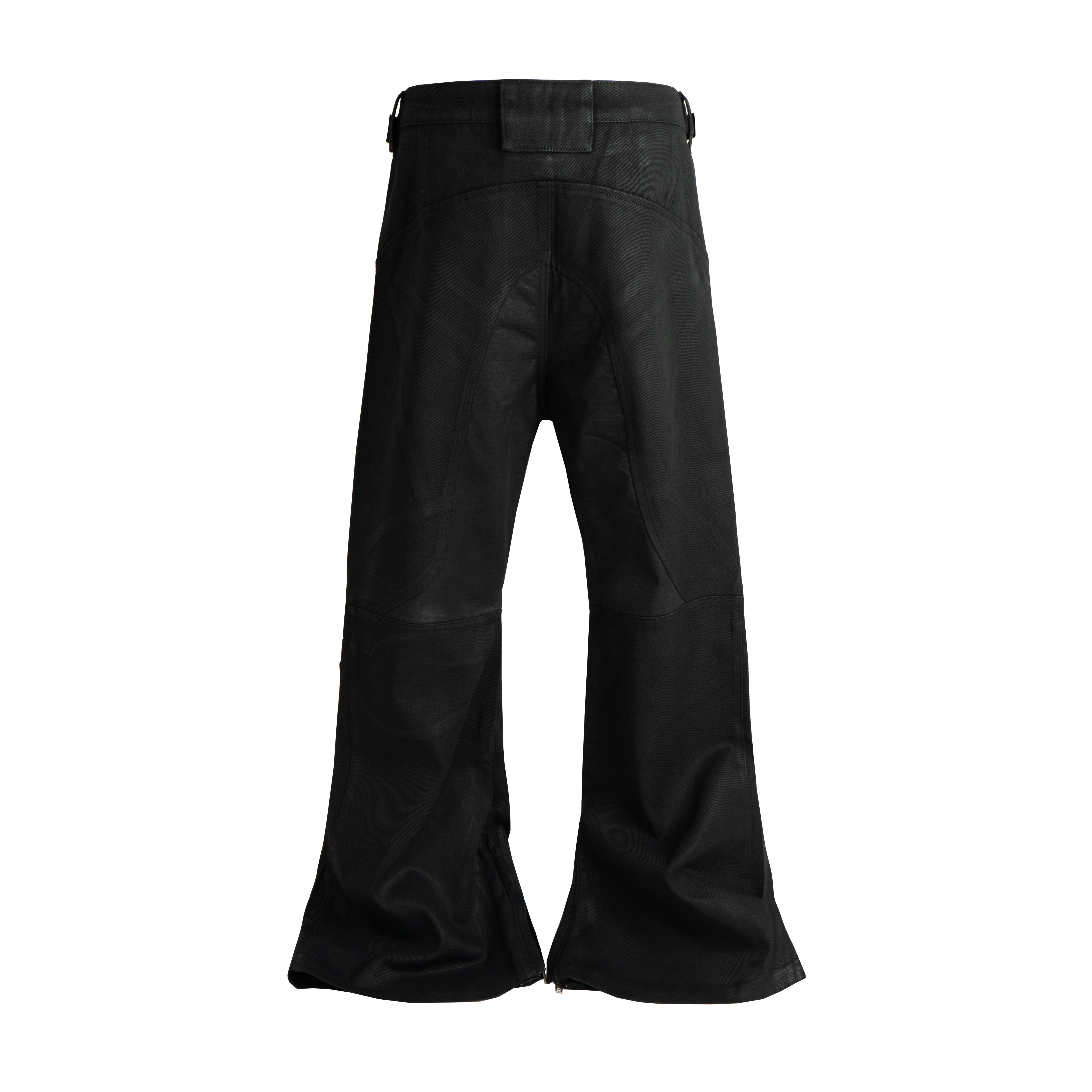 美式vibe風重磅黑色塗層刷蠟機車盔甲拼接褶皺廓形微喇叭牛仔褲男