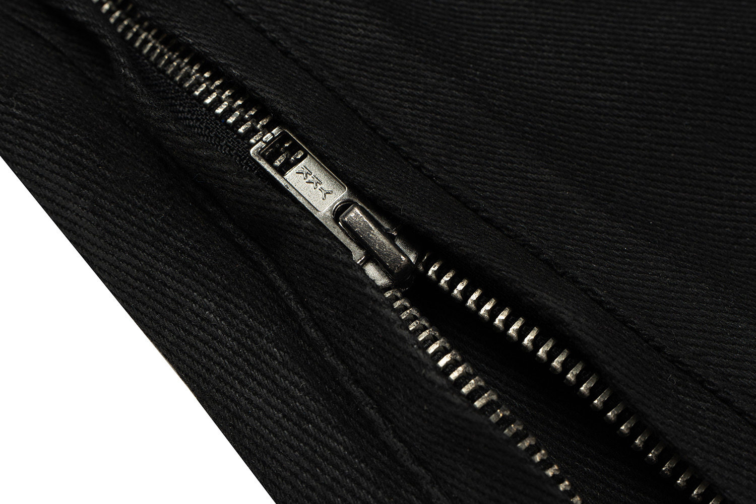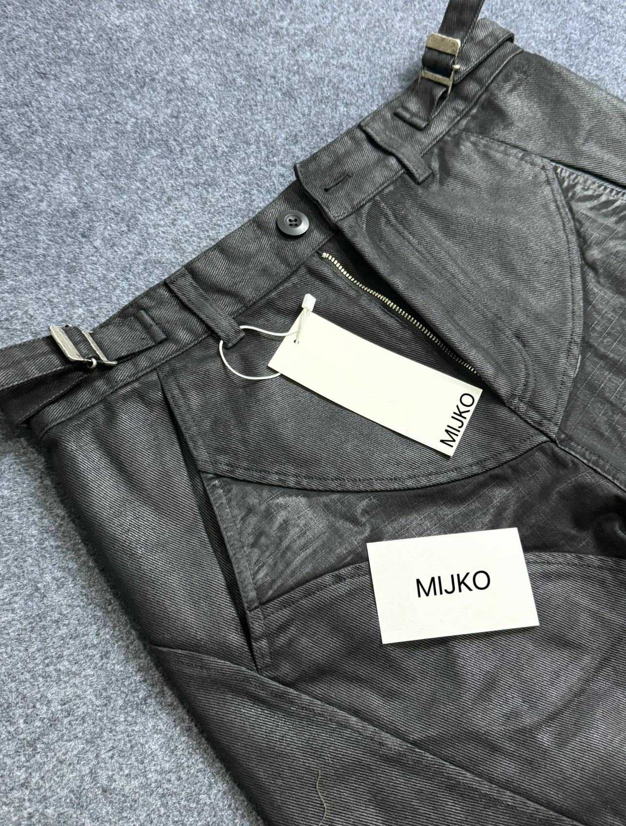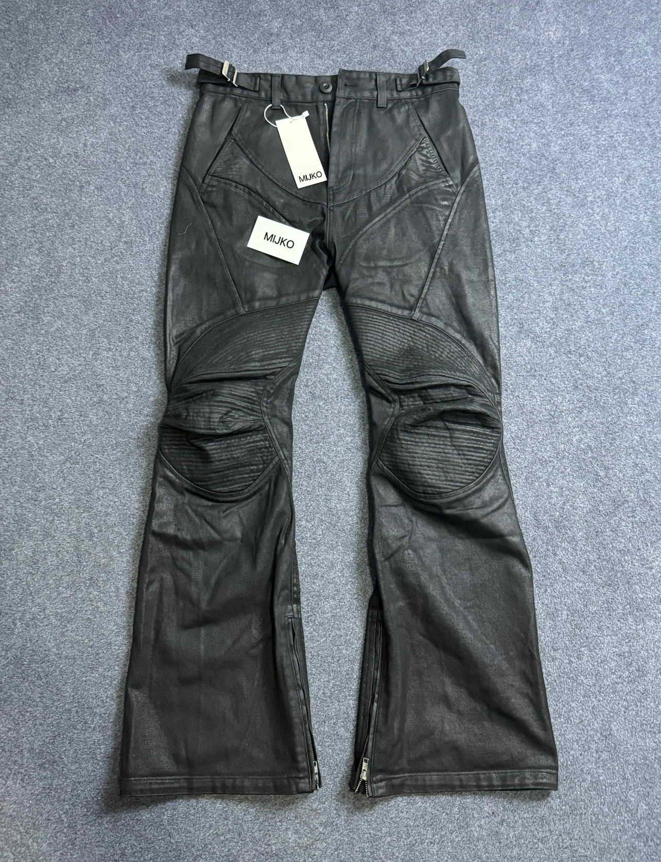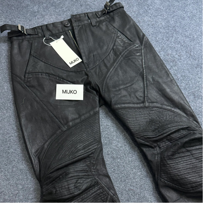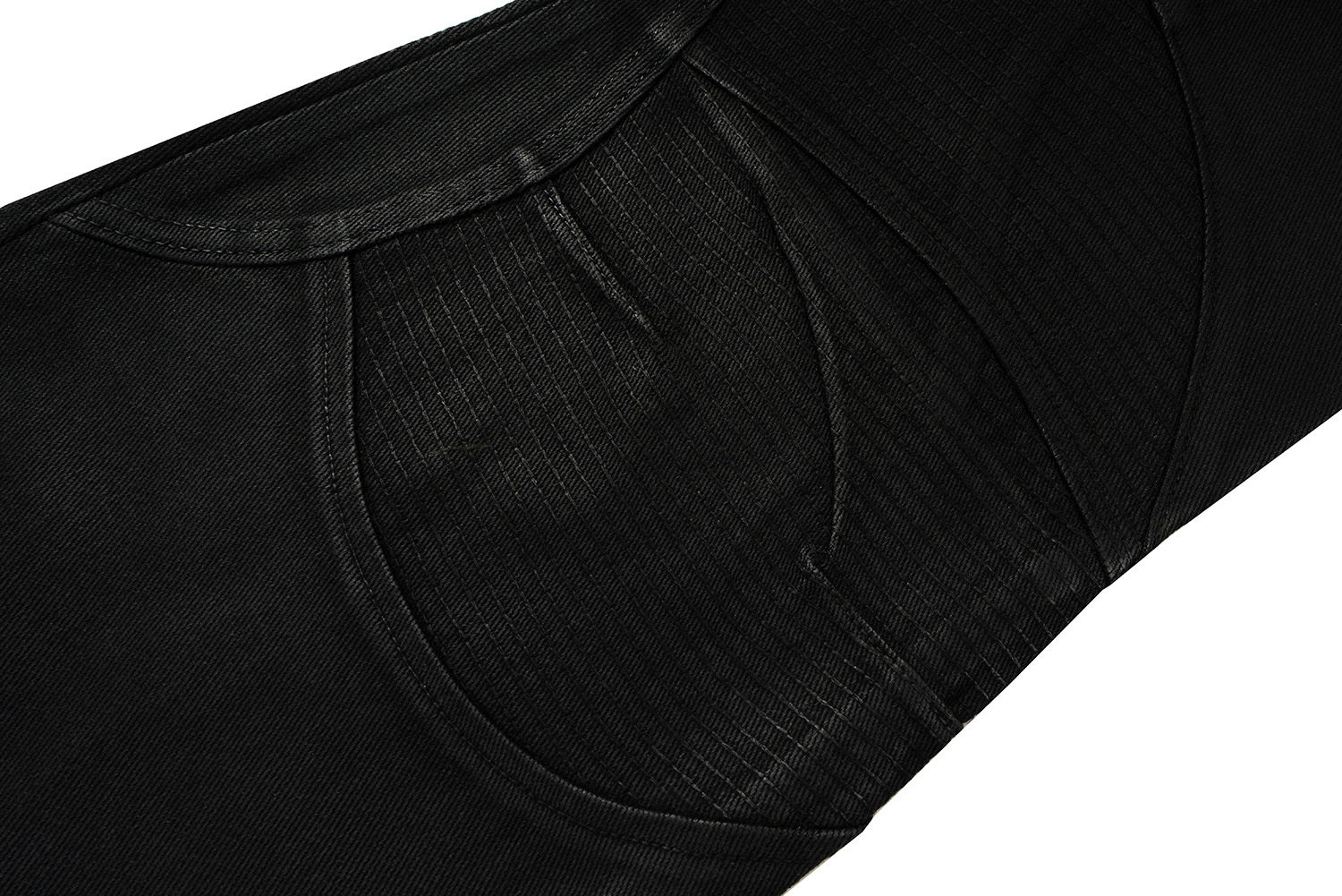 美式vibe風重磅黑色塗層刷蠟機車盔甲拼接褶皺廓形微喇叭牛仔褲男
