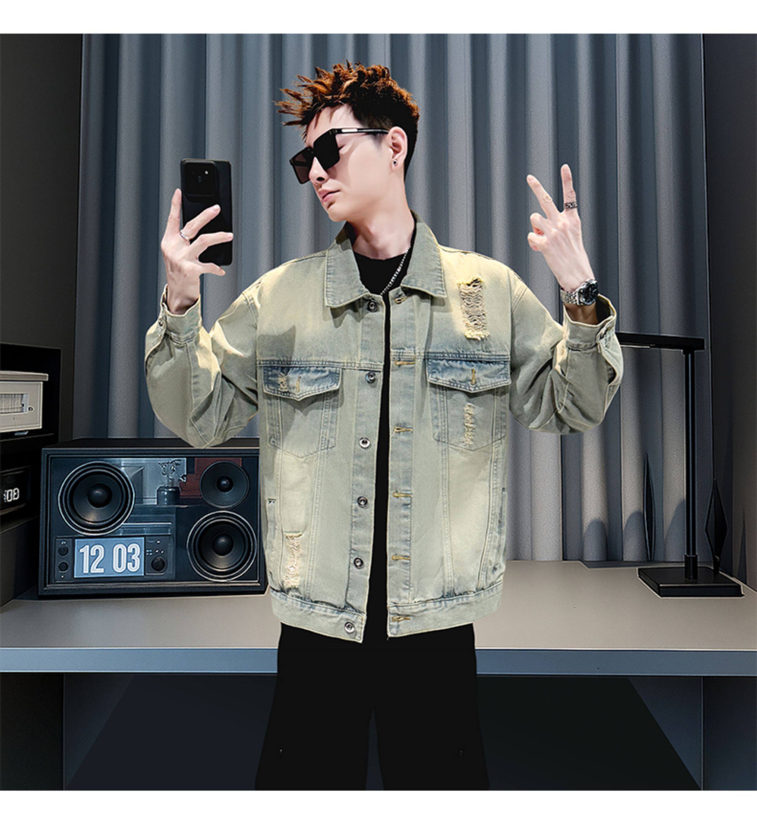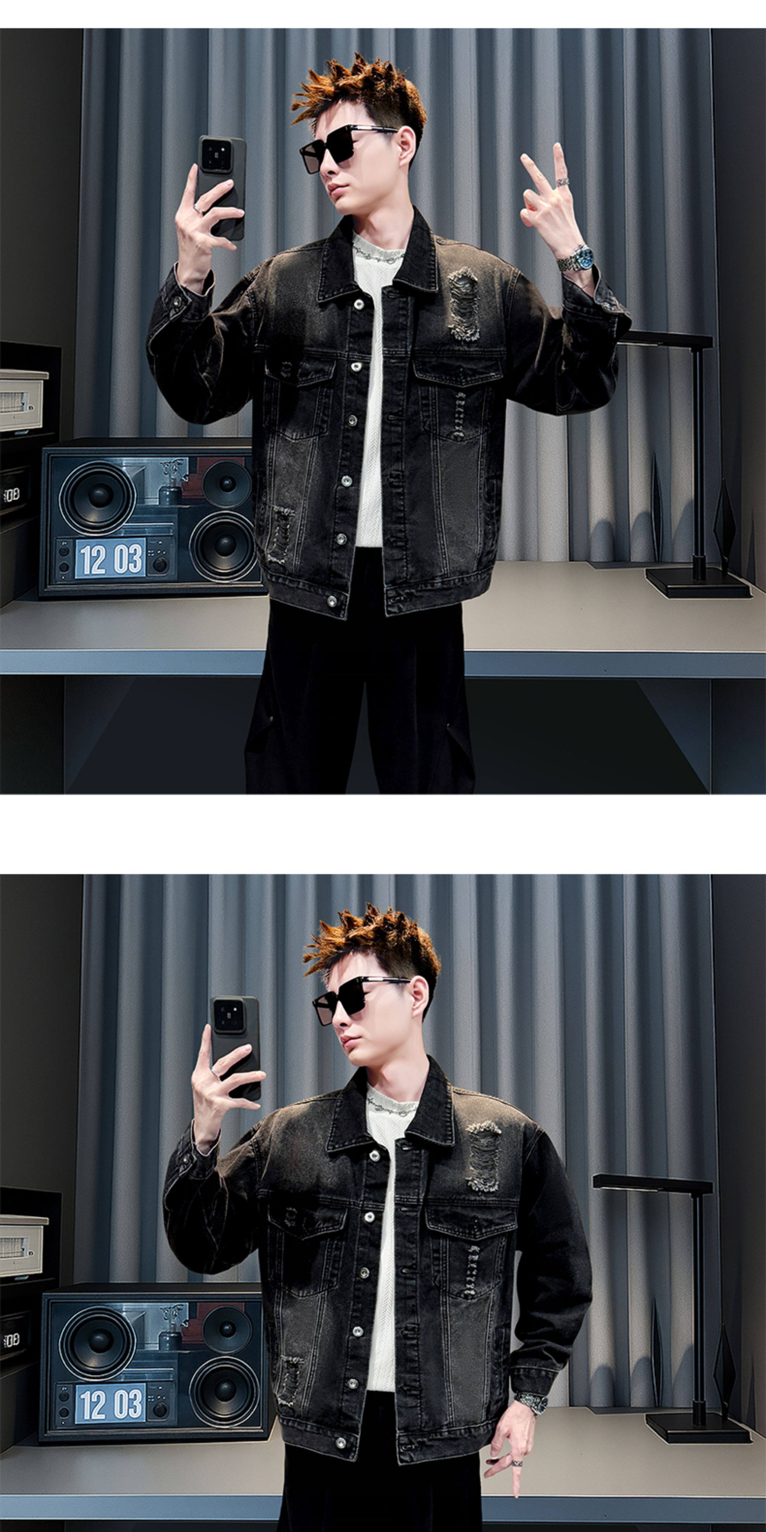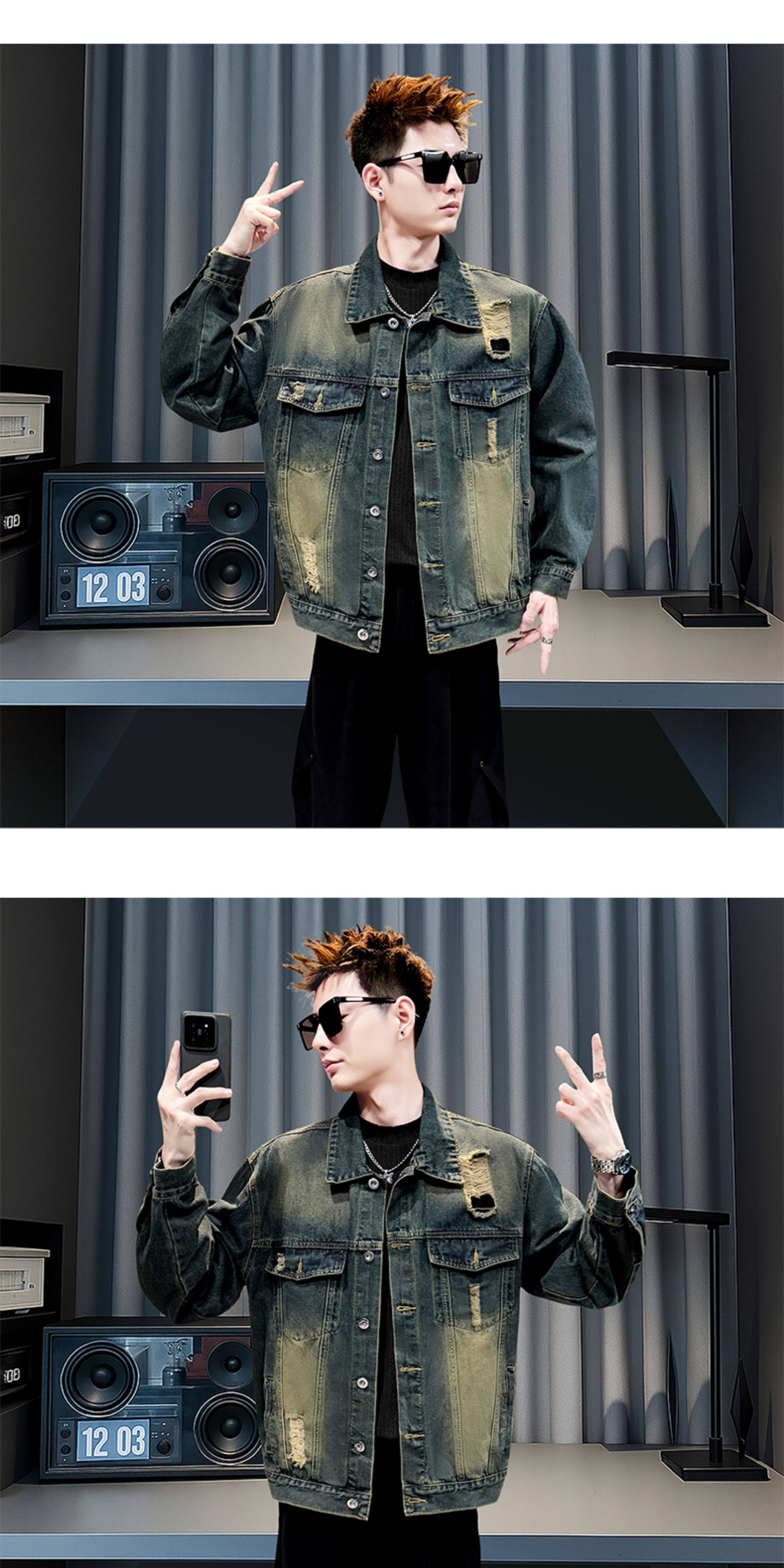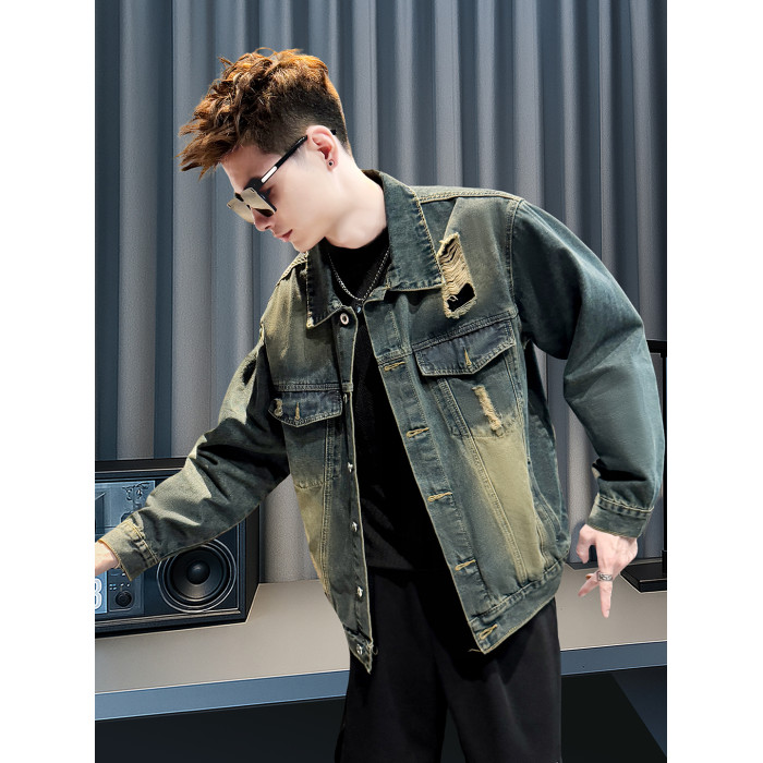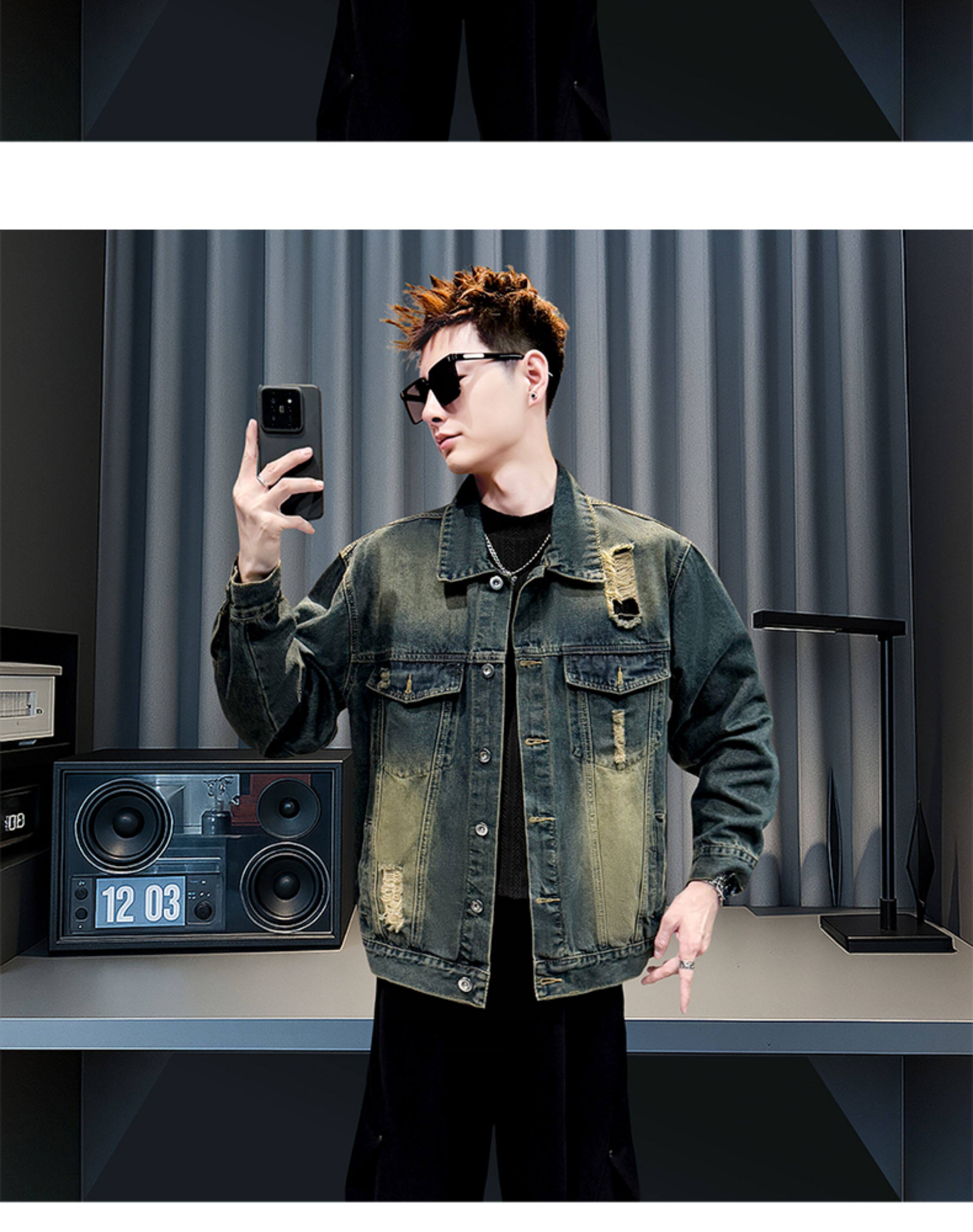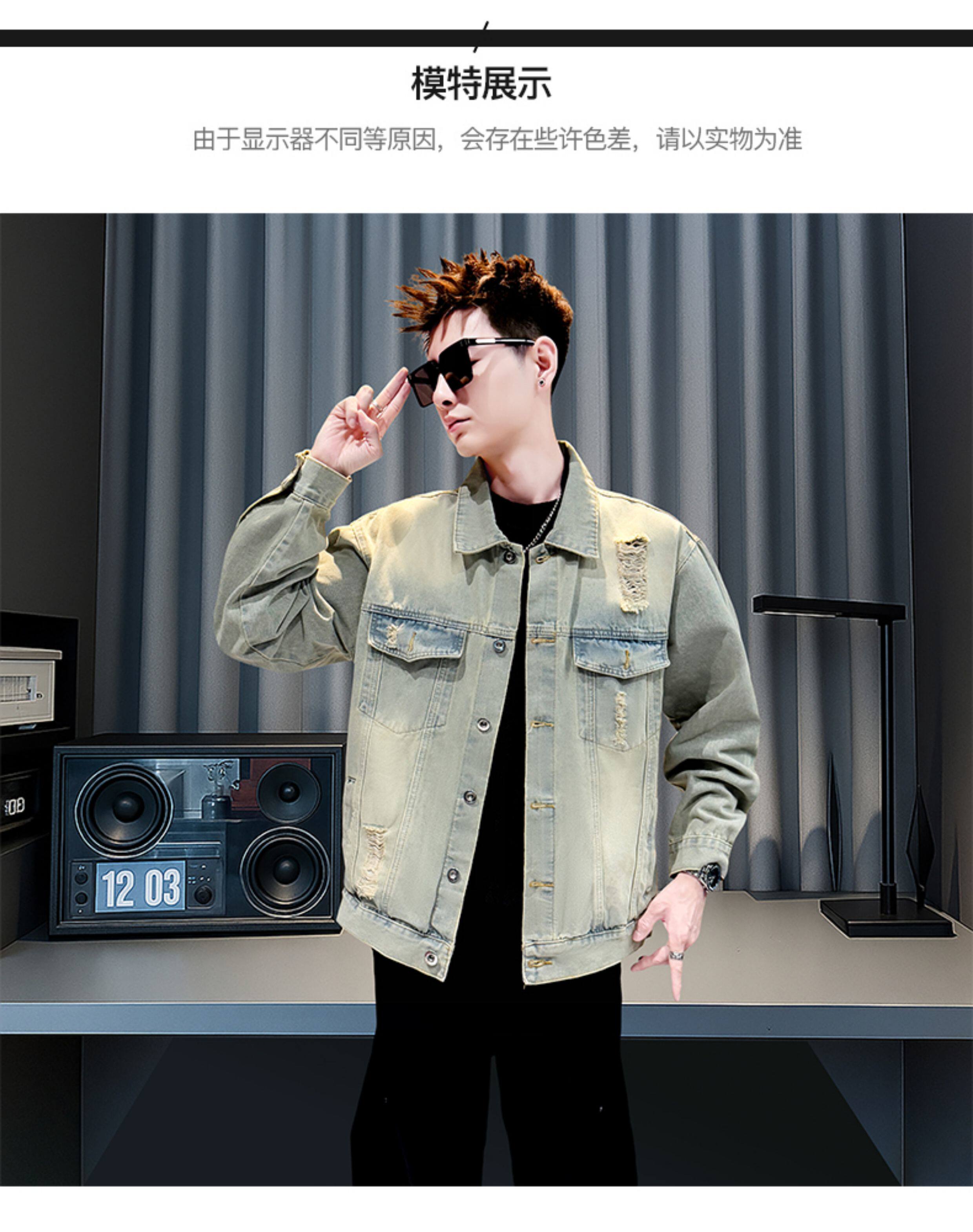 美式復古牛仔外套男士高級感潮牌破洞褂子春秋季新款潮流休閒夾克
