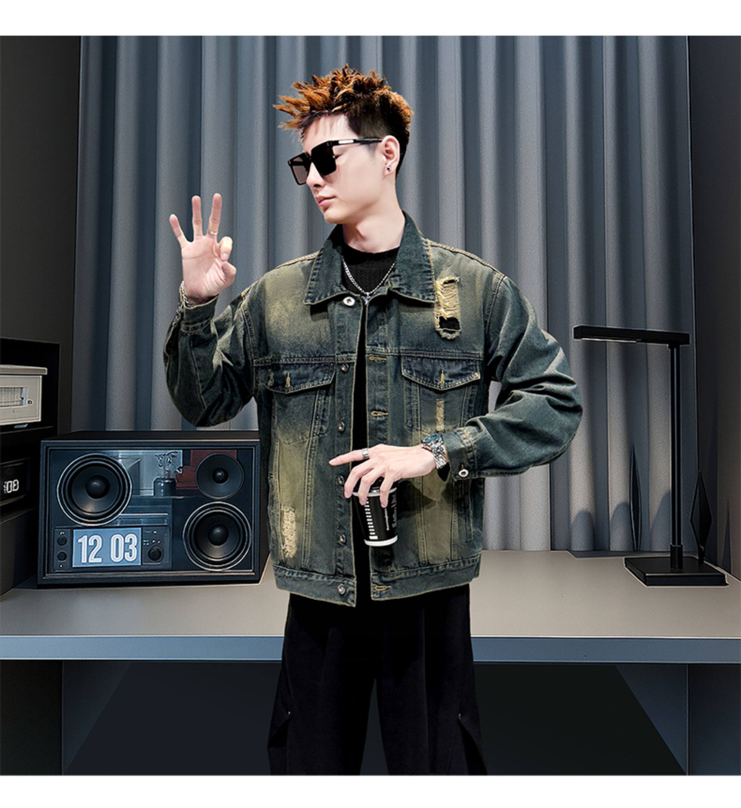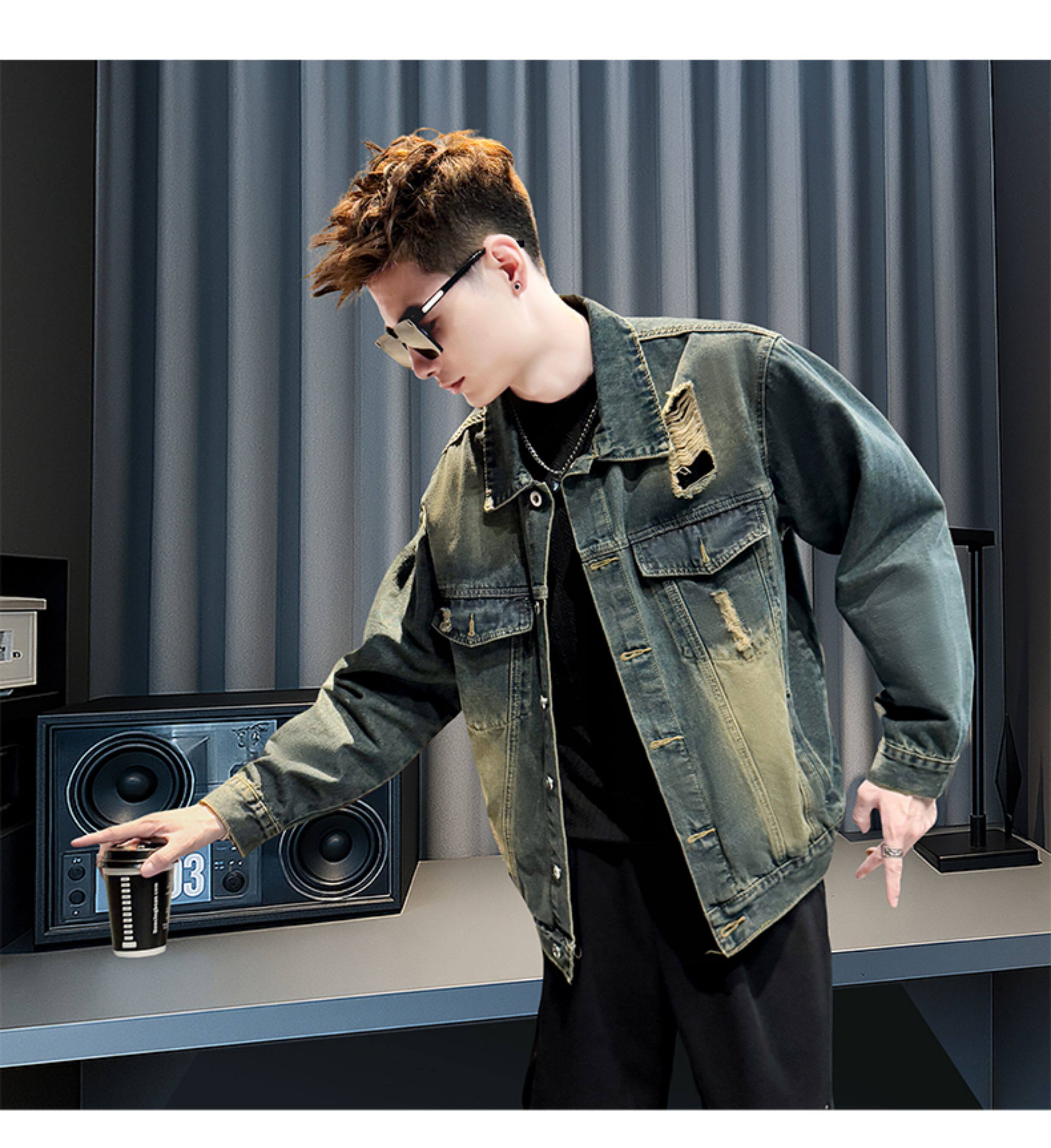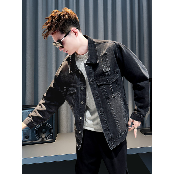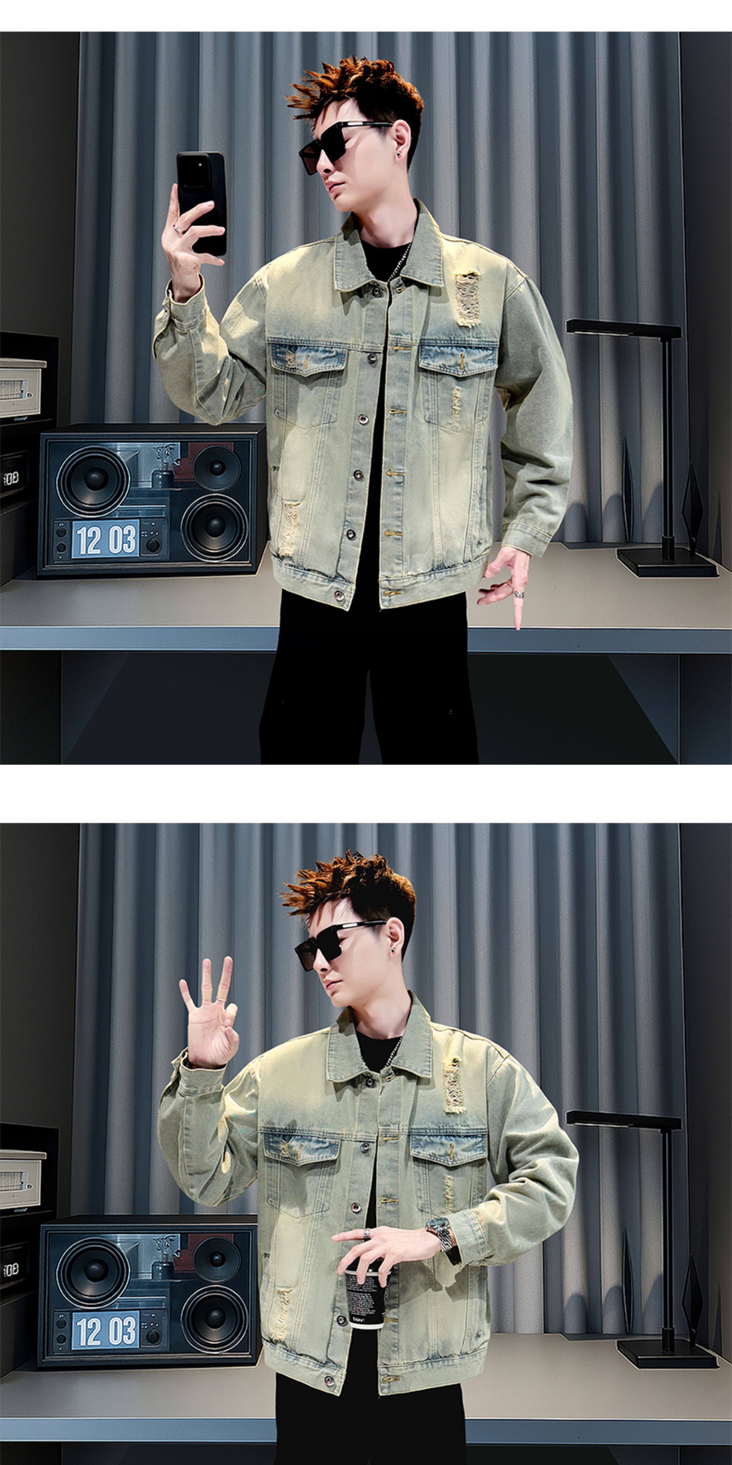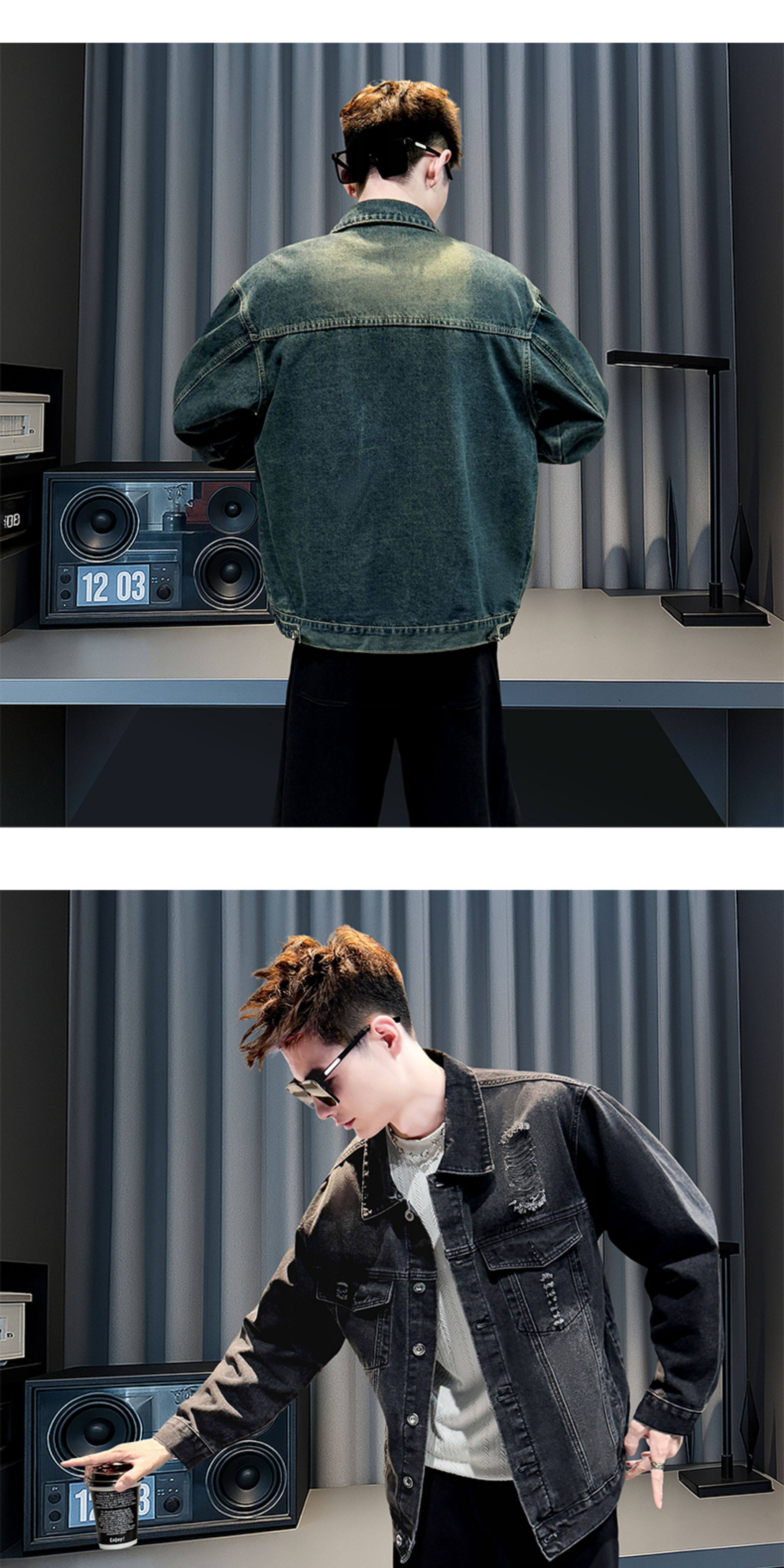 美式復古牛仔外套男士高級感潮牌破洞褂子春秋季新款潮流休閒夾克