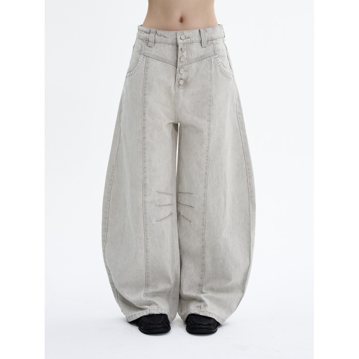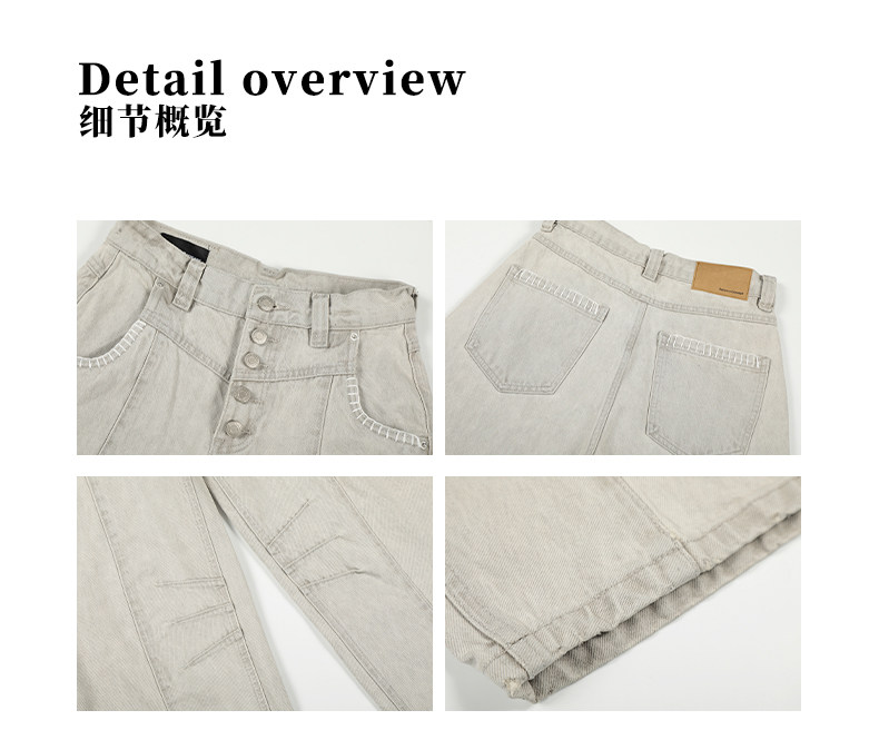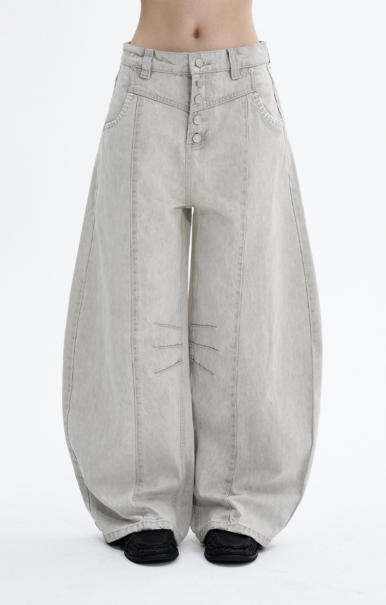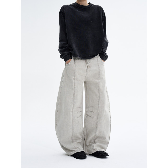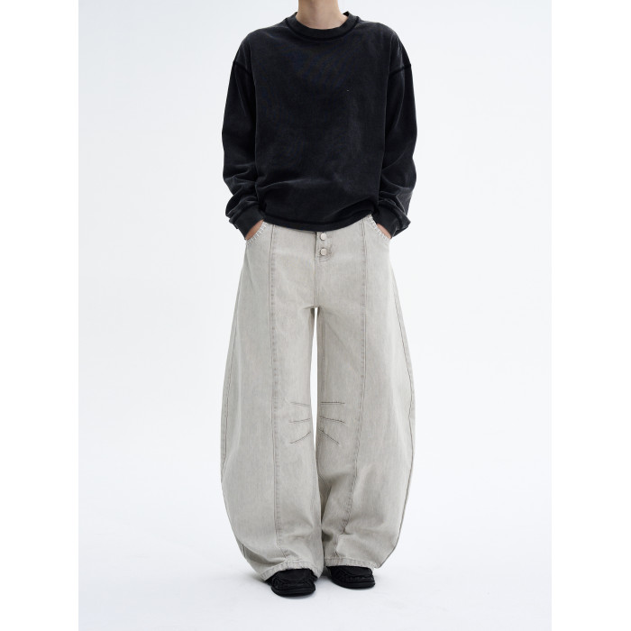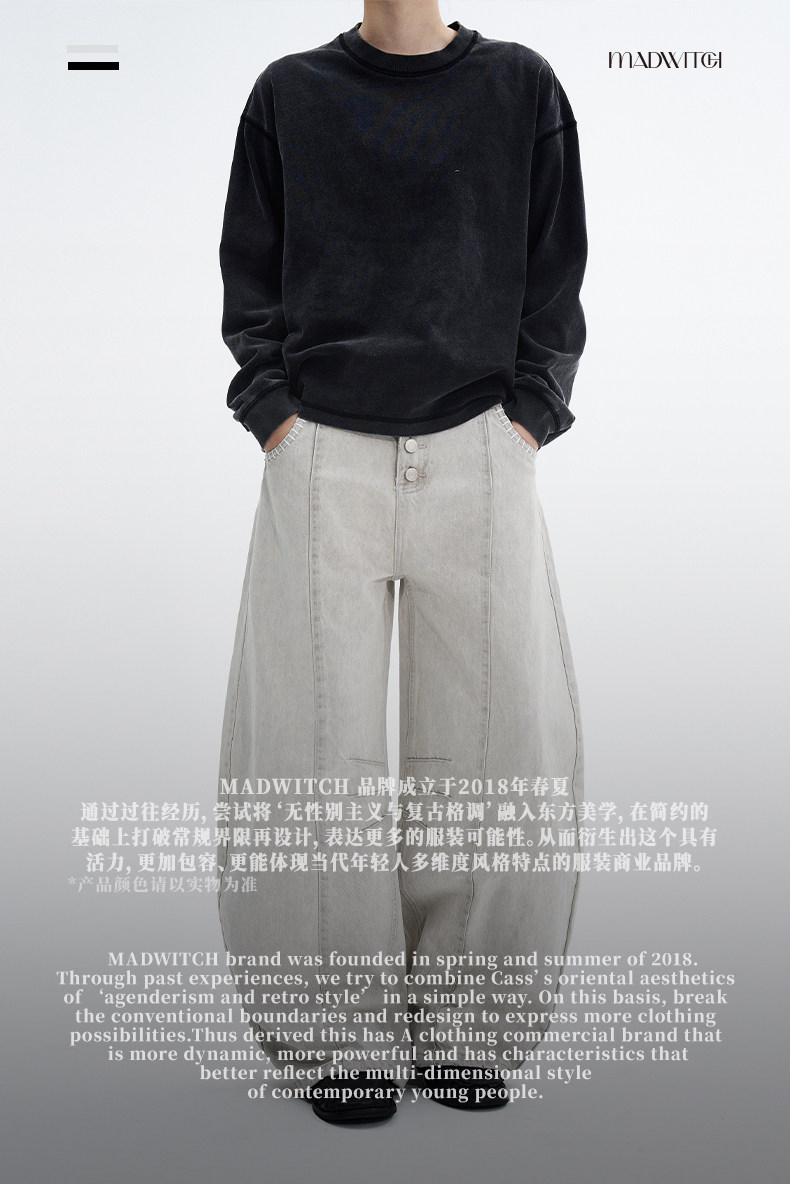 MADWITCH美式水洗磨白排釦工裝褲男女寬鬆濶腿解搆設計感彎刀褲子