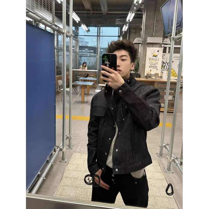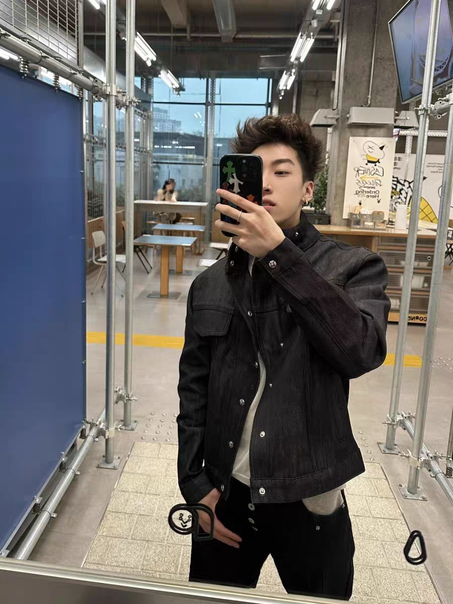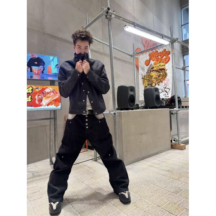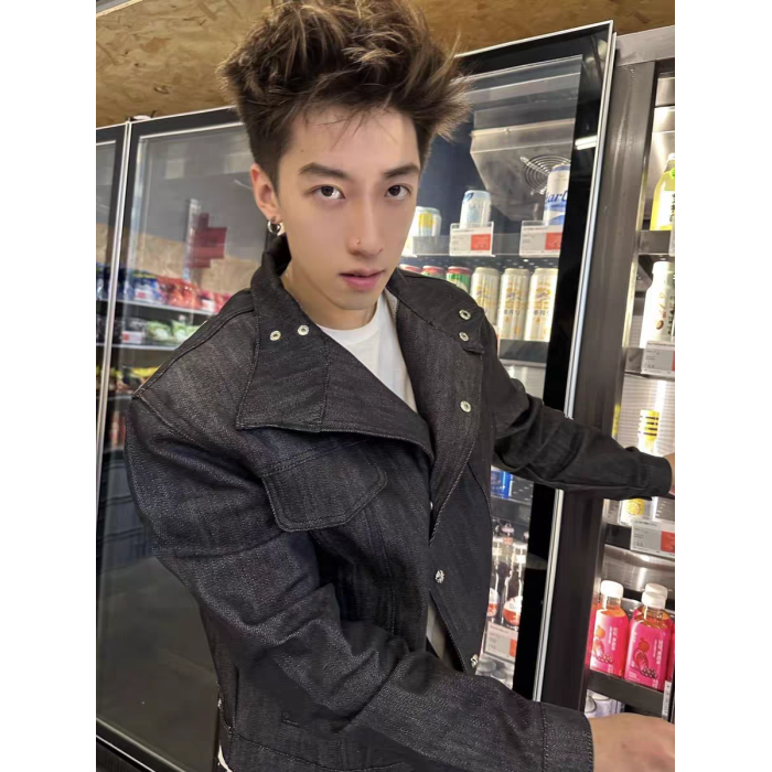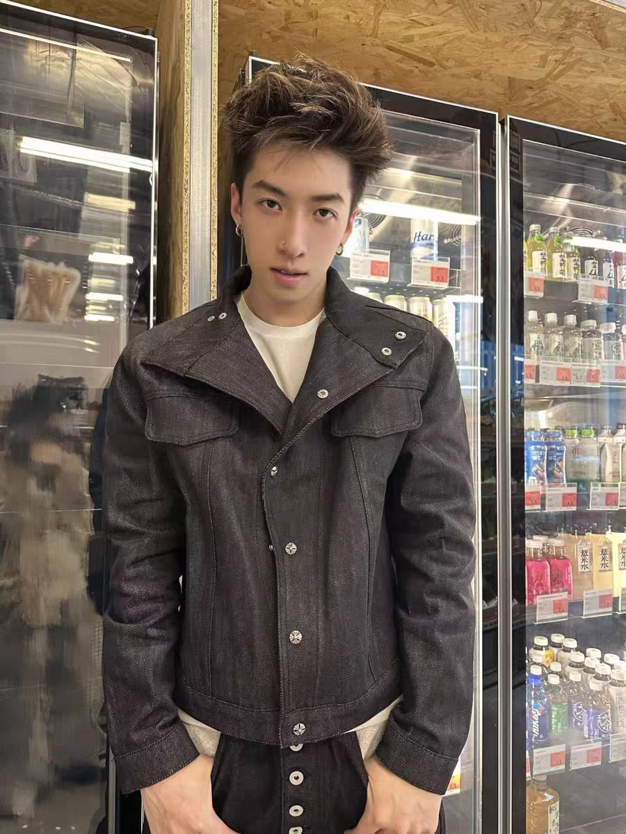 美式秋冬原牛解搆明線斜領硬挺牛仔外套男女設計感短寬高級感夾克