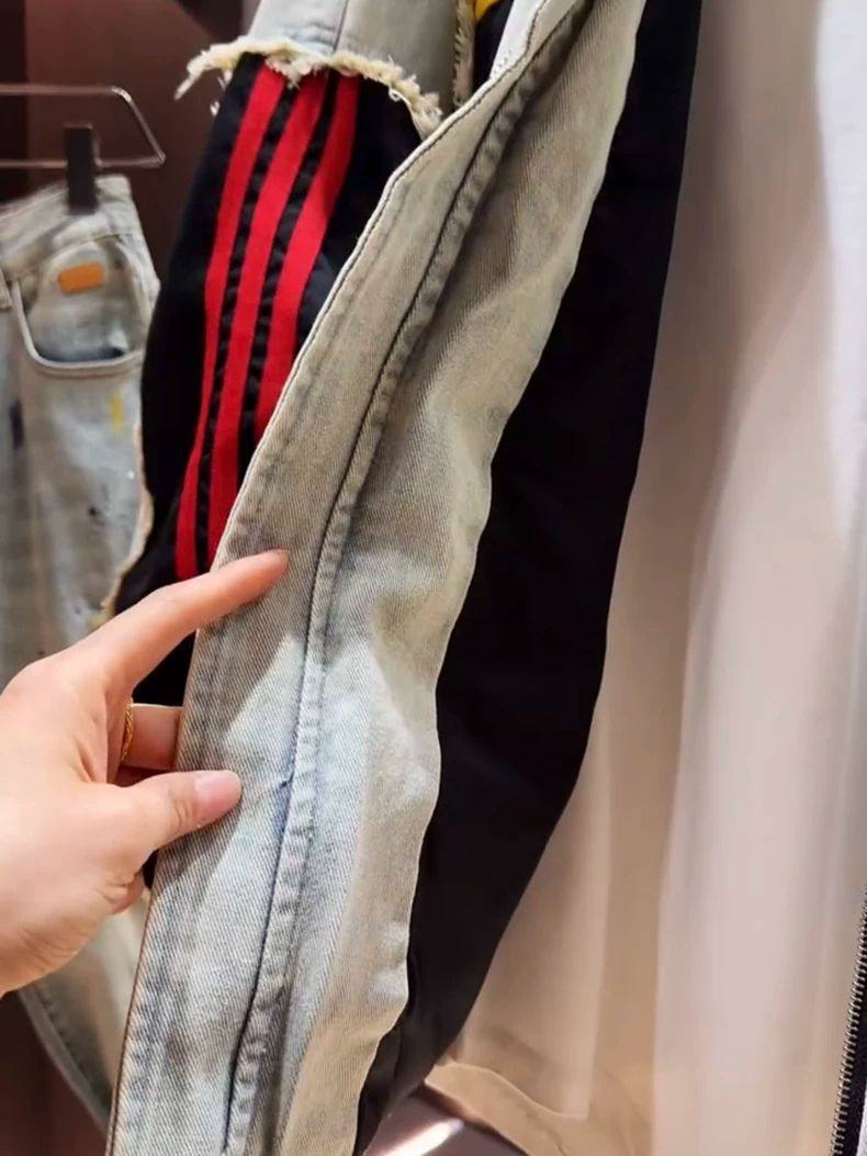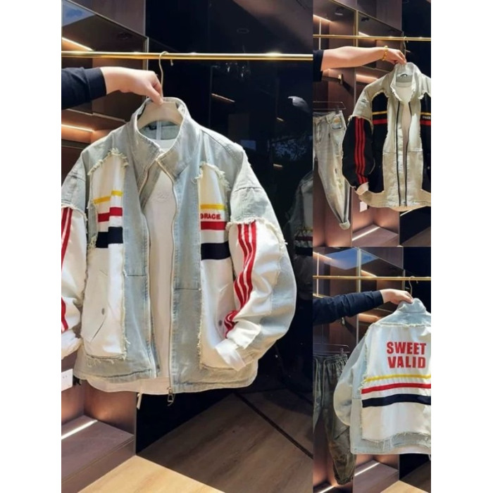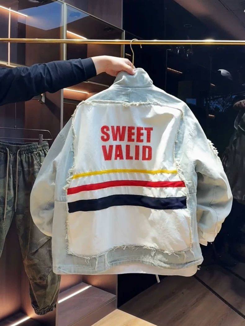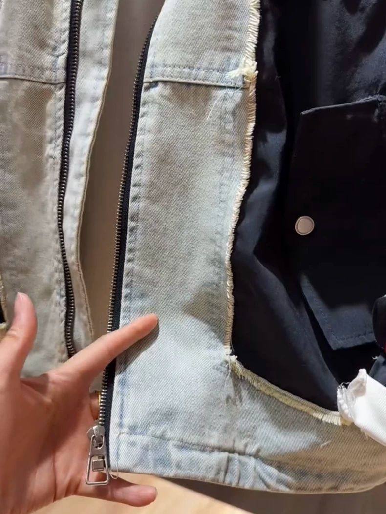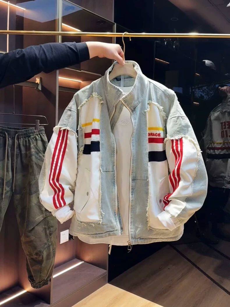 超大碼300斤美式潮牌時尚立領拼接牛仔外套男女早秋寬鬆休閒夾克2