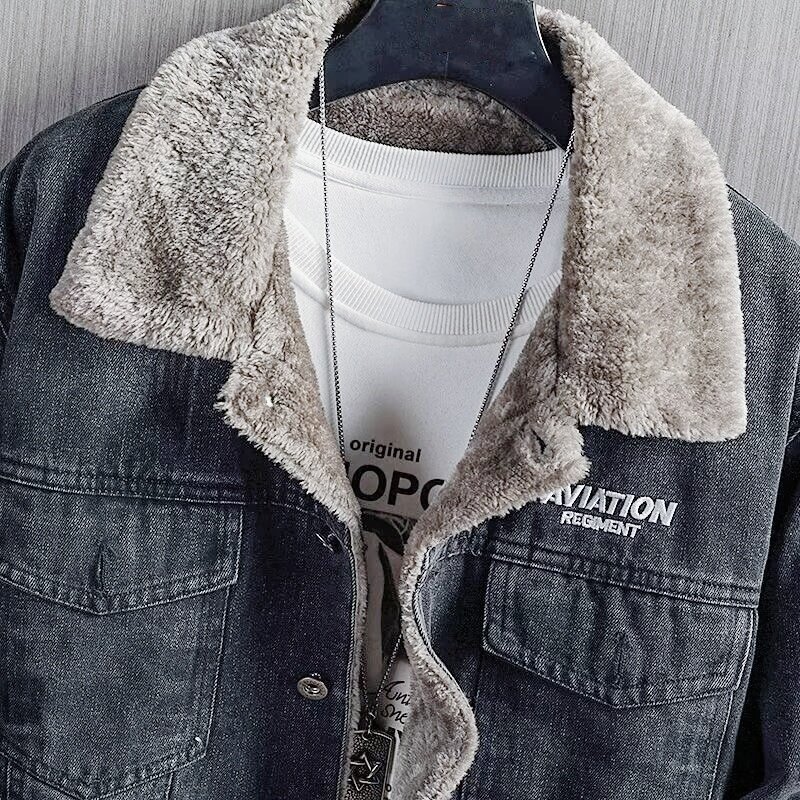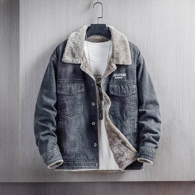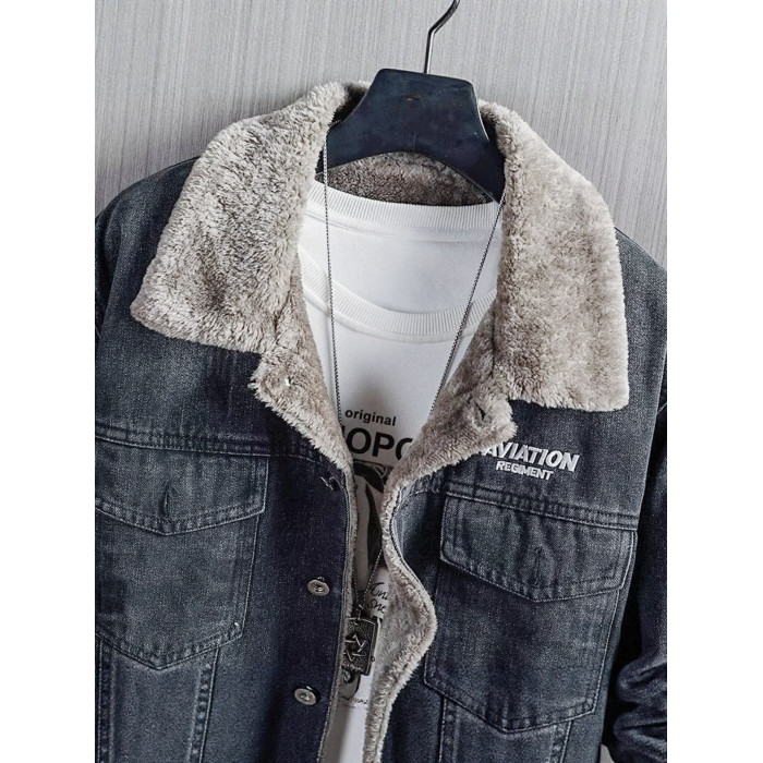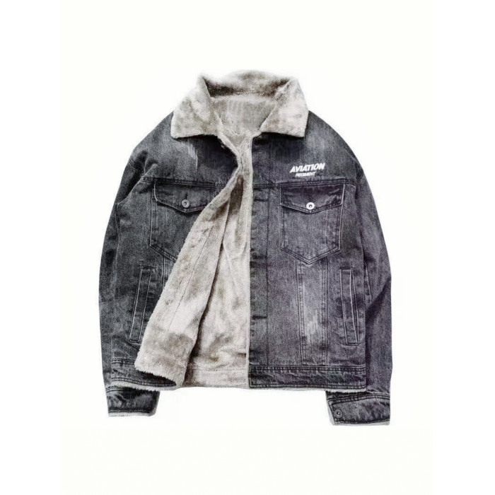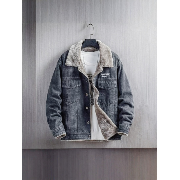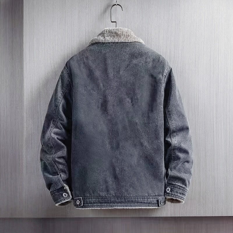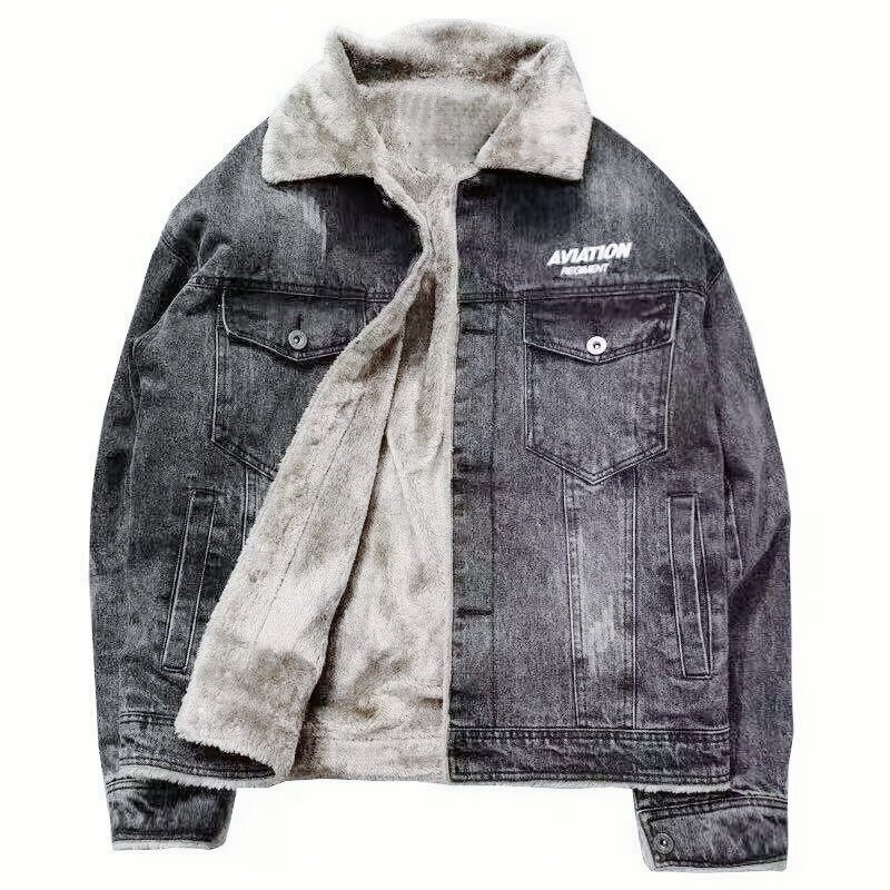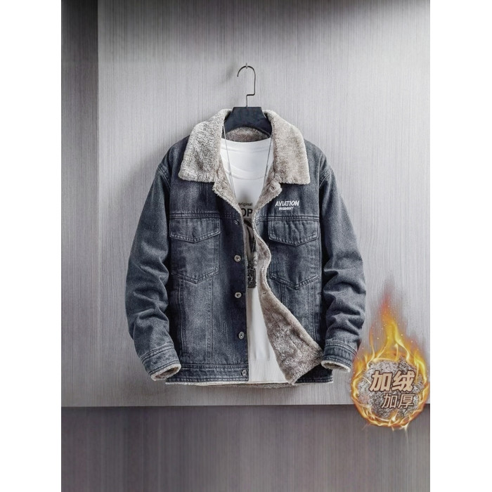 2025新款美式繙領休閒夾克男士牛仔外套加絨加厚冬款羊羔毛絨棉服