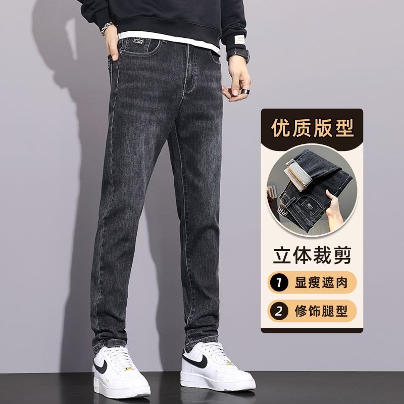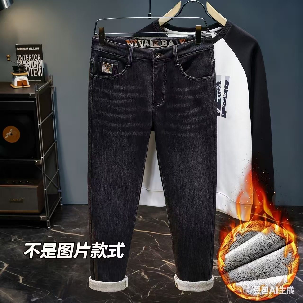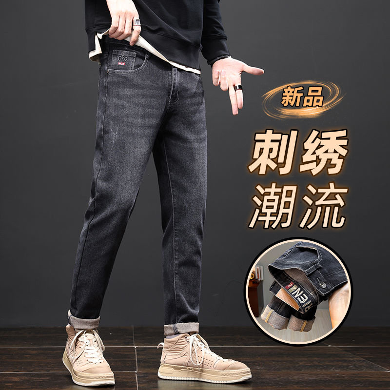 冬季新款加絨加厚男士牛仔褲男刺綉潮流彈力百搭休閒修身直筒褲子