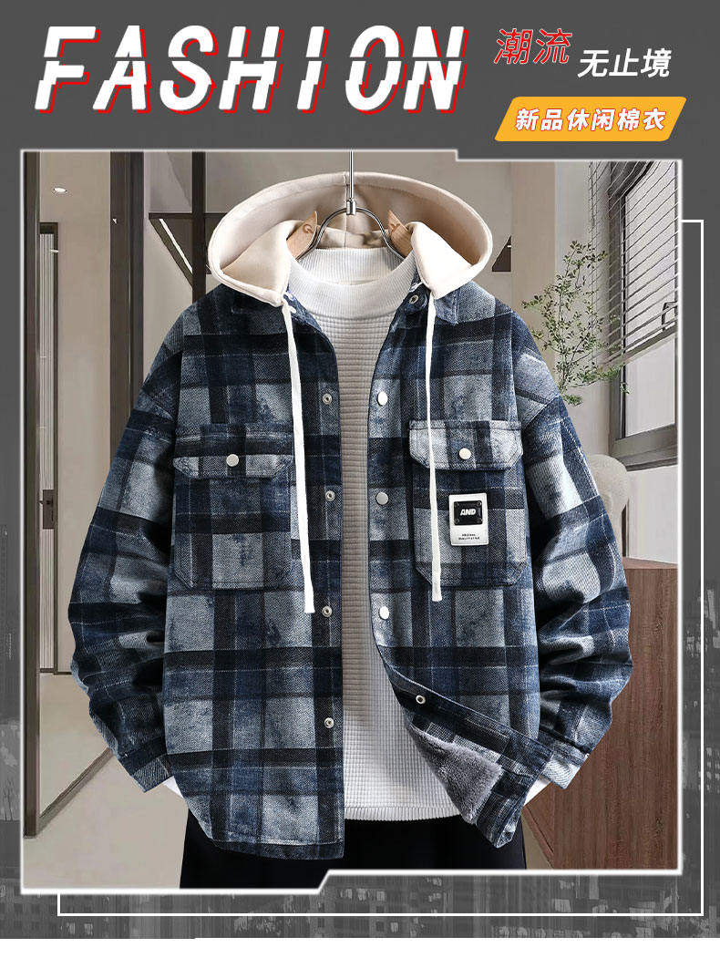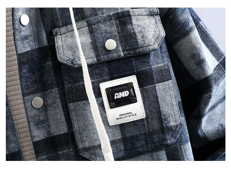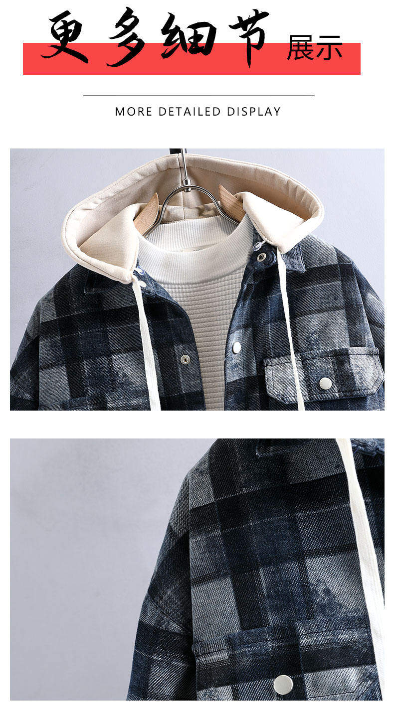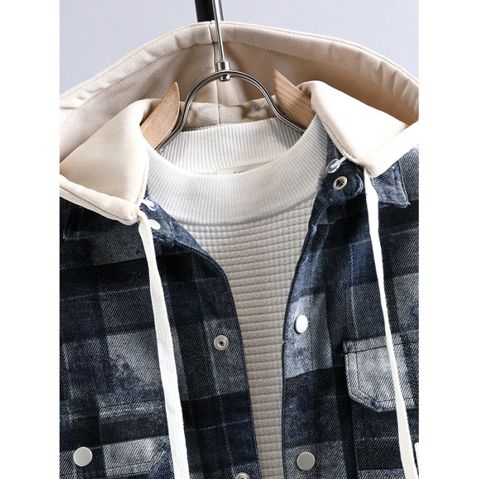 加絨加厚牛仔外套男可脫卸連帽保暖夾克2025冬季格子刺綉復古棉服