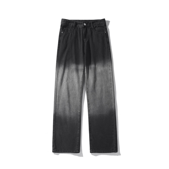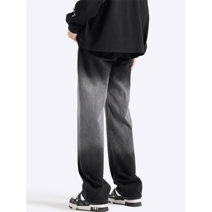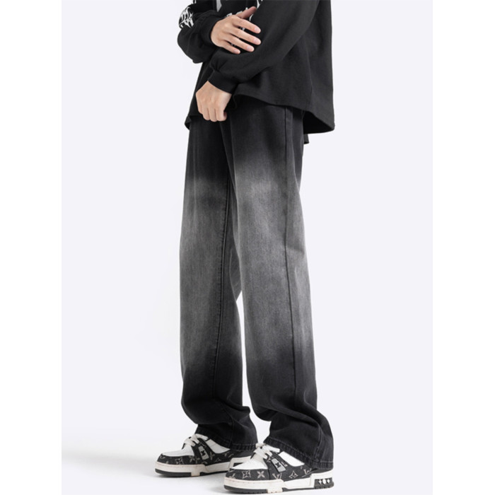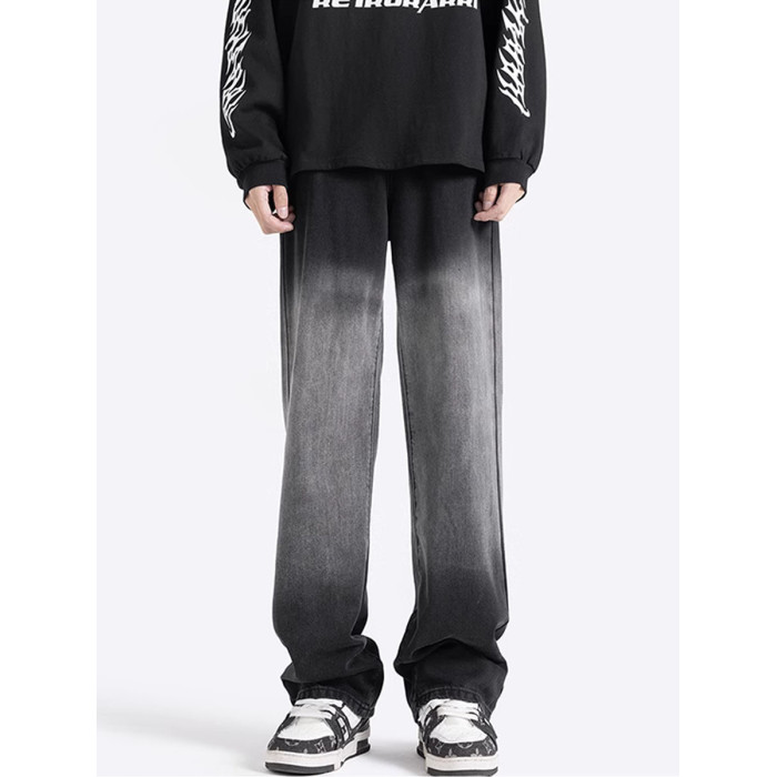 美式漸變牛仔褲男秋季高街潮寬鬆做舊直筒褲加絨加厚休閒微喇褲子