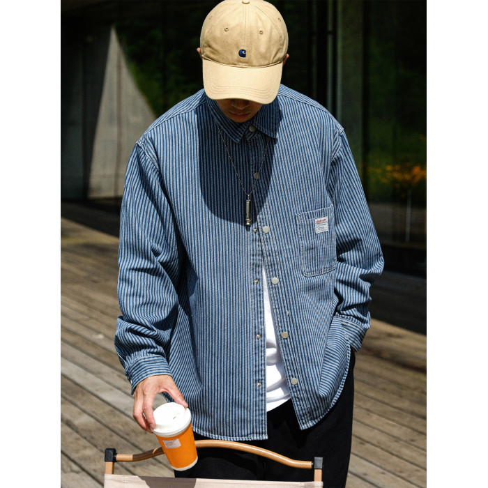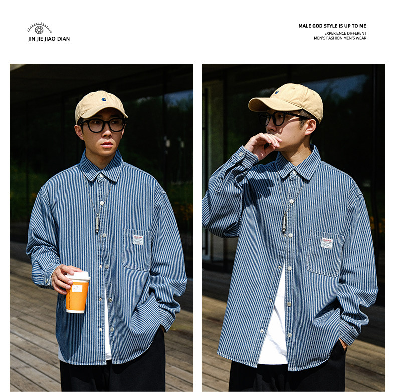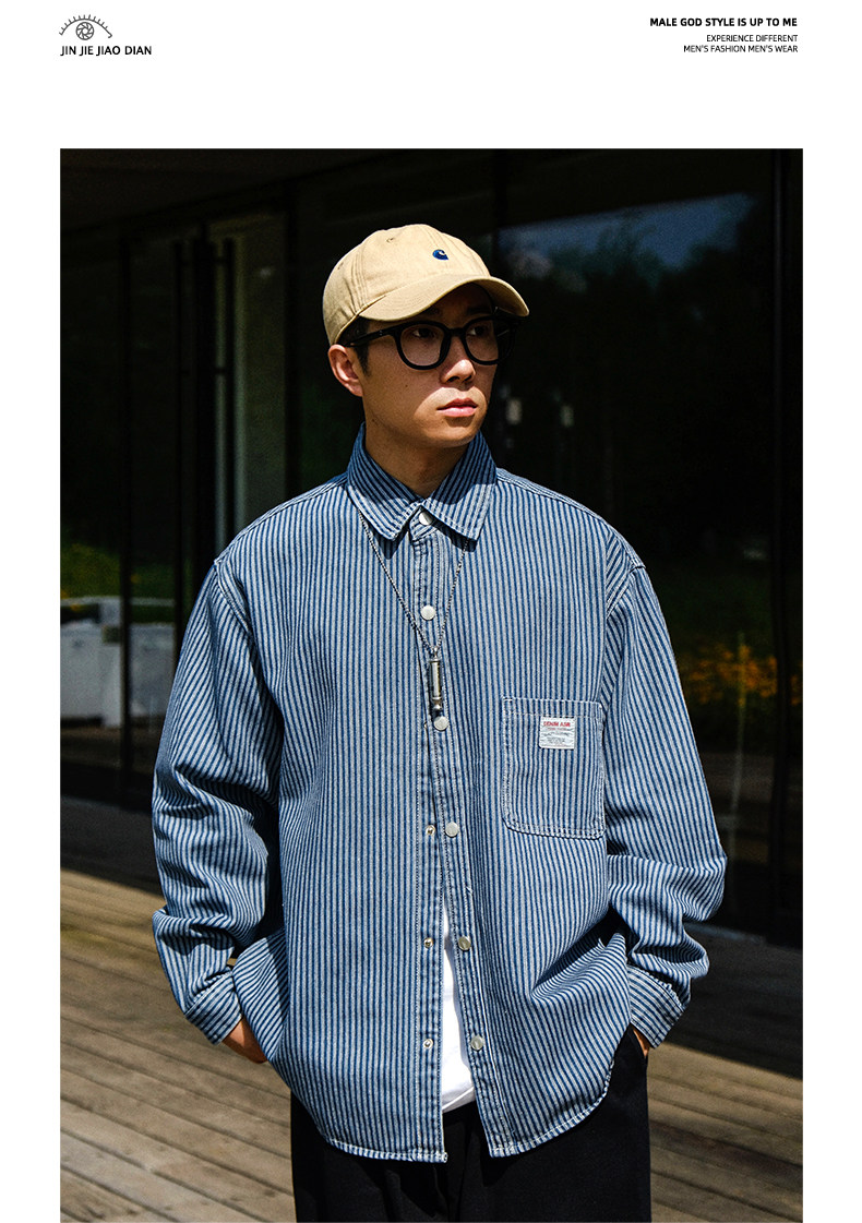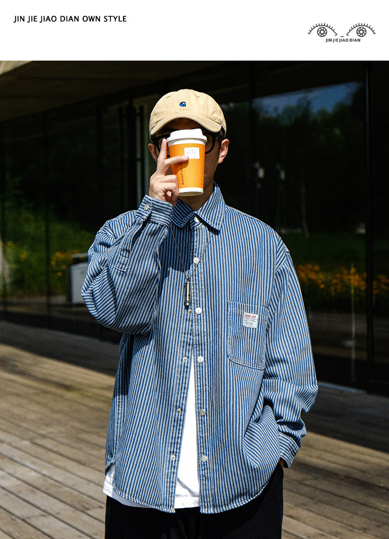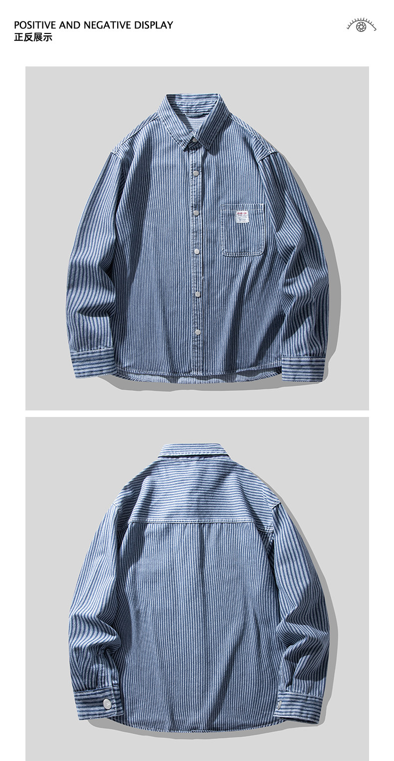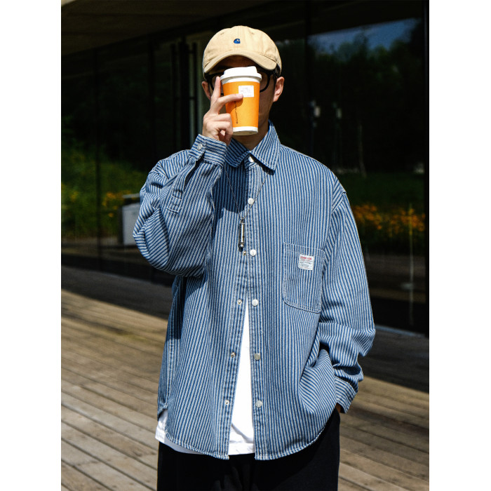 英倫高級感復古藍白條紋重磅牛仔襯衫男士春秋季美式長袖襯衣外套