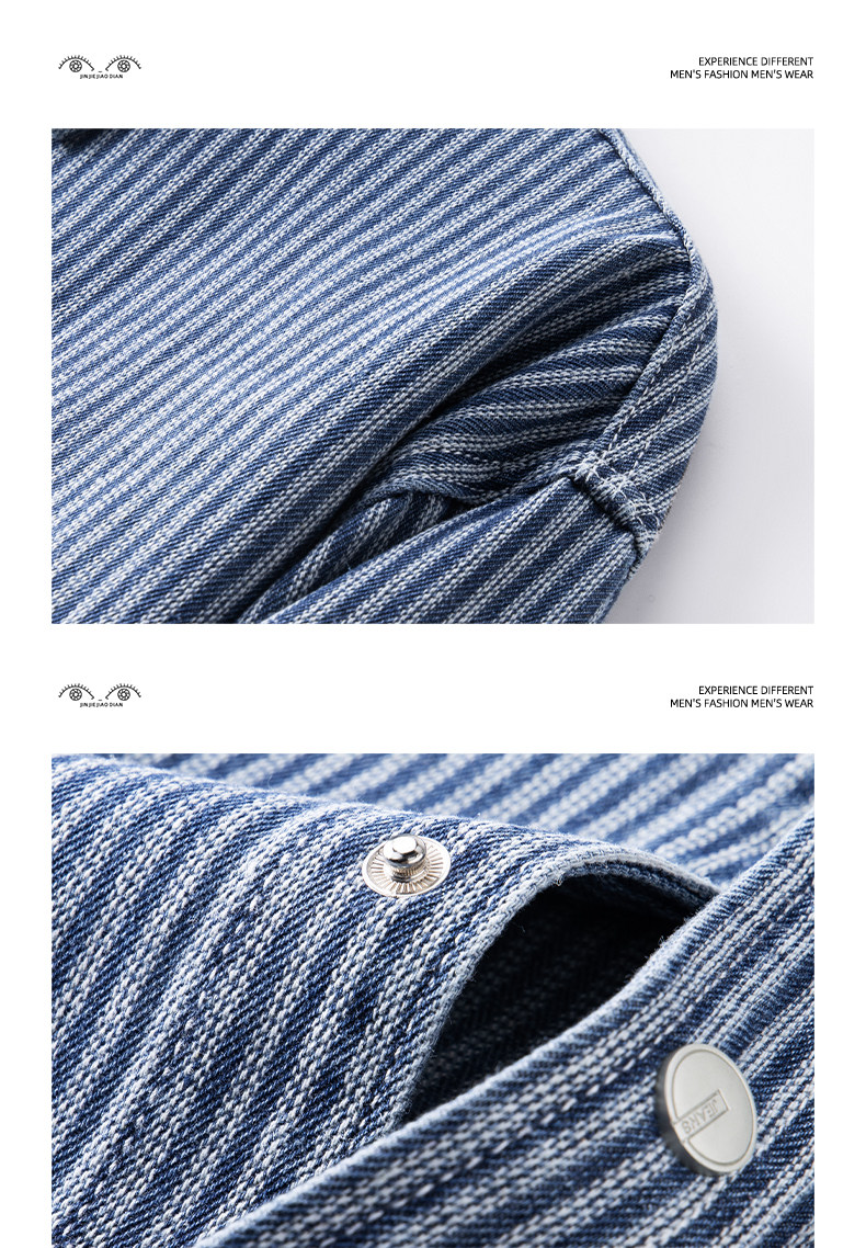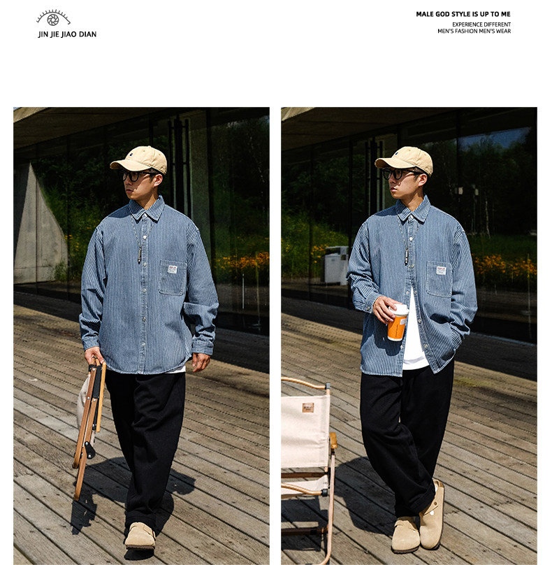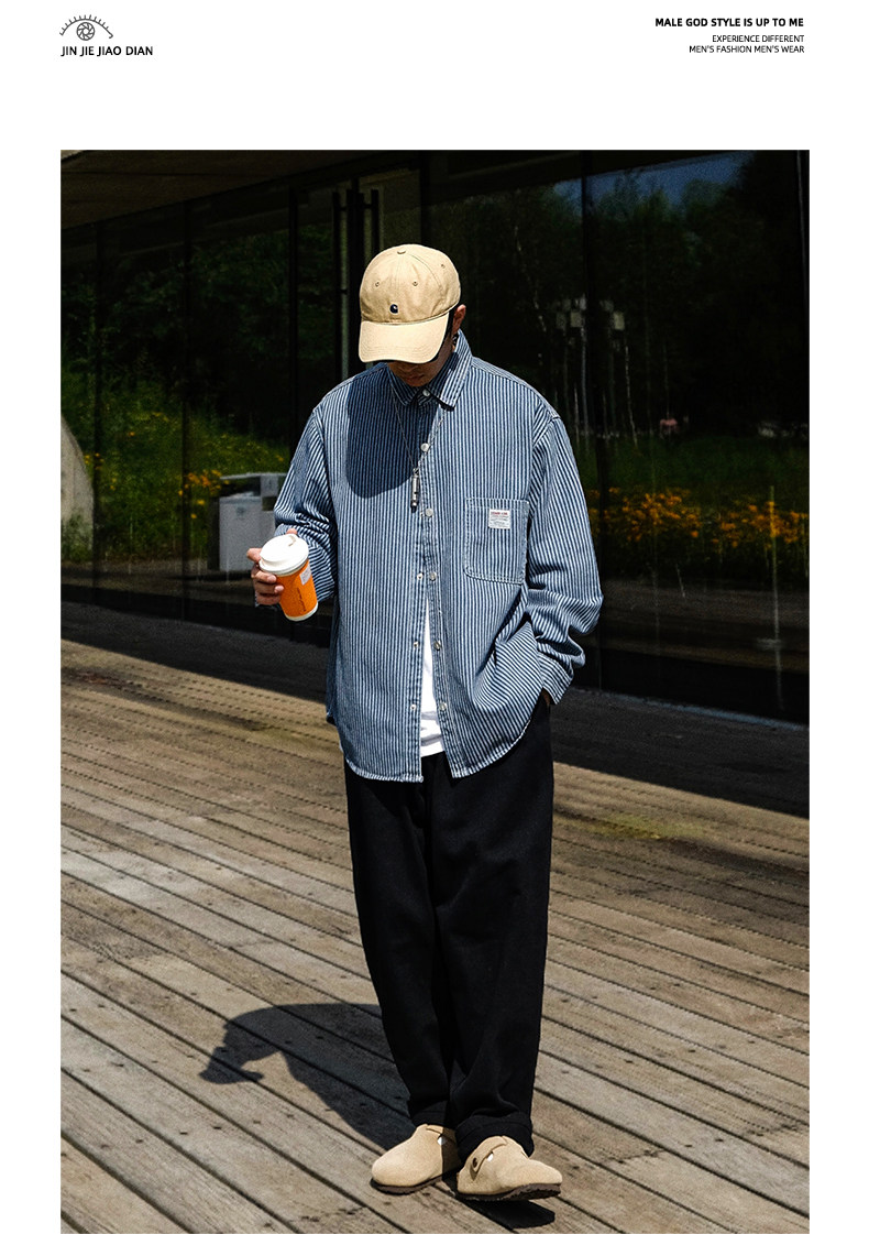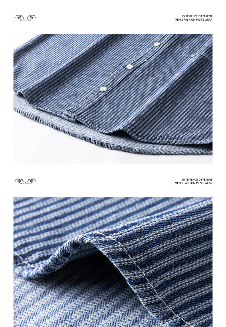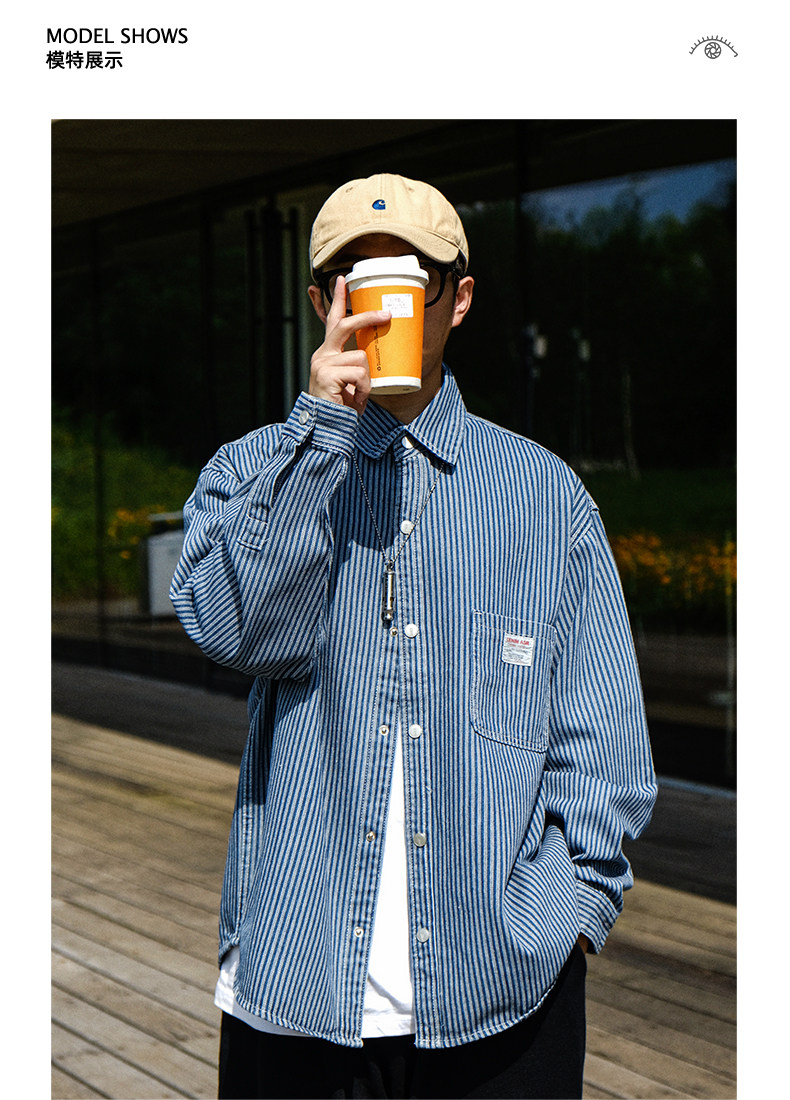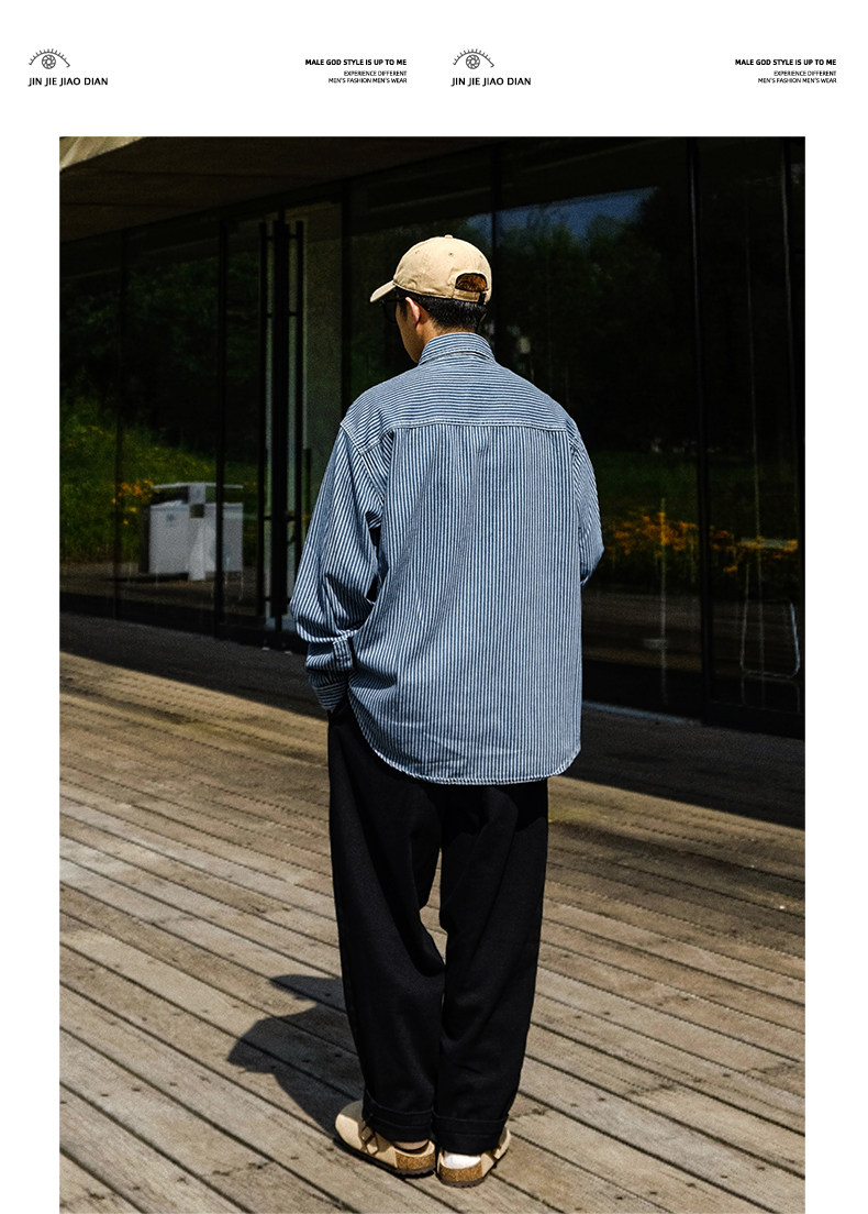 英倫高級感復古藍白條紋重磅牛仔襯衫男士春秋季美式長袖襯衣外套