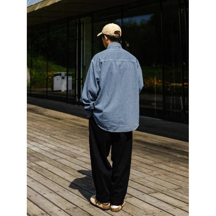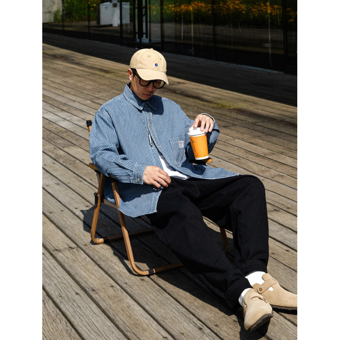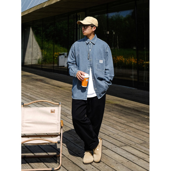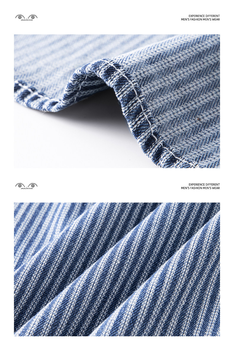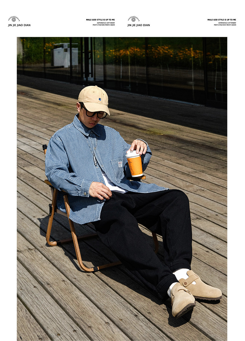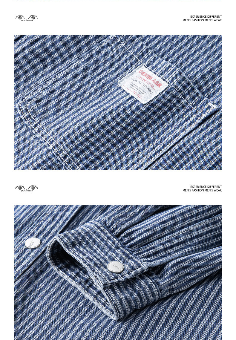 英倫高級感復古藍白條紋重磅牛仔襯衫男士春秋季美式長袖襯衣外套