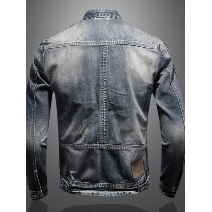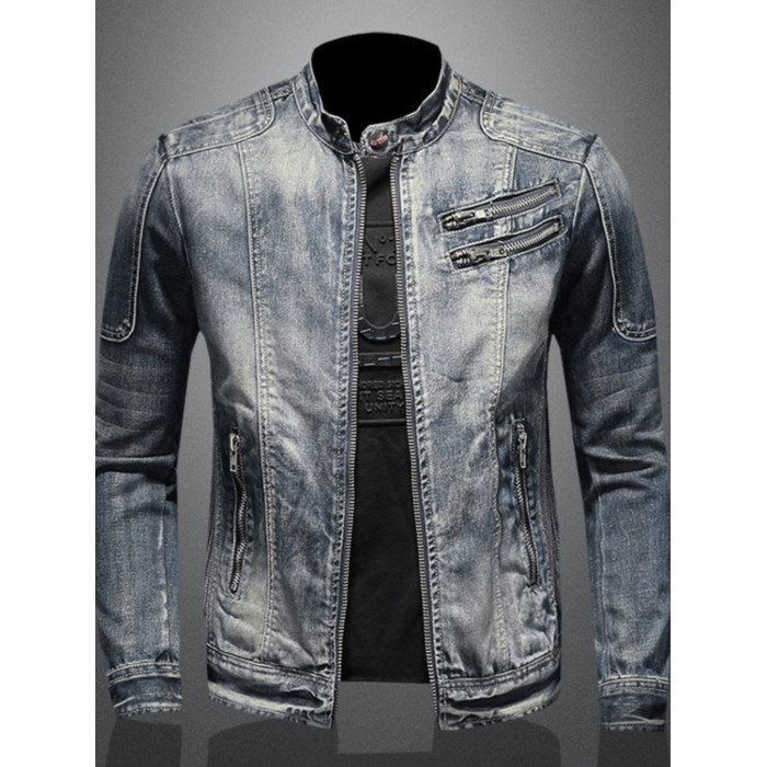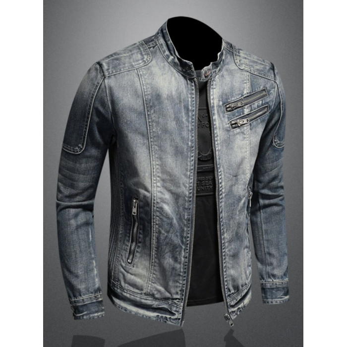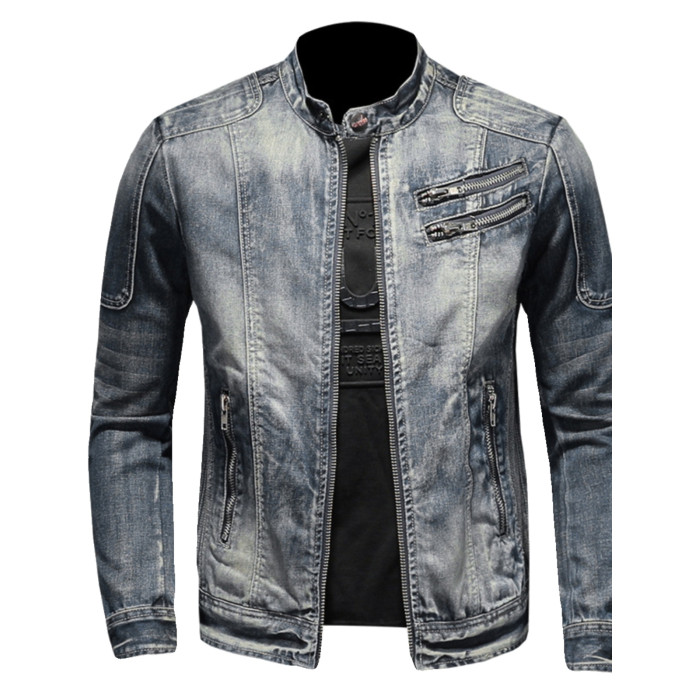 秋冬新款男士牛仔外套歐美休閒復古修身立領拉鍊夾克騎行機車服潮