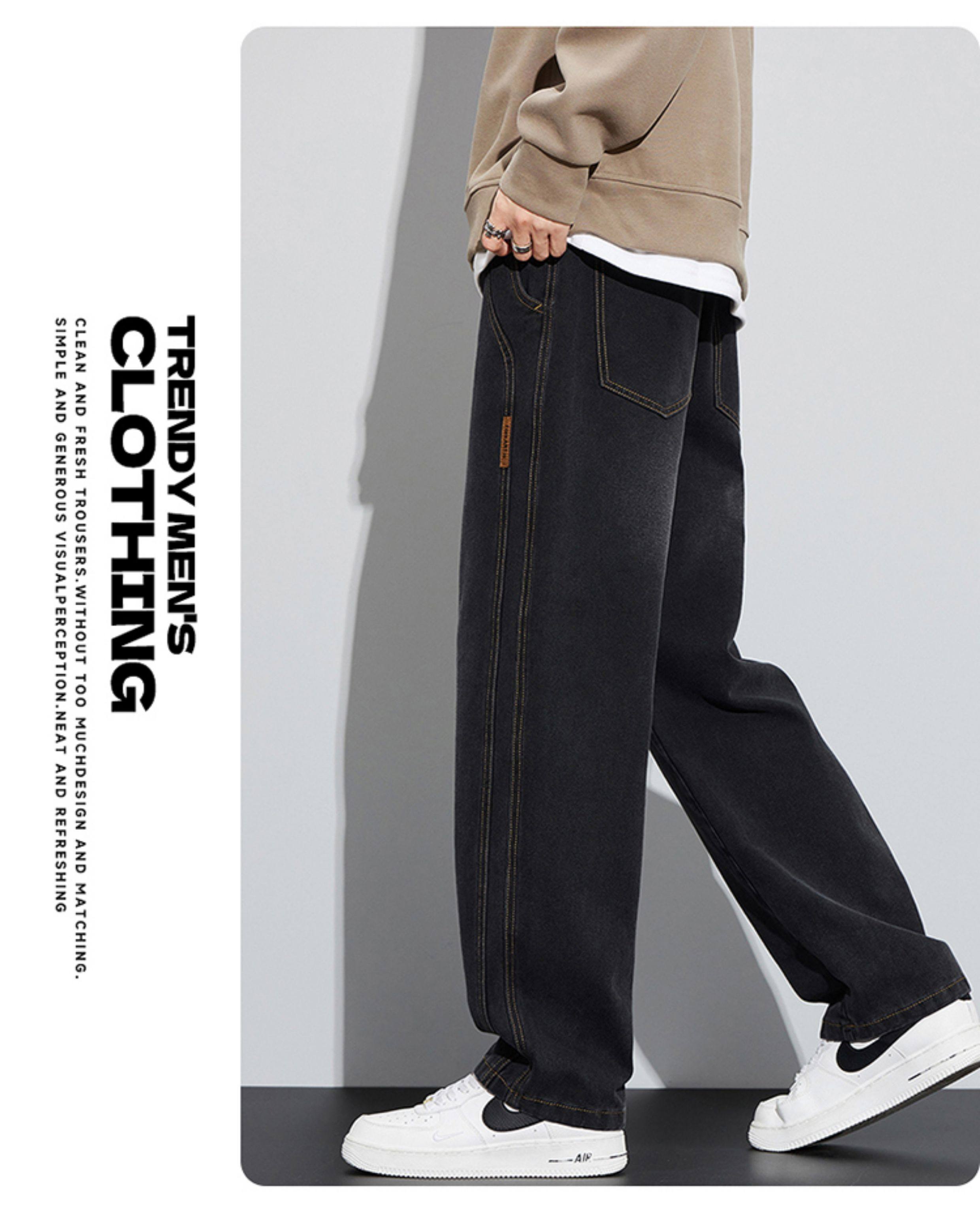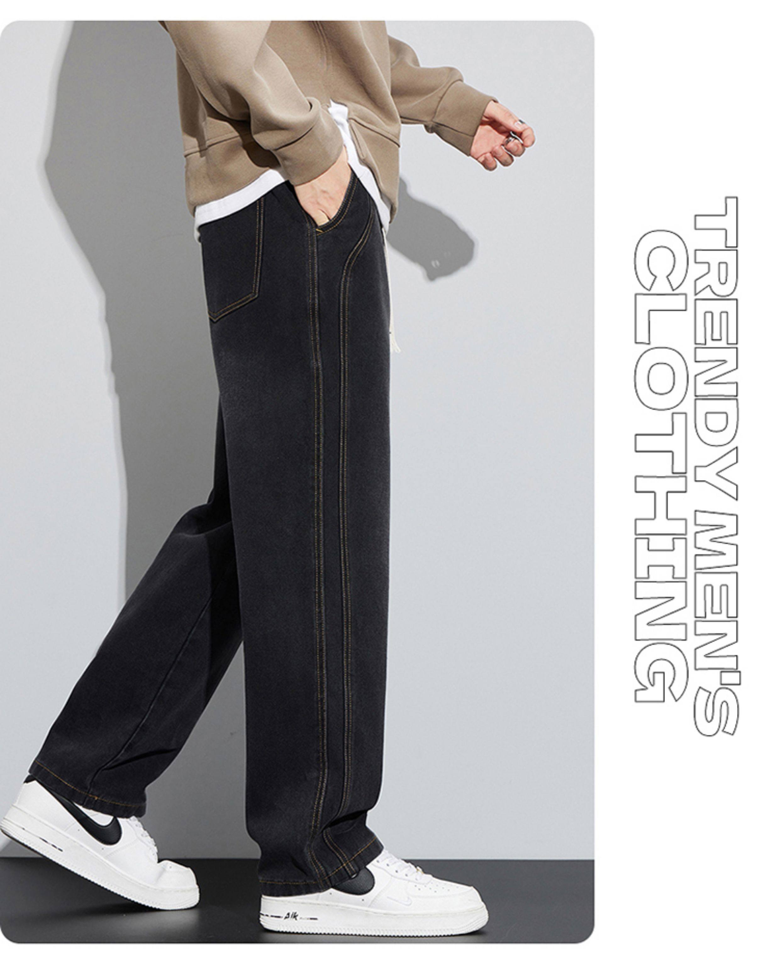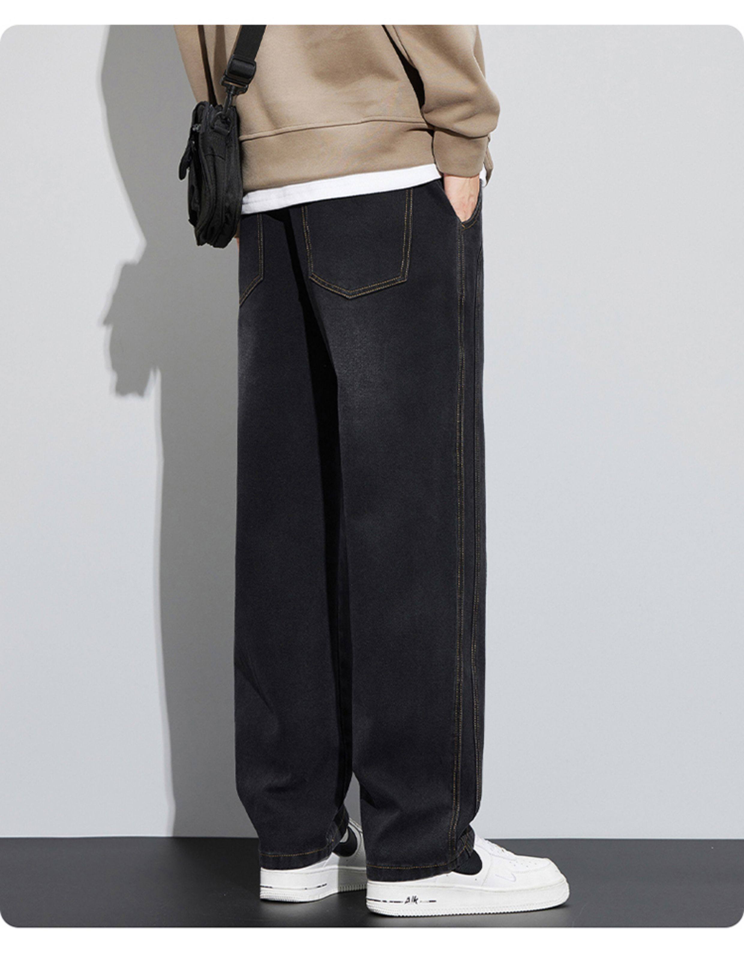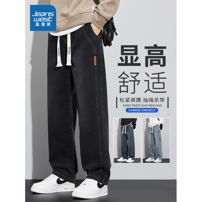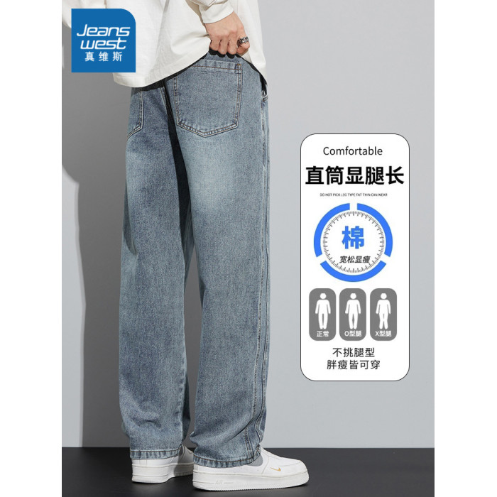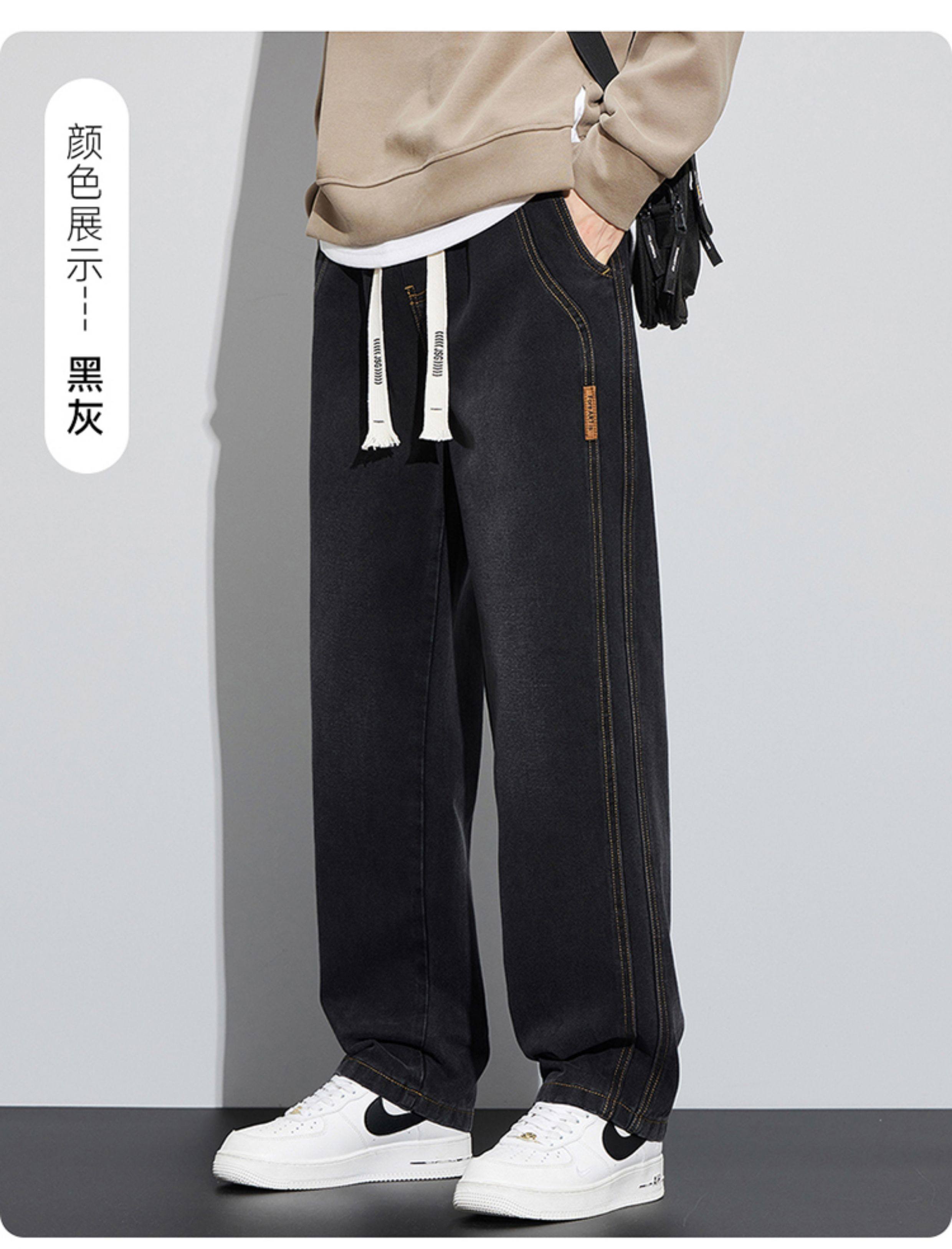 真維斯寬鬆直筒牛仔褲男秋冬季水洗復古美式潮牌黑色加絨休閒褲子