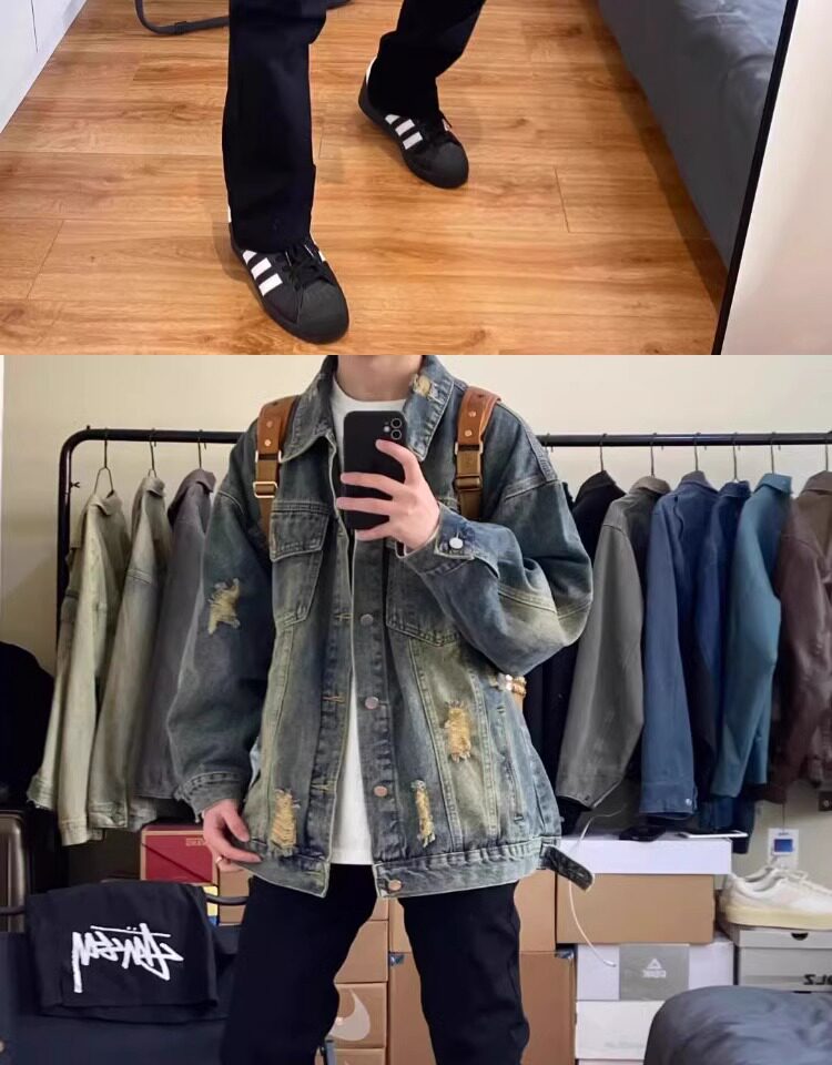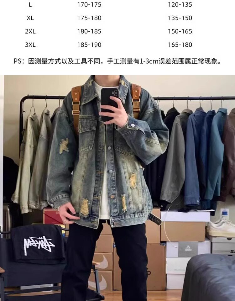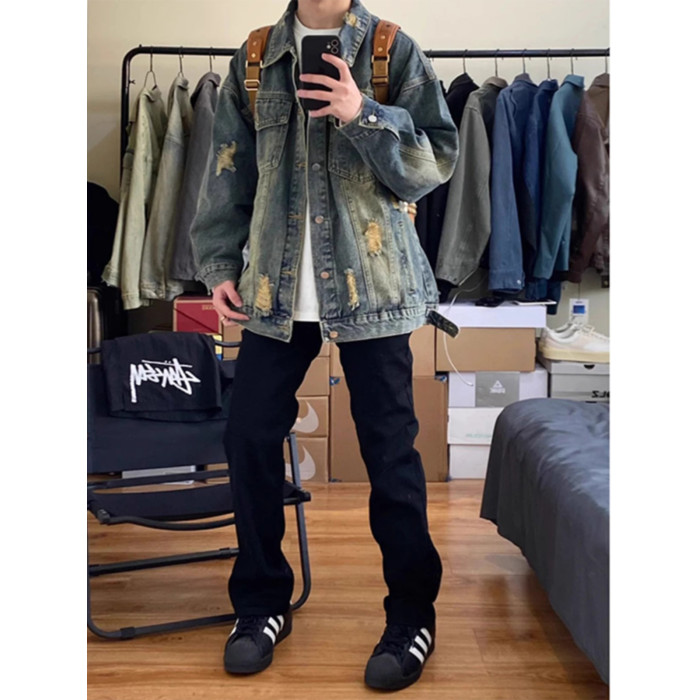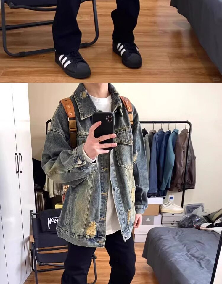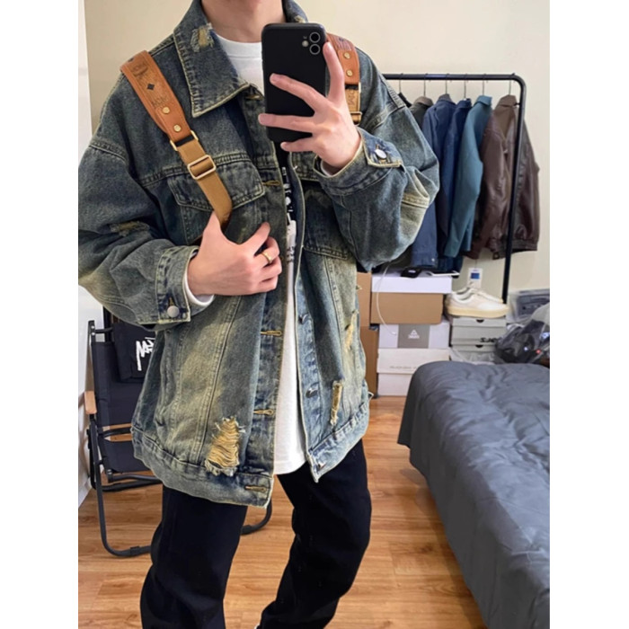 藍色破洞牛仔外套男春秋款美式高街痞帥水洗做舊高級感工裝夾克